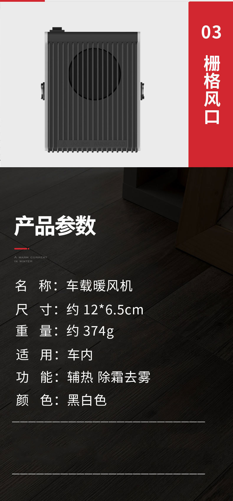 【产品特点】:大面积出风口,迅速暖和,耐高温,180度旋转,方便实用