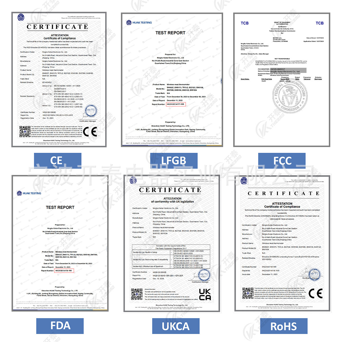 有 CE-RED、FCC-ID、FDA、LFGB、RoHS 2.0、UKCA-RED 证书