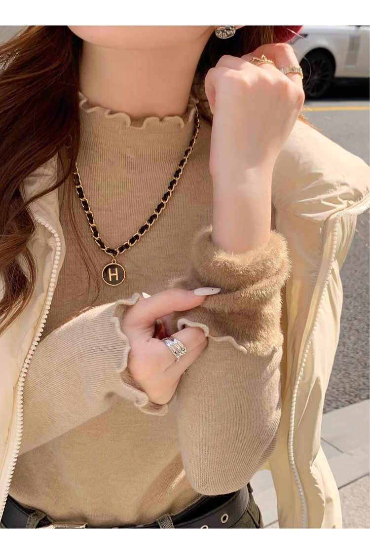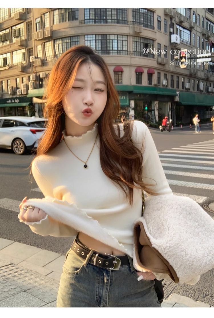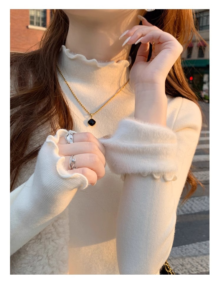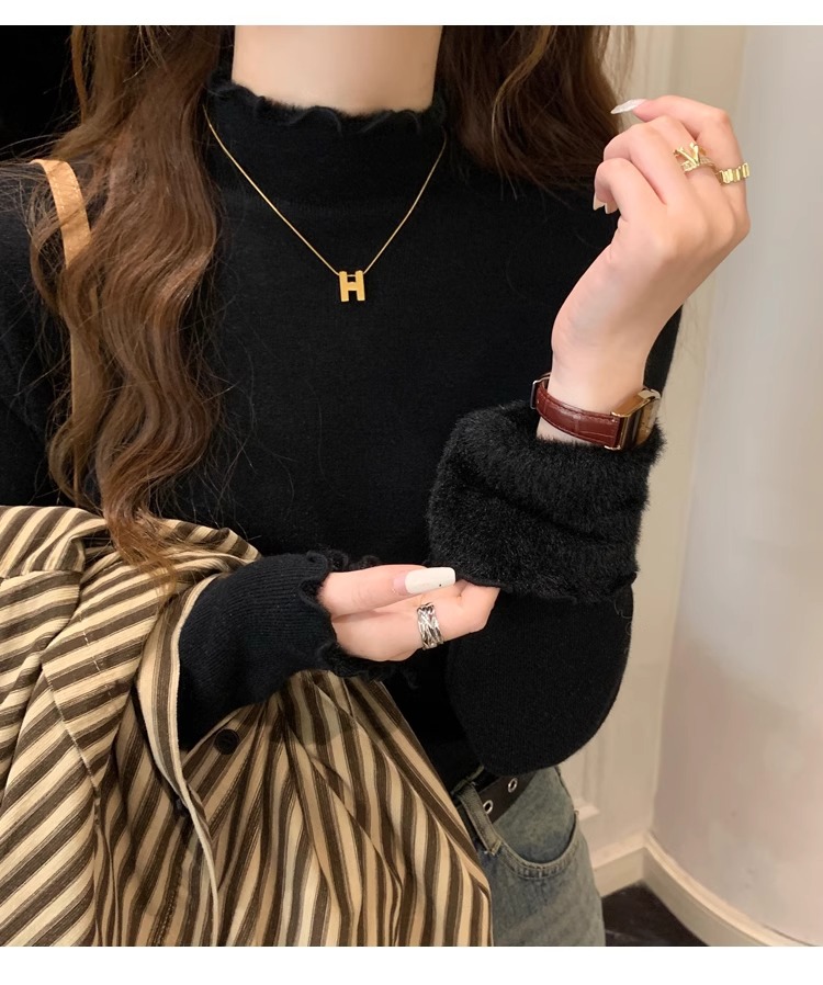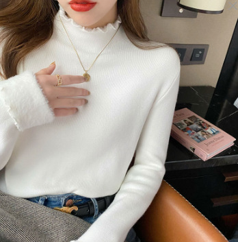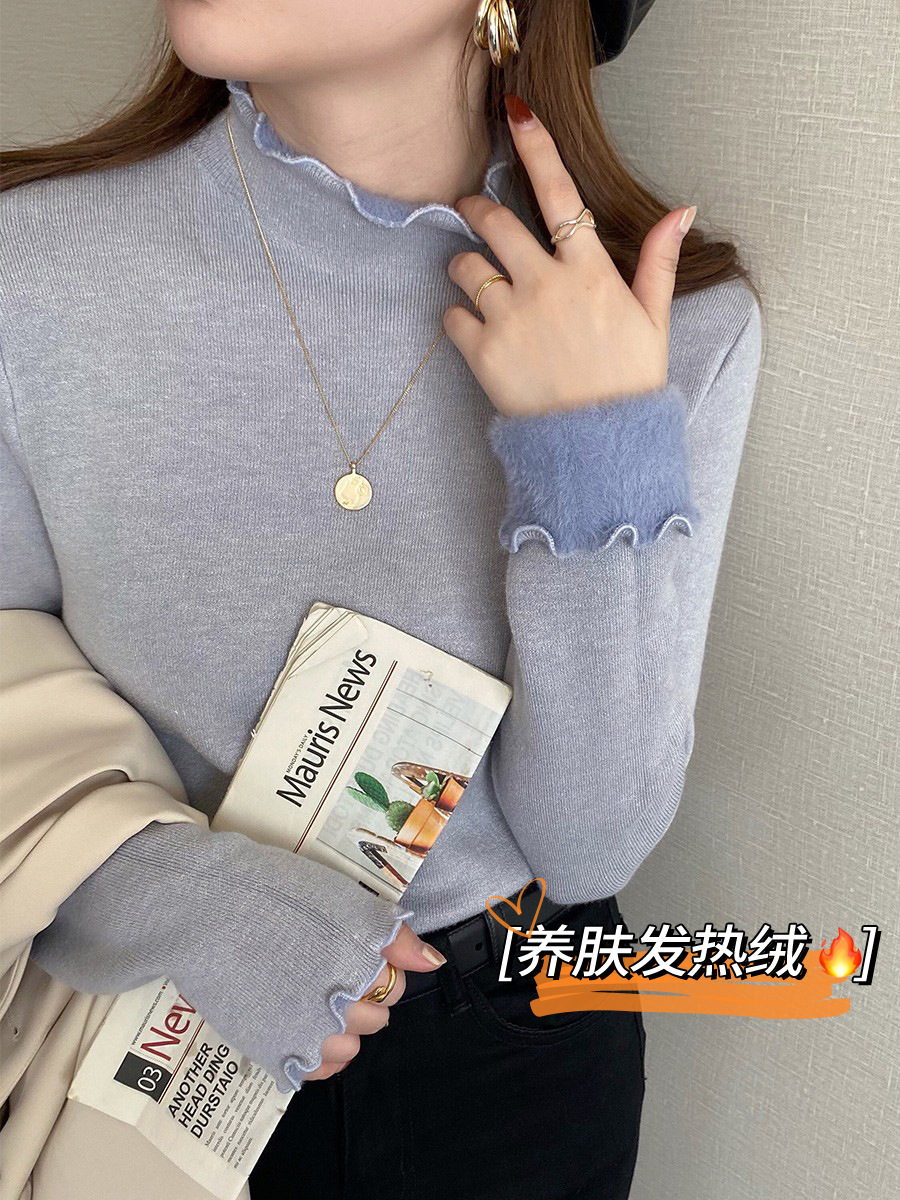 스웨터 여성의 가을과 겨울 2023 새로운 폭발 흰색 내부 기모 베이스 셔츠 하프 하이 칼라 귀 니트 탑