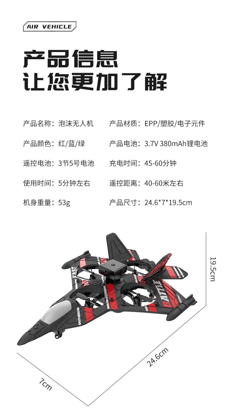 功能描述:本产品为泡沫机身四轴无人机,有常规款、感应避障款、高清摄影款三款配置,配置遥控器可以控制前进、后退、上升、下降、左右转、左右侧飞,无头模式,一键返航,空中悬停,快慢速切换功能,360°特技翻滚。感应避障款,拥有感应避障功能,四个方向带避障感应,防止飞行过程中撞到障碍物。高清摄影款配置高清航拍摄像头,遥控器配置手机支架,可以操作无人机实时进行拍照录像,并且通过APP下载到手机里面。