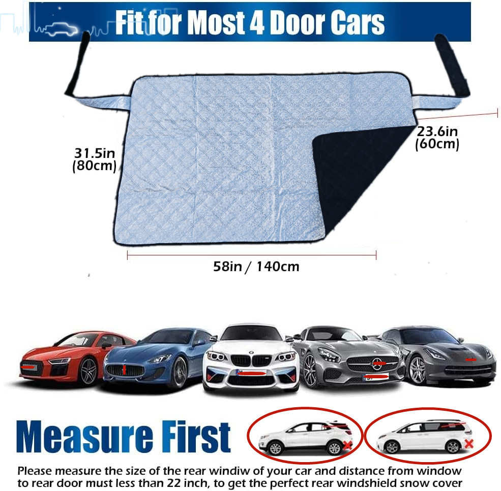 • 【驾驶前的一步】如果您使用汽车挡风玻璃防雪罩,无需除雪、冰或霜冻,则在冬季开始驾驶前将其从挡风玻璃上取下是唯一的一步。 雪罩的尺寸约为 58 英寸(长 ) * 31.5 英寸(宽),适合大多数轿车、房地产车等。 购买前请测量您的后挡风玻璃尺寸。