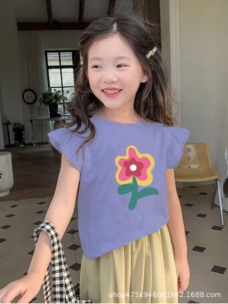 도매 크로스 보더 중소 소녀 외국 스타일 인쇄 순면 소형 플라이 슬리브 탑 여름 소녀 아기 얇은 티셔츠스토어 가기