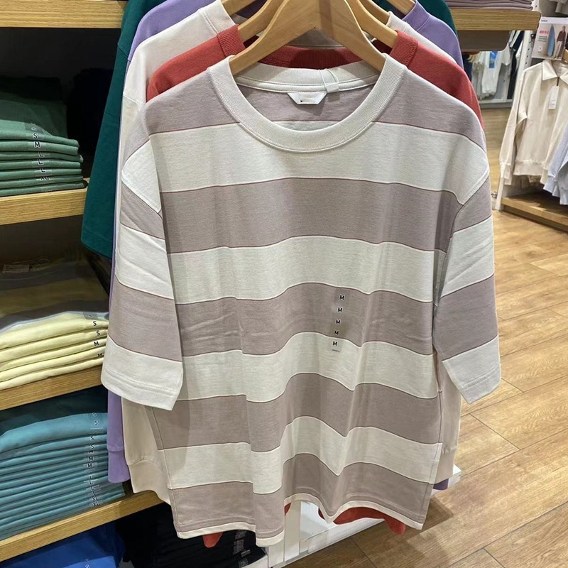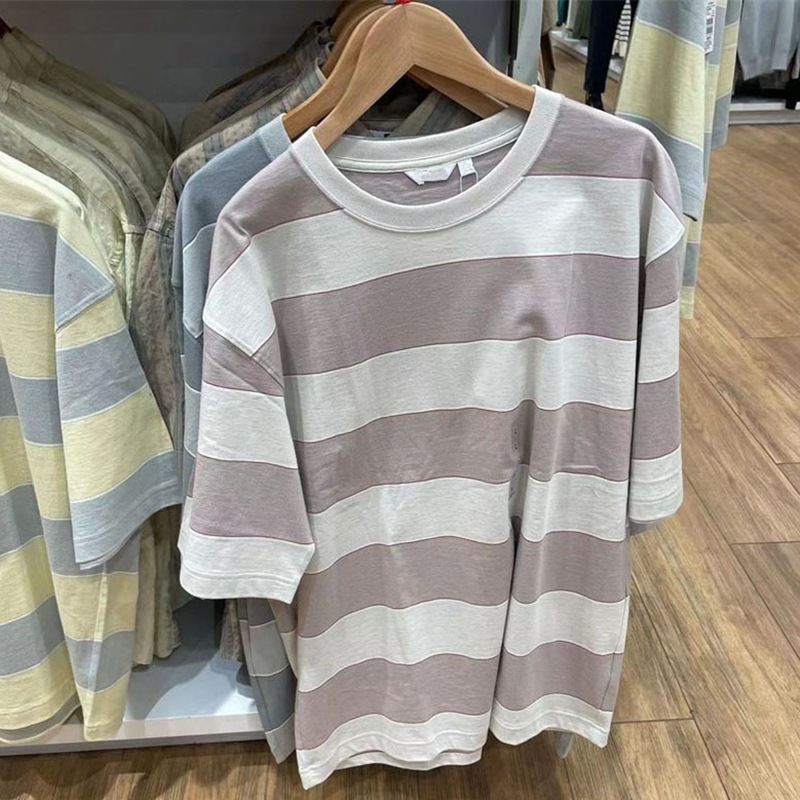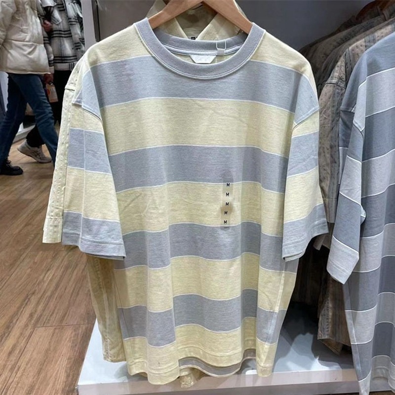 일본 싱글 U 홈 2023 여름 새로운 남성과 여성 캐주얼 느슨한 스트라이프 라운드 넥 반소매 커플 457714 티셔츠스토어 가기
