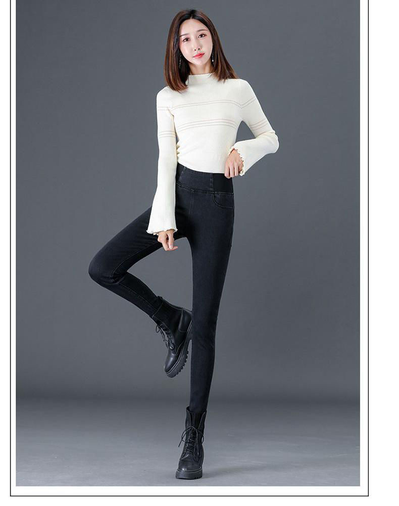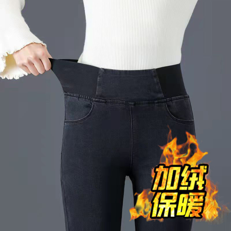 기모 신축성있는 허리 청바지 여성의 가을과 겨울 하이 웨이스트 슬리밍 플러스 사이즈 겉옷 배꼽 턱걸이 연필 바지스토어 가기