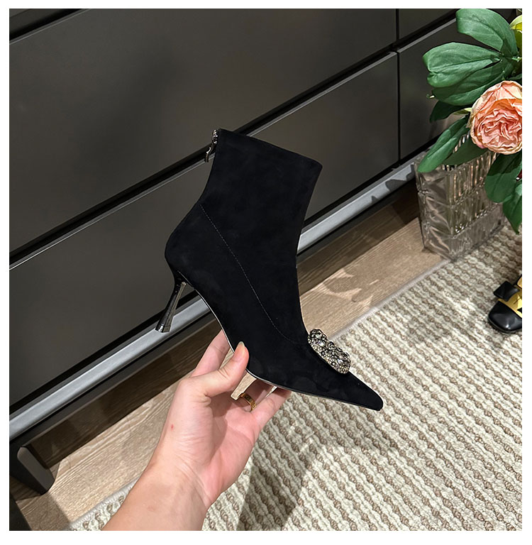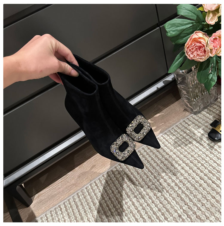 프렌치 스타일 뾰족코 숏부츠 여성용, 큐빅 장식 사각 버클, 얇은 굽, 신축성 있는 슬림 부츠, 2025 가을 겨울 신상 양털 하이힐 부츠스토어 가기