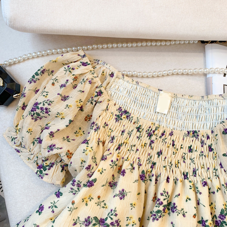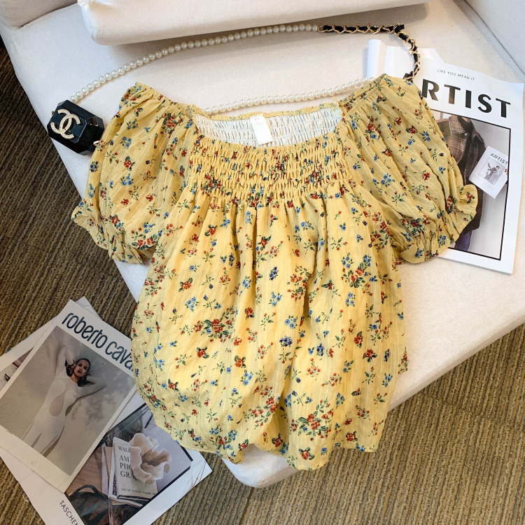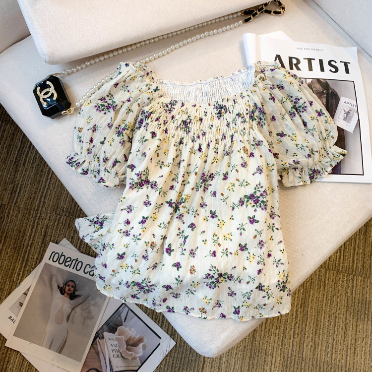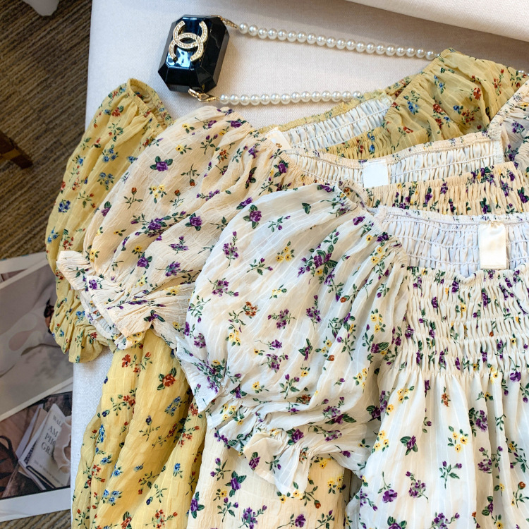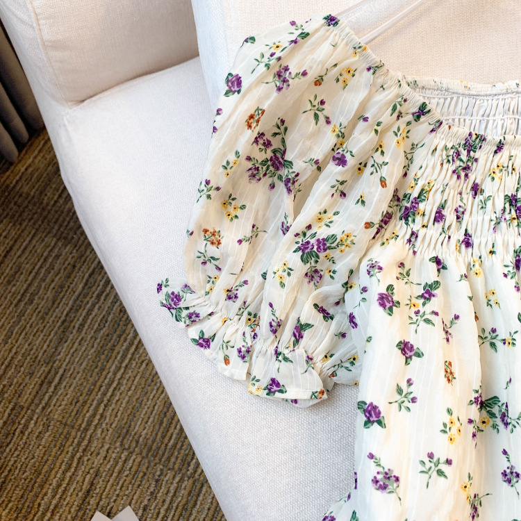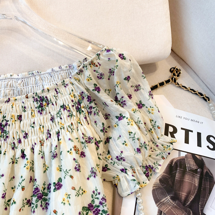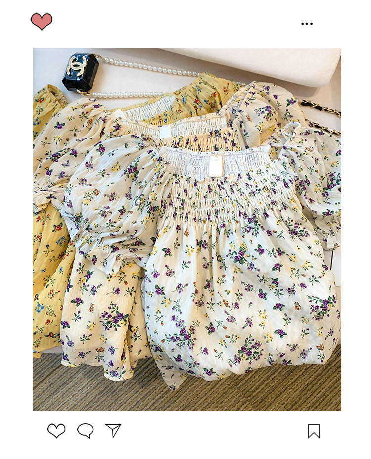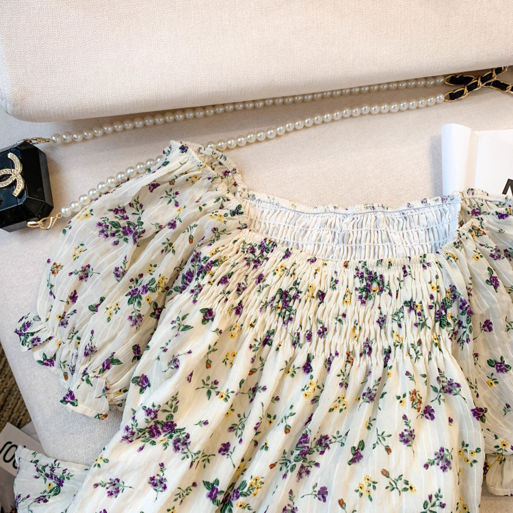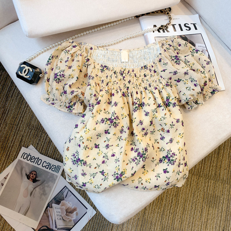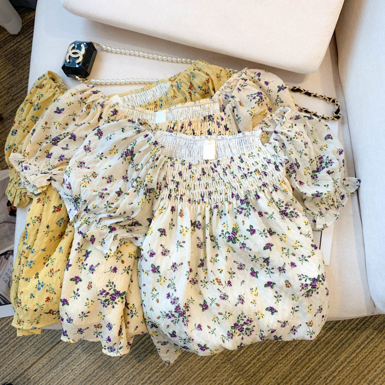 실제 샷 재고 여름과 가을 새로운 세련된 플로럴 쉬폰 셔츠 오프 숄더 오프 숄더 스위트 탑