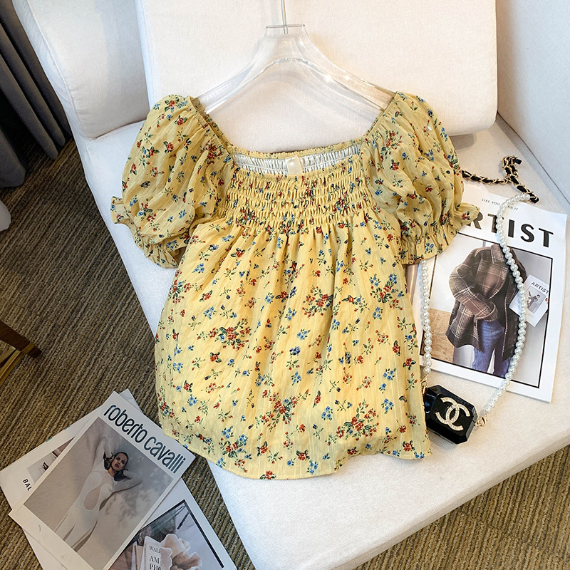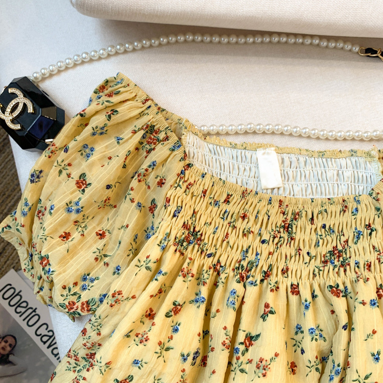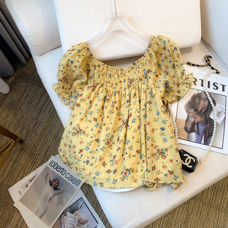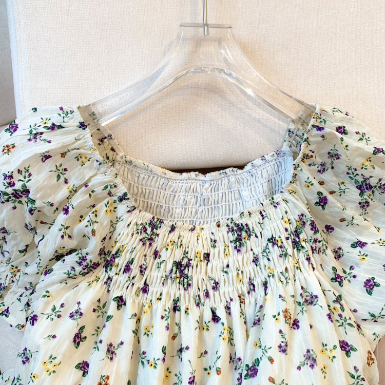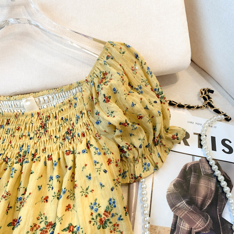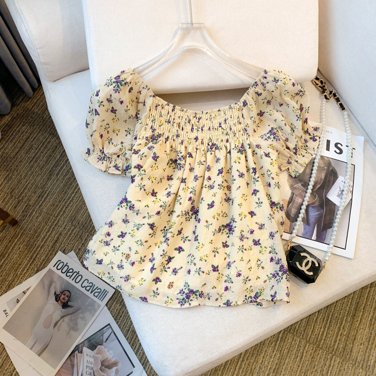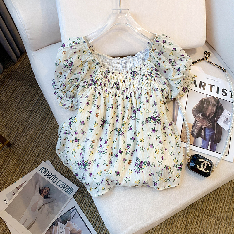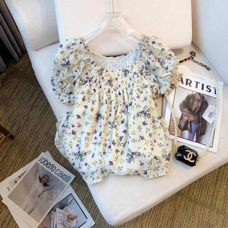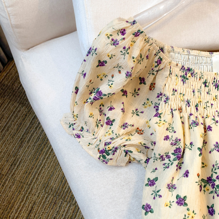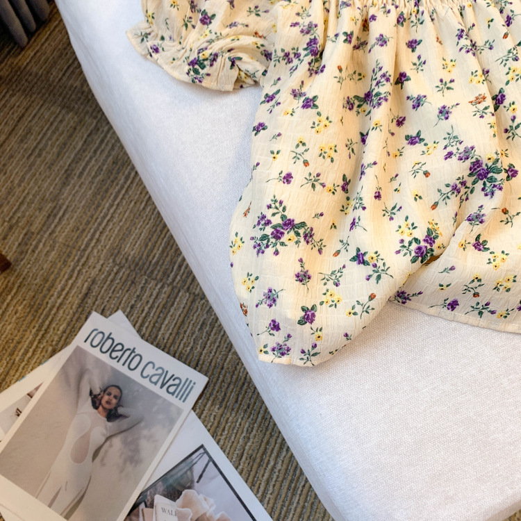 실제 샷 재고 여름과 가을 새로운 세련된 플로럴 쉬폰 셔츠 오프 숄더 오프 숄더 스위트 탑