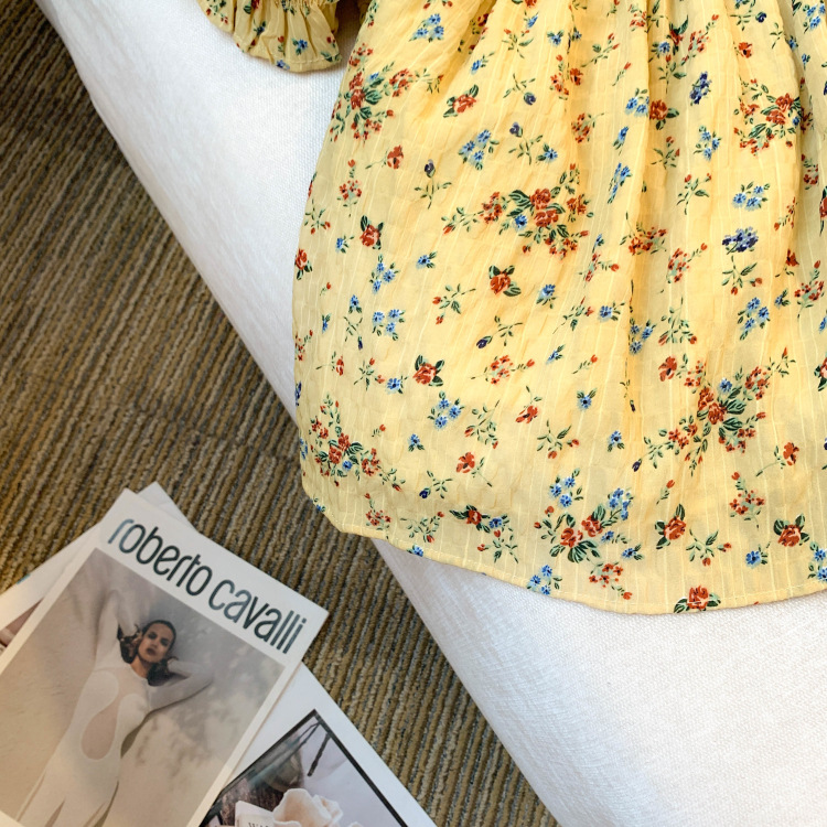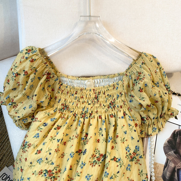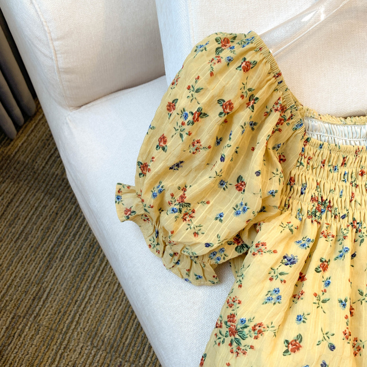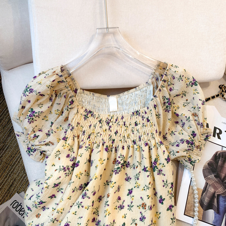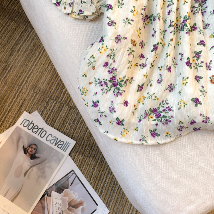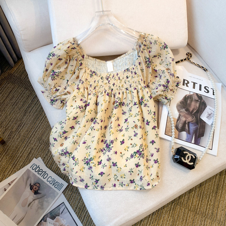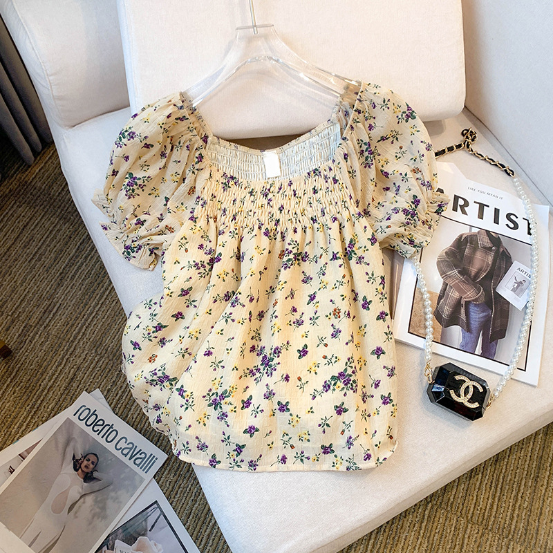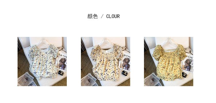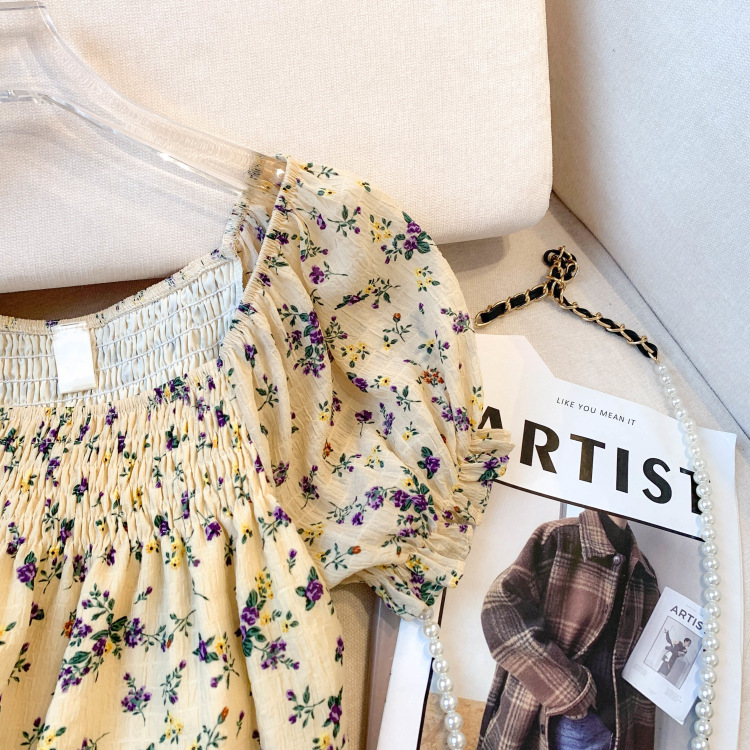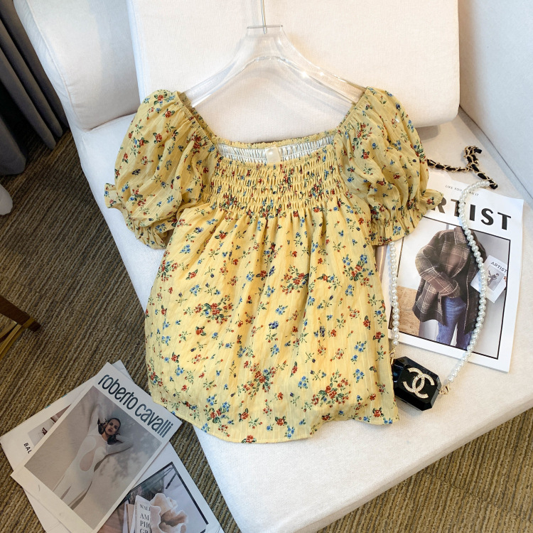 실제 샷 재고 여름과 가을 새로운 세련된 플로럴 쉬폰 셔츠 오프 숄더 오프 숄더 스위트 탑