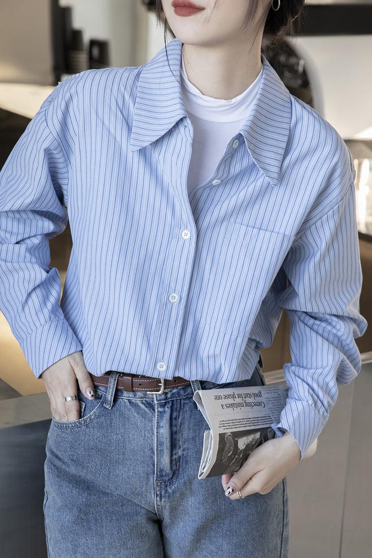 2023 진짜 샷 새로운 줄무늬 셔츠 여성의 가을 전문 인터뷰 디자인 감각 틈새 홍콩 스타일 캐주얼 루즈 탑스토어 가기