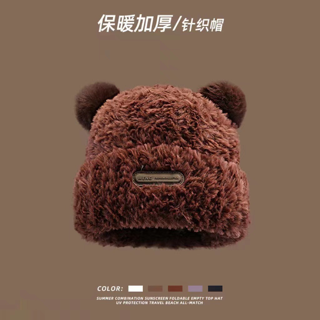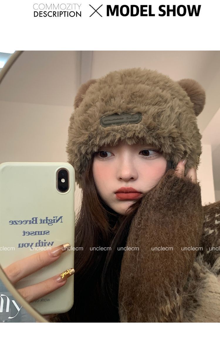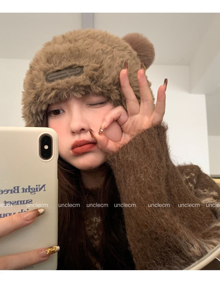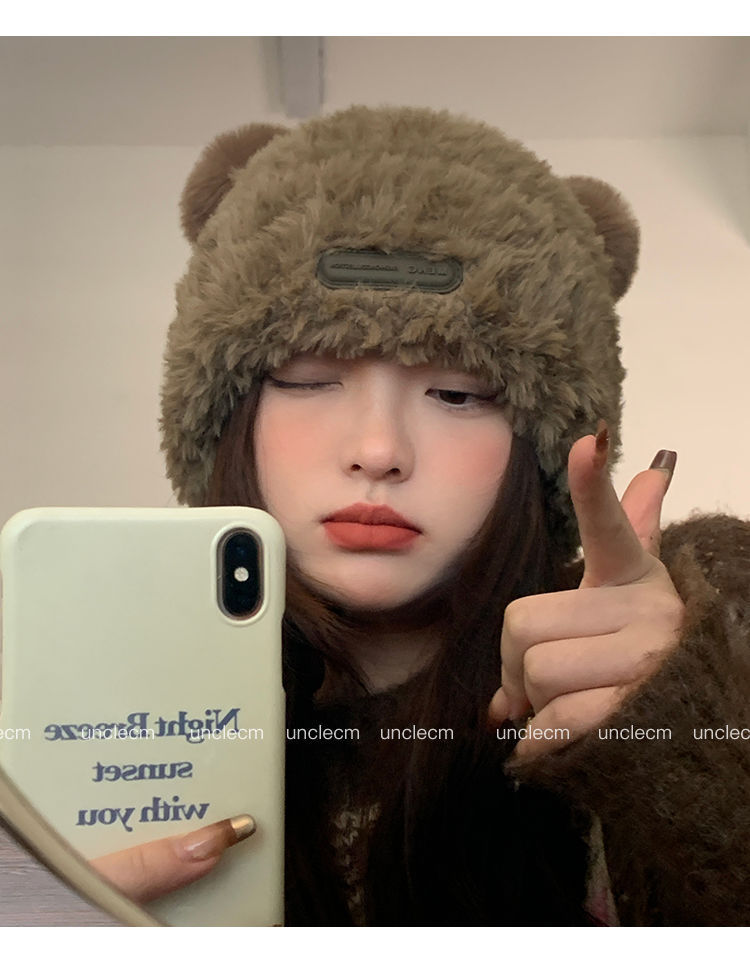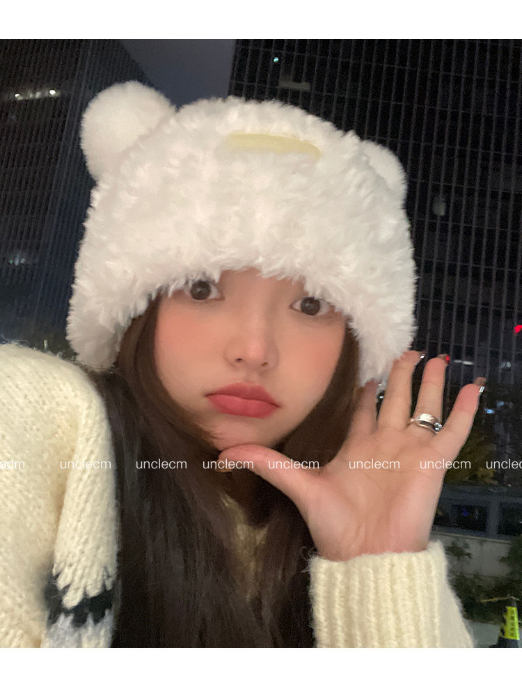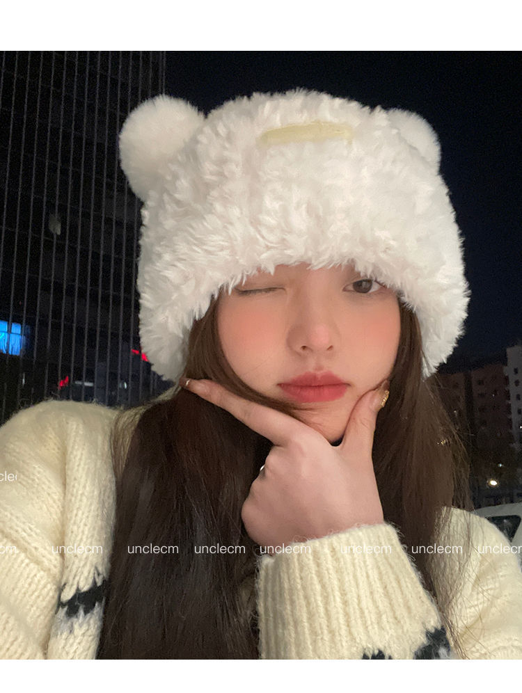 가을 겨울용 귀여운 곰돌이 모양의 여성용 모직 플러스 벨벳 모자, 인터넷 인기 따뜻한 큰 챙 두꺼운 귀 보호 플러시 모자스토어 가기