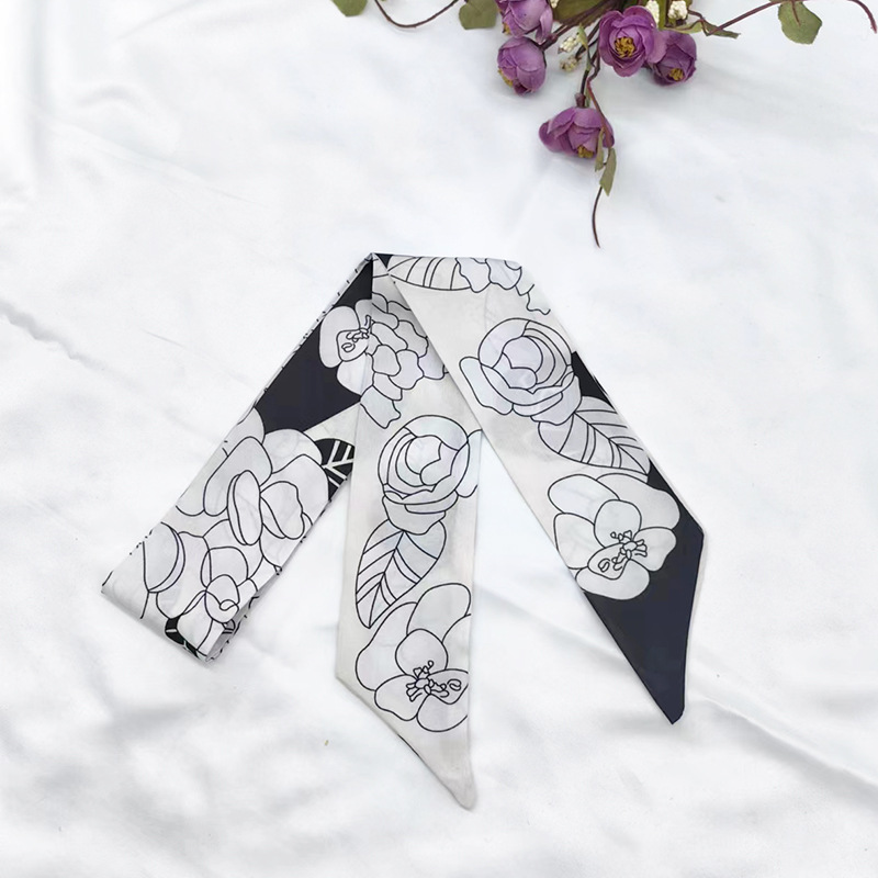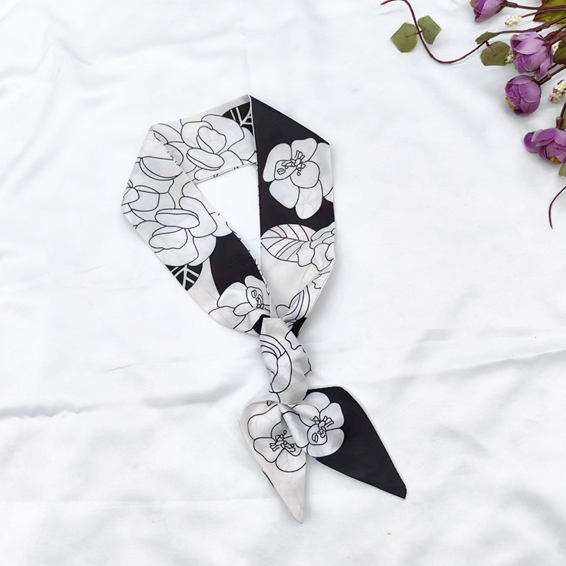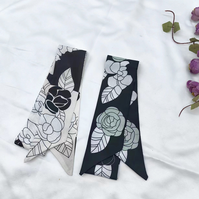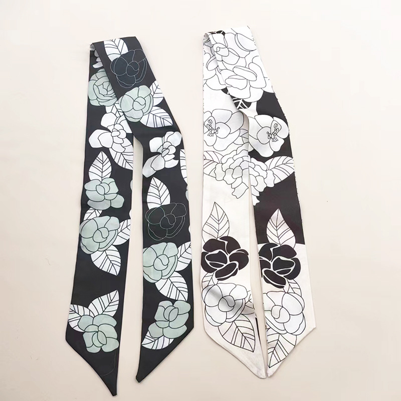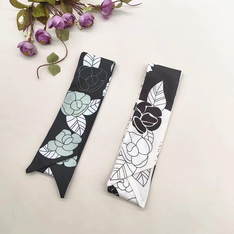 실키 롱 실크 스카프 나비 넥타이 헤어 벨트 흑백 동백 꽃 리본 넥타이 가방 동반 선물 작은 스카프 벨트