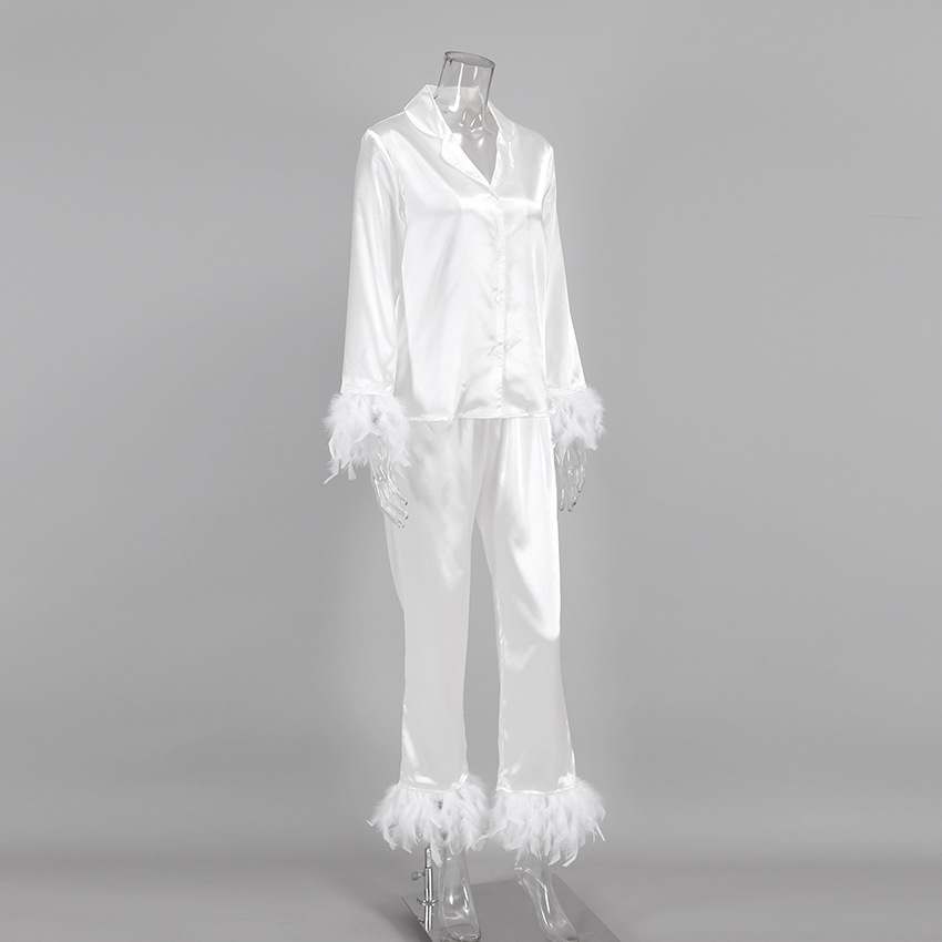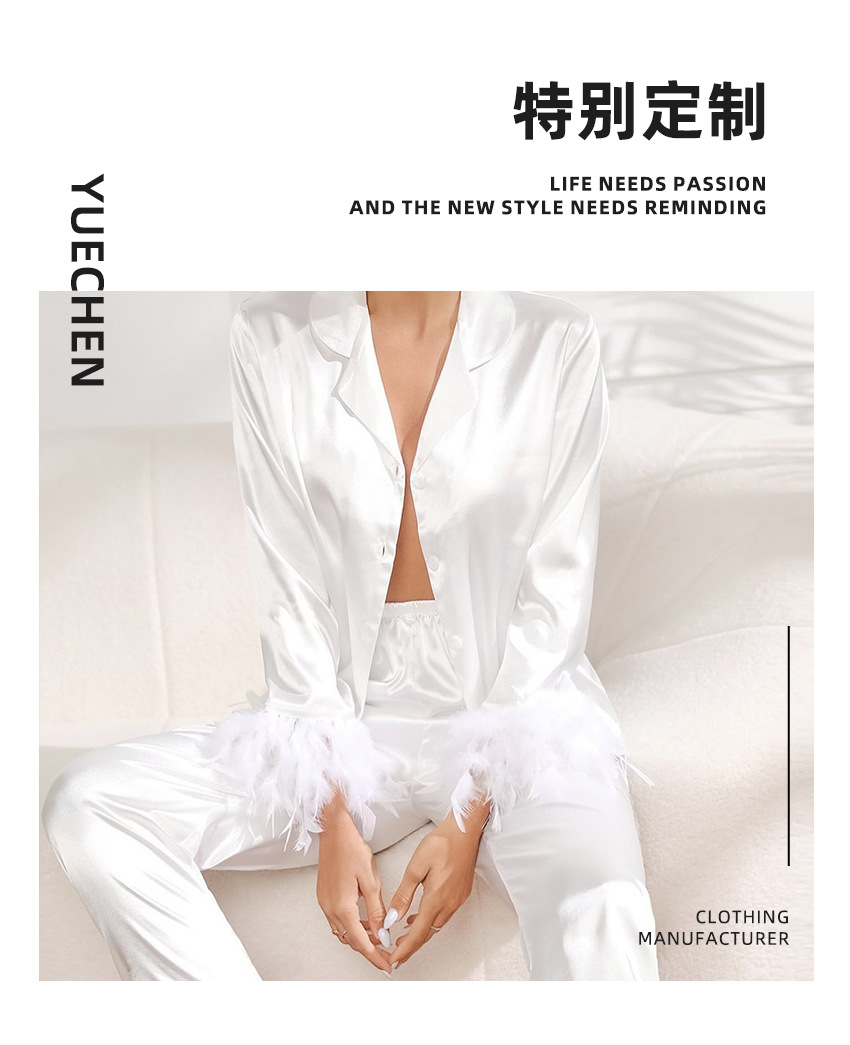 가을과 겨울 새로운 핑크 달콤한 패션 새틴 깃털 편안한 긴팔 바지 파자마 투피스 크로스 보더 홈웨어스토어 가기