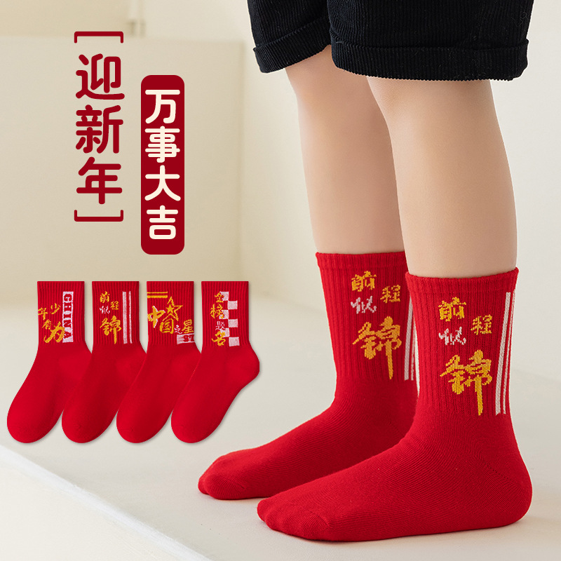 2024 겨울 새해 새 소년 양말 도매 청소년 출생 년 빅 레드 중간 길이 빗질면 양말스토어 가기