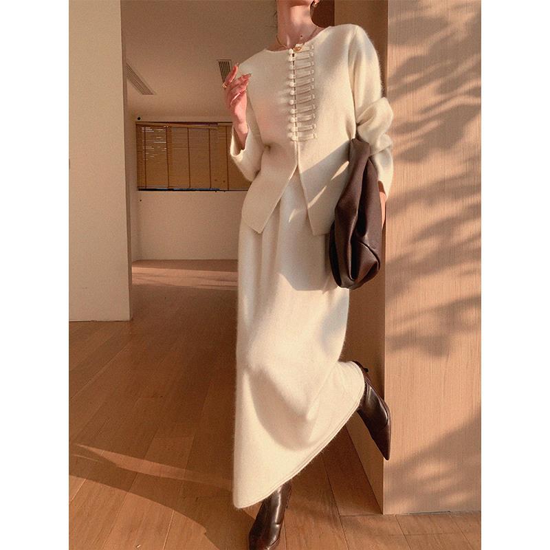 2025년 가을 신상 우아한 베이지색 신중국풍 투피스 여성복, 중국풍 니트 상의와 스커트 세트, 여유로운 스타일스토어 가기