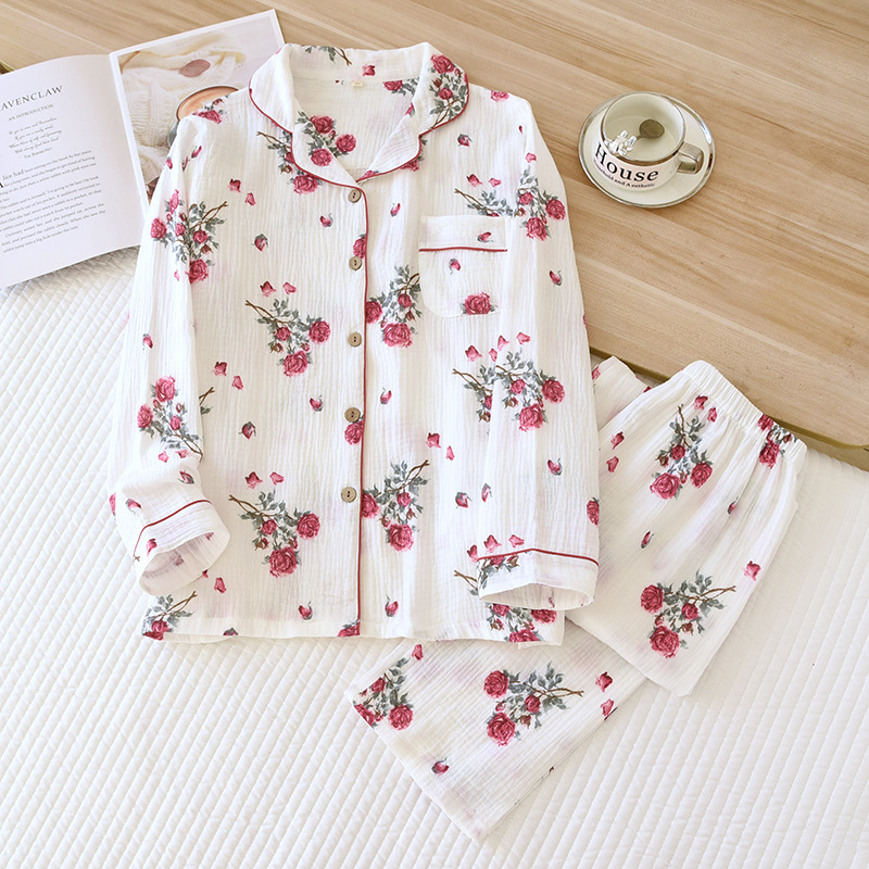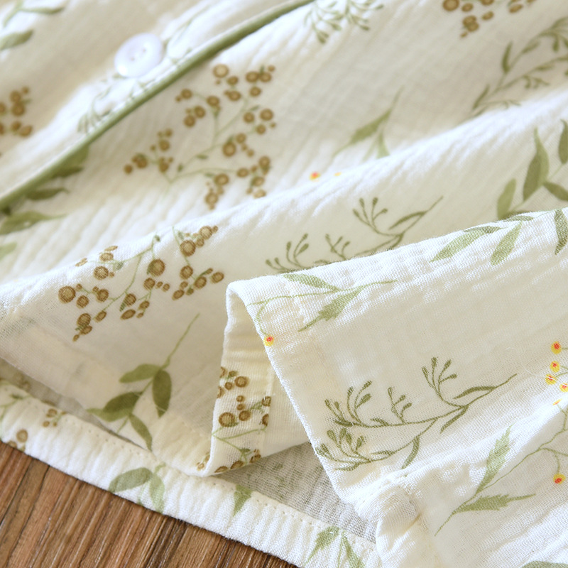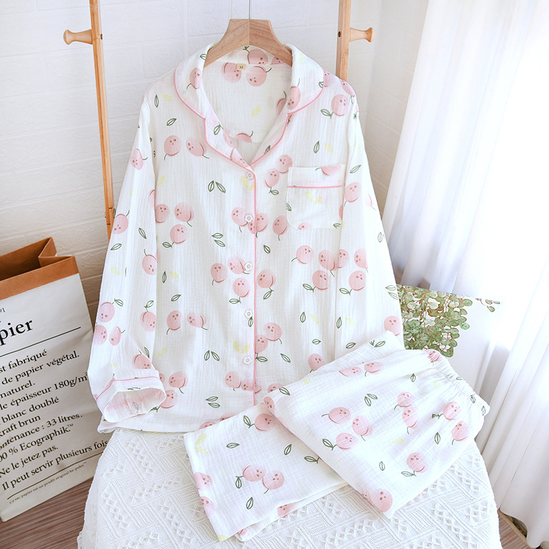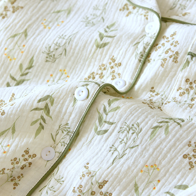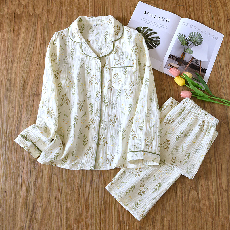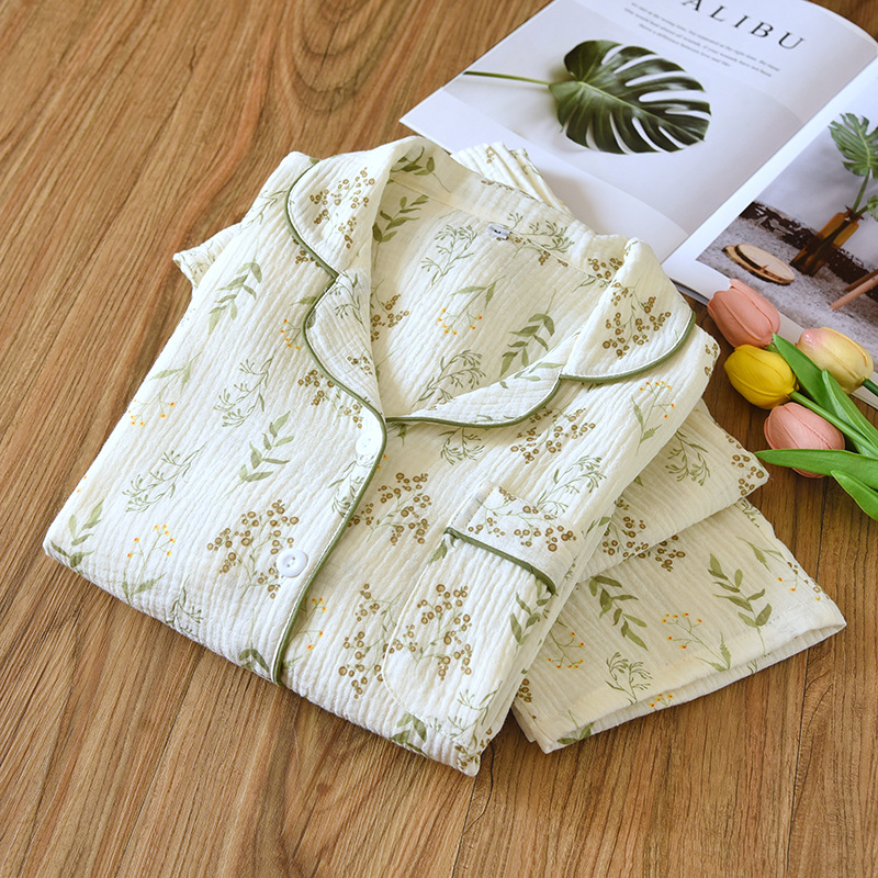 24 새로운 잠옷 여자의 봄과 여름 얇은 면 거즈 크레이프 긴 소매 카디건 면 가정 의류 증가 세트