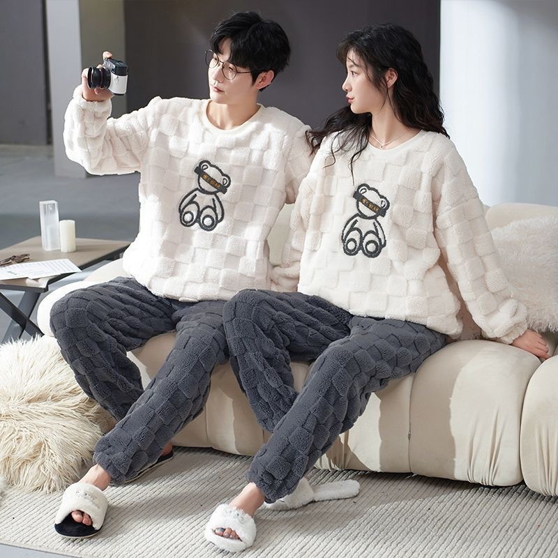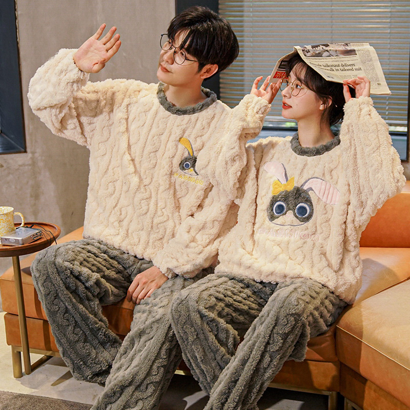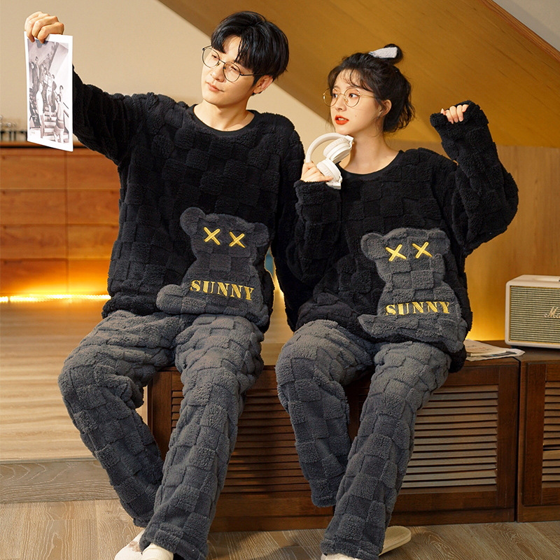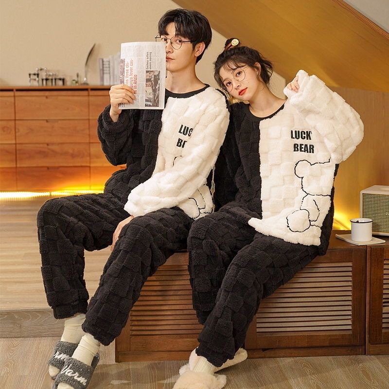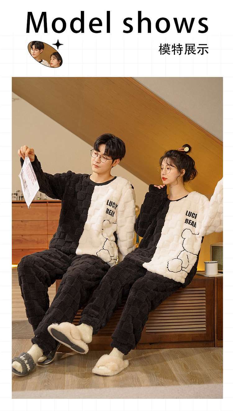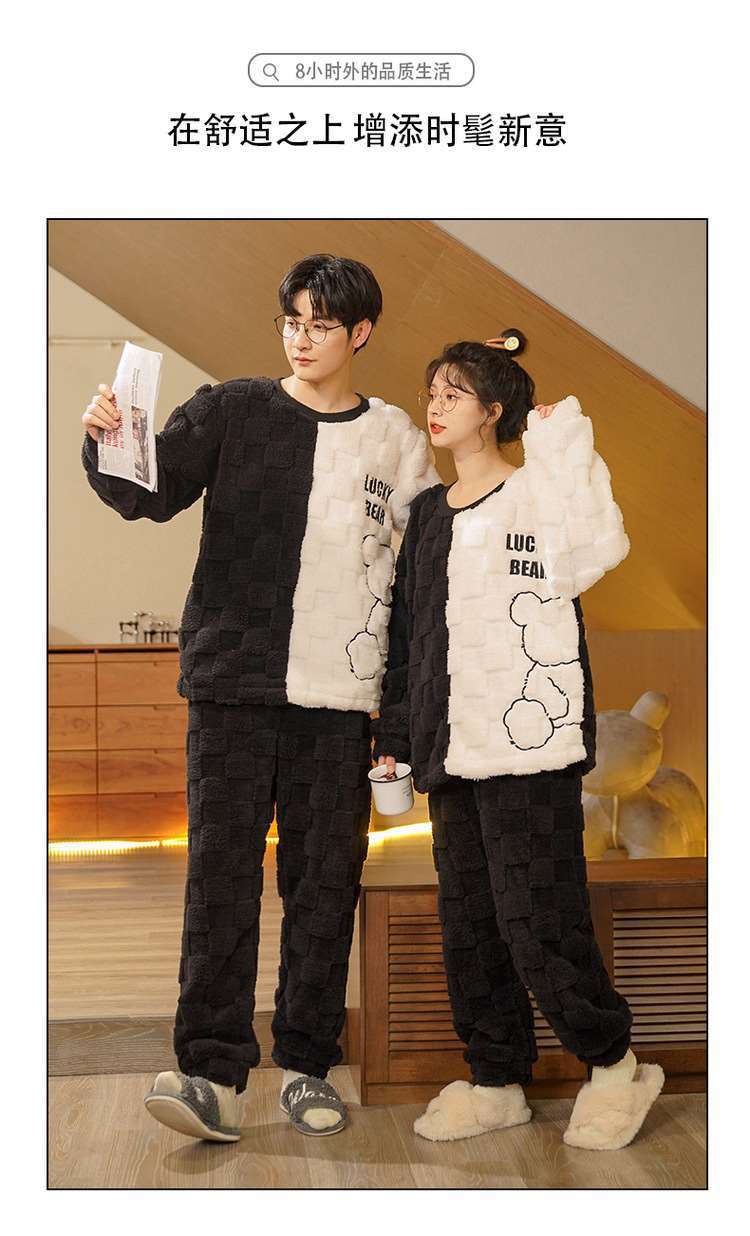 가을과 겨울 봉제 커플 파자마 여성 기모 두꺼운 산호 양털 따뜻한 남성과 여성의 홈웨어 플란넬 세트