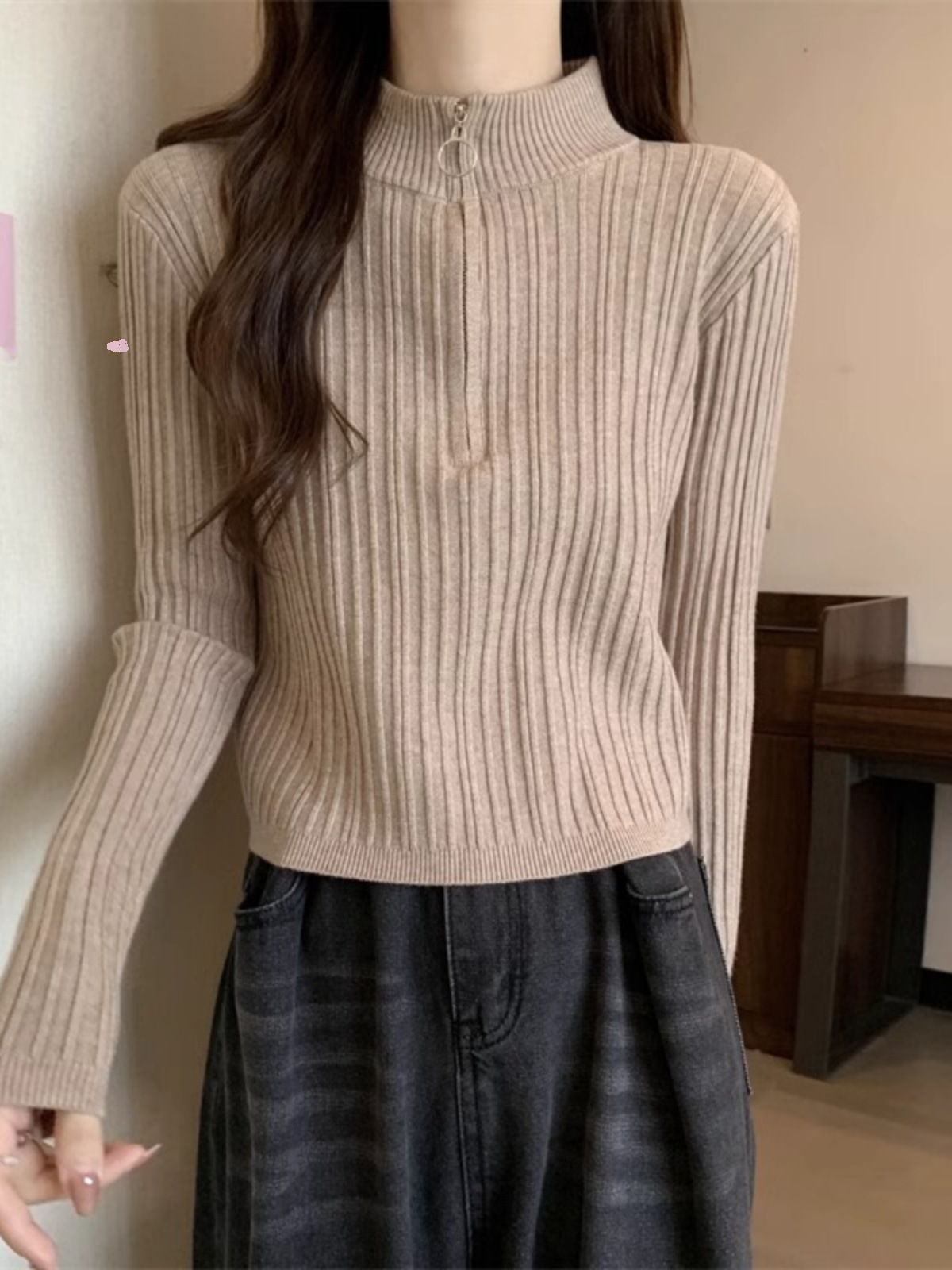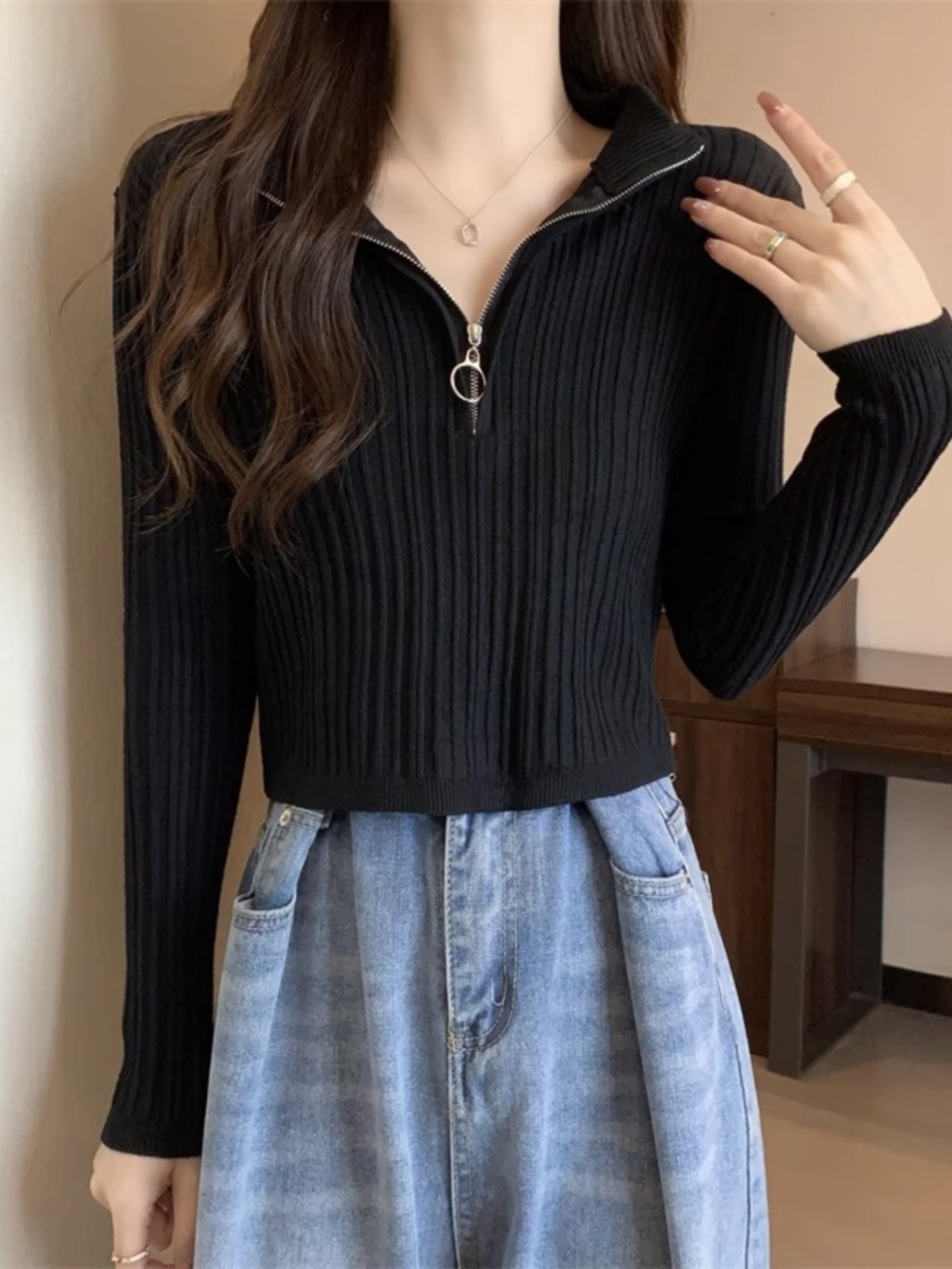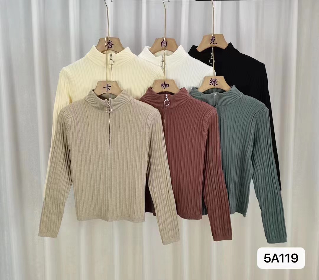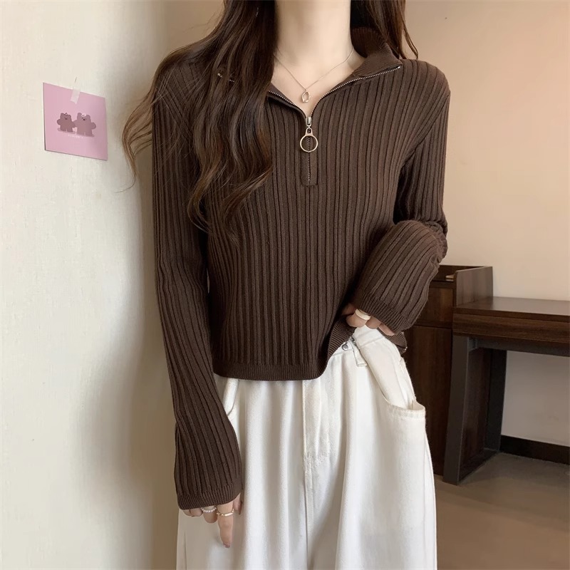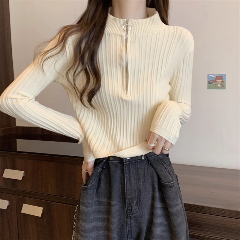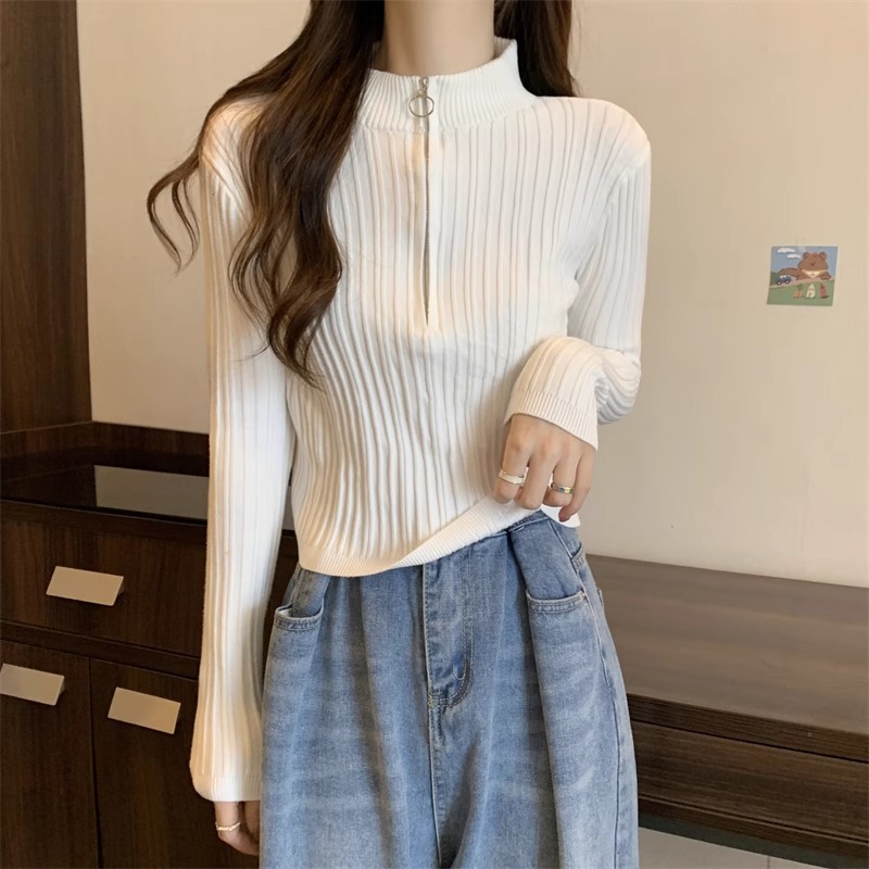 니트 베이스 셔츠 여성용 가을 및 겨울 새로운 도착 작은 스웨터 슬림 핏 독특한 세련된 반 지퍼 짧은 스타일스토어 가기