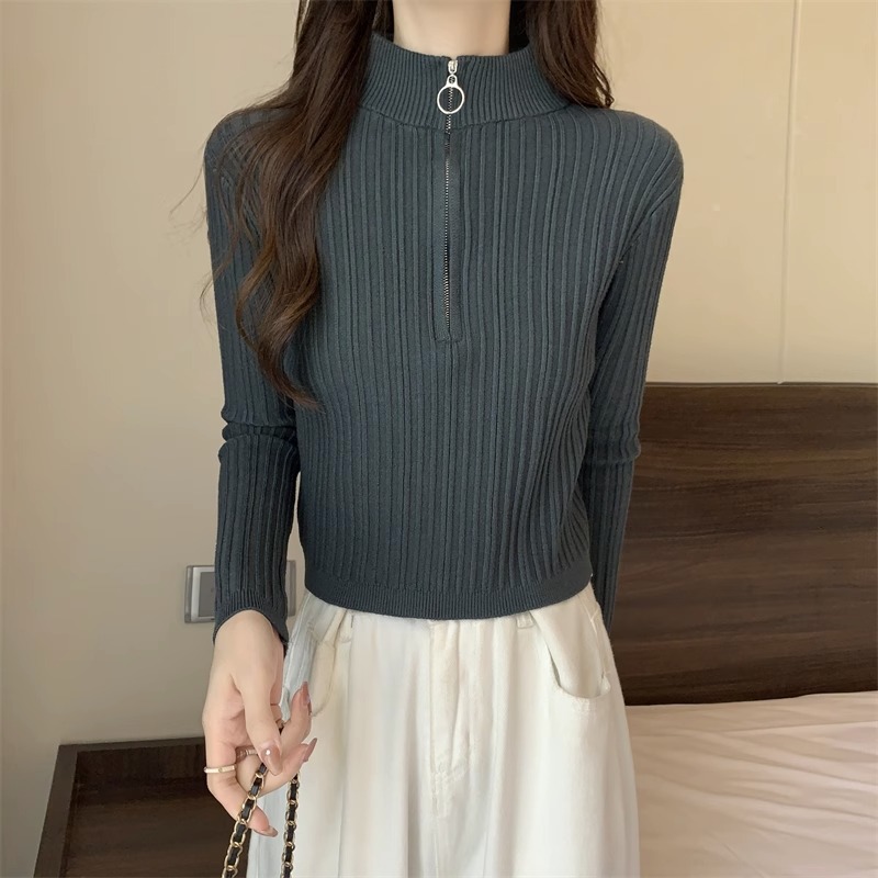 니트 베이스 셔츠 여성용 가을 및 겨울 새로운 도착 작은 스웨터 슬림 핏 독특한 세련된 반 지퍼 짧은 스타일