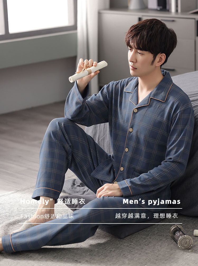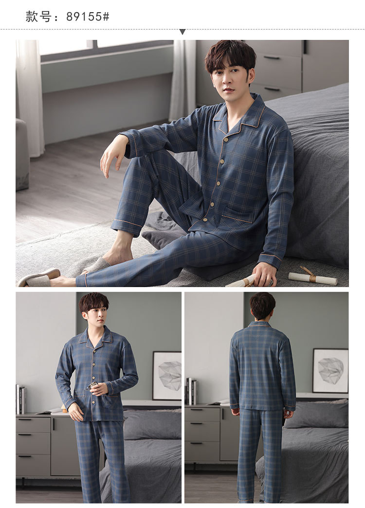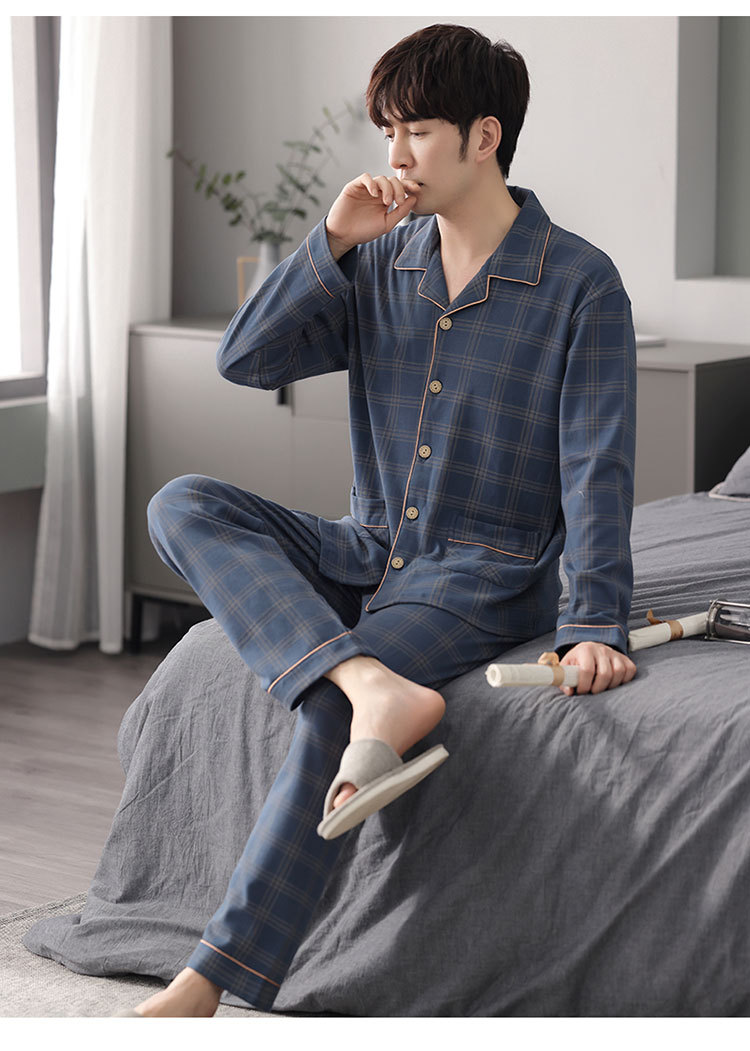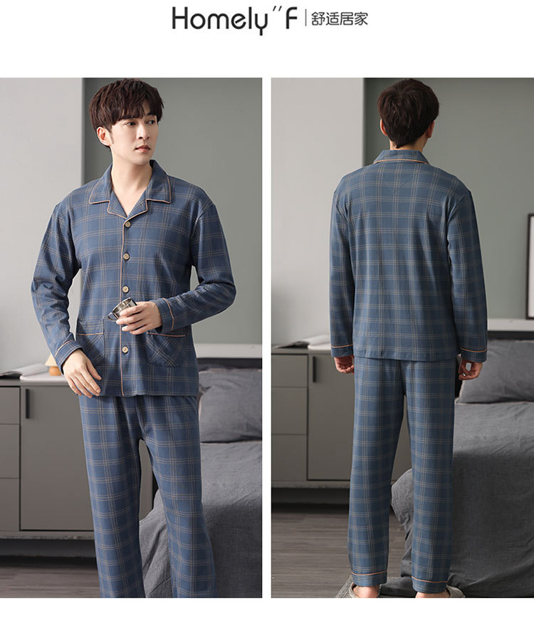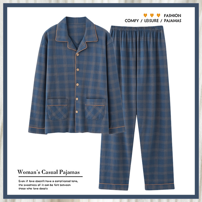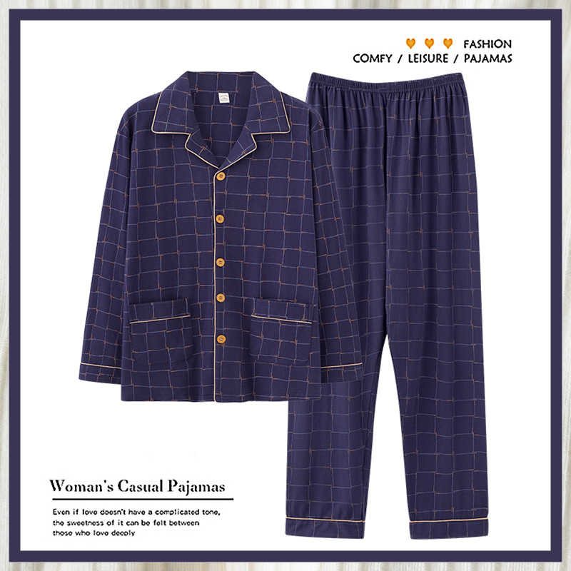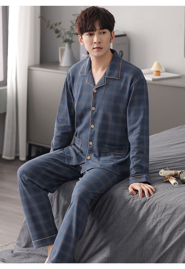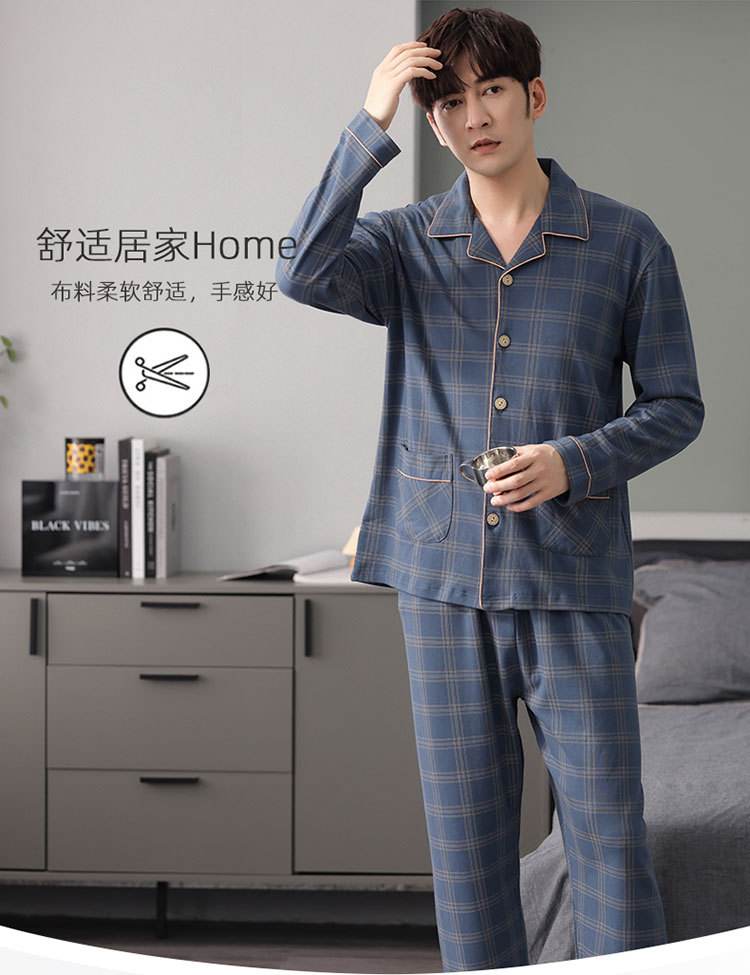 면 파자마 남성 봄과 가을 긴 소매 세트 면 얇은 격자 무늬 플러스 사이즈 간단한 겉옷 가정복 남성스토어 가기