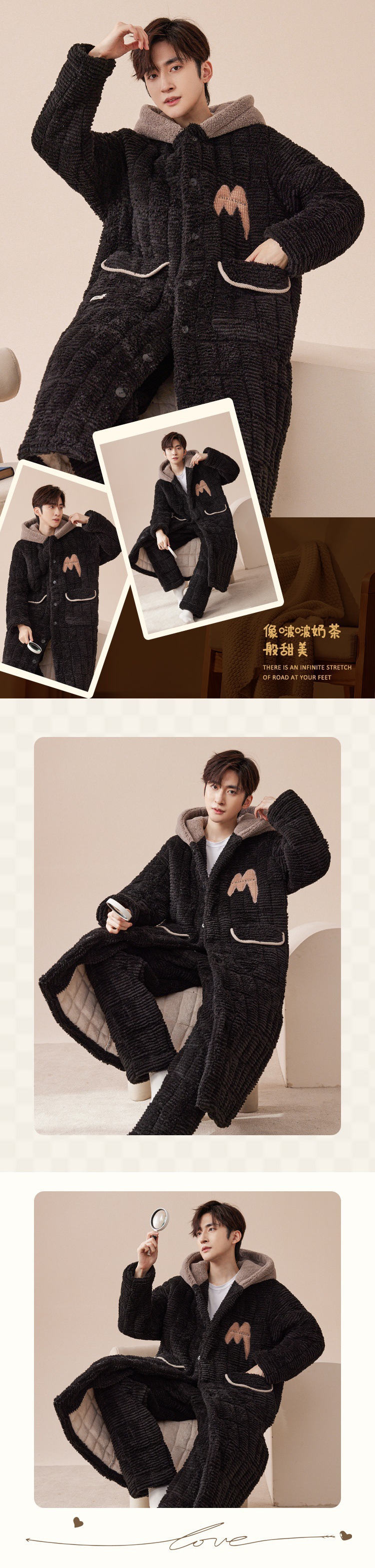 2023直播抖音爆款珊瑚绒夹棉睡袍睡衣男青年冬季保暖家居服套装