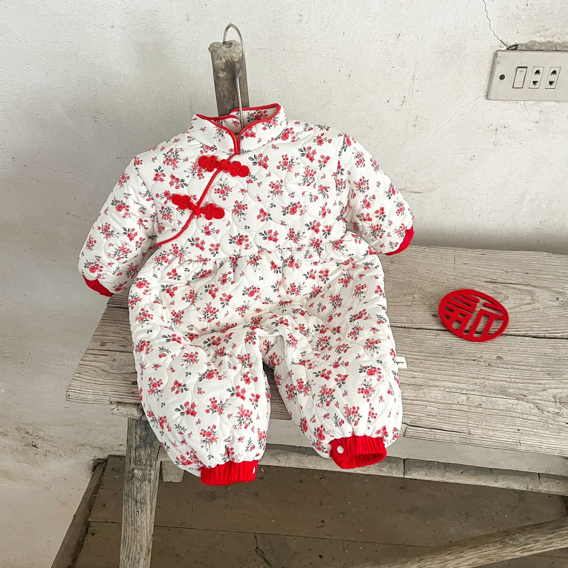 소녀 아기 겨울 탕 스타일 기모 면화 된 점프 수트 등반 세트 중국 스타일 꽃 두꺼운 따뜻한 옷