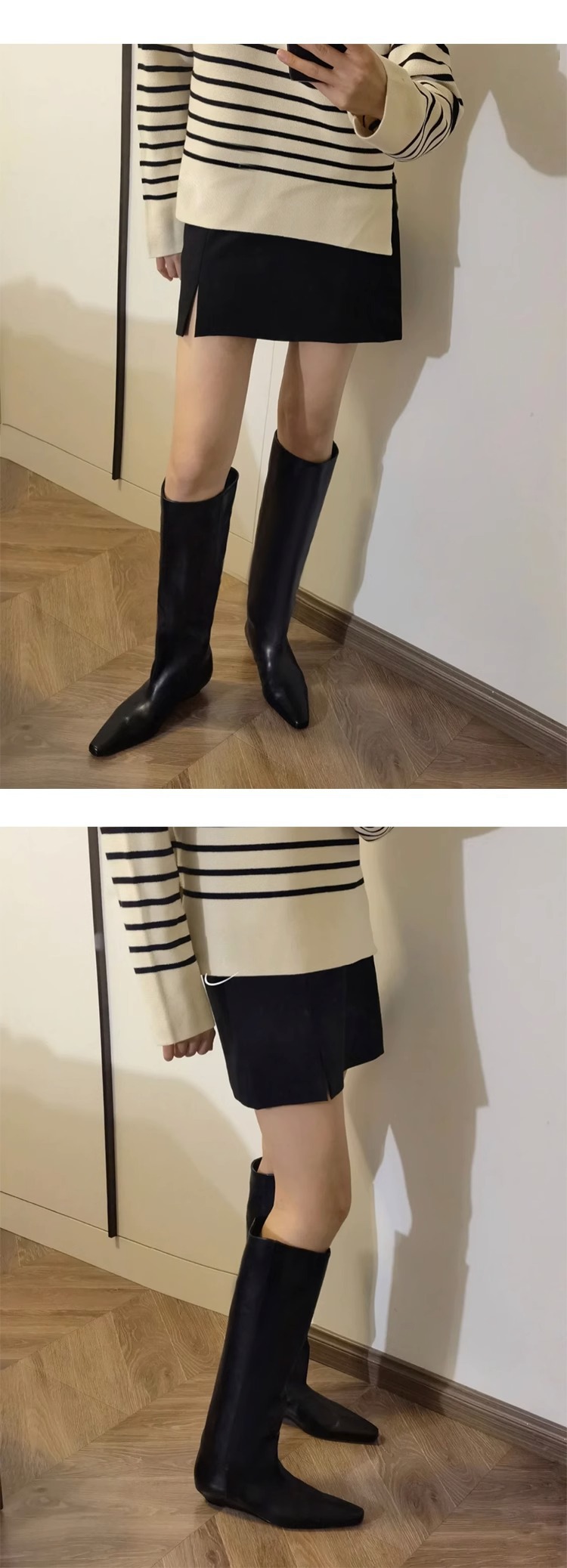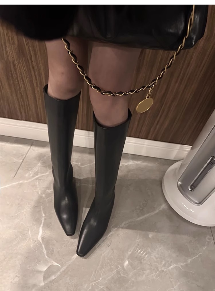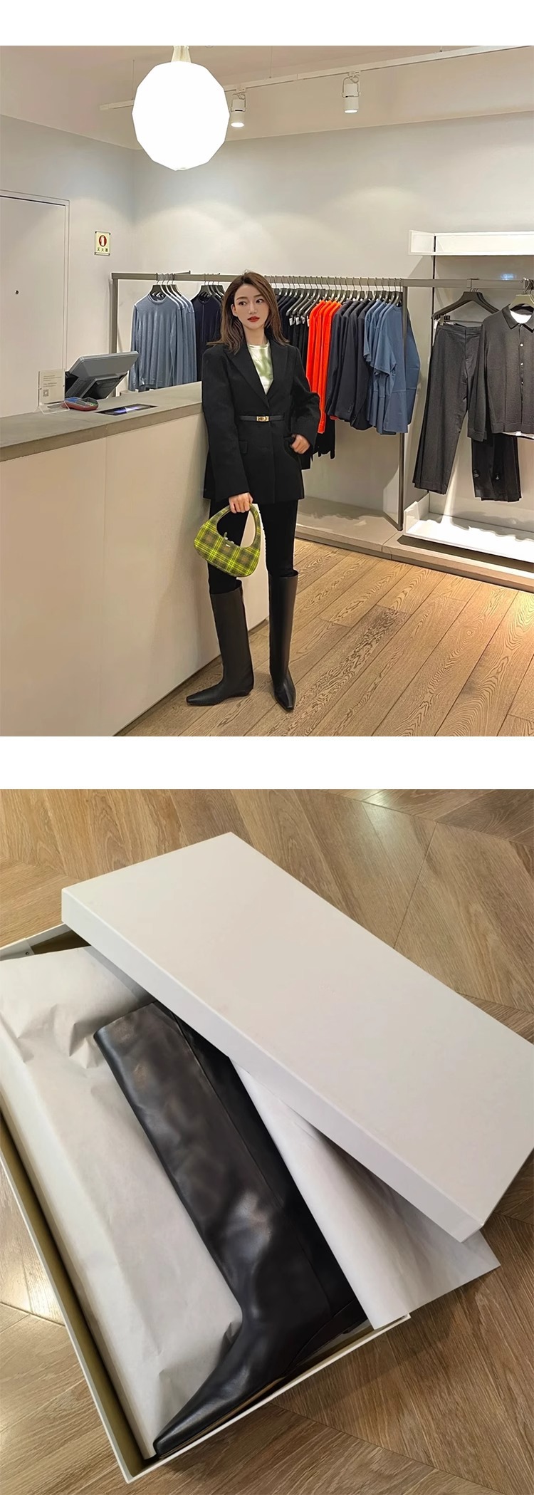 Cowhide 버전 ~ 통통녀 정품 가죽 뾰족한 복고풍 하이 탑 나이트 부츠 여성용 청키 힐 가죽 힐 슬리밍 무릎 길이 부츠스토어 가기