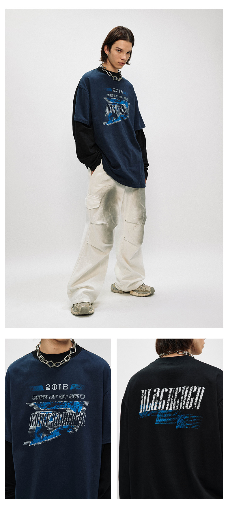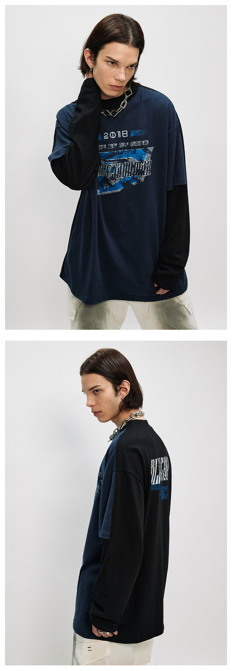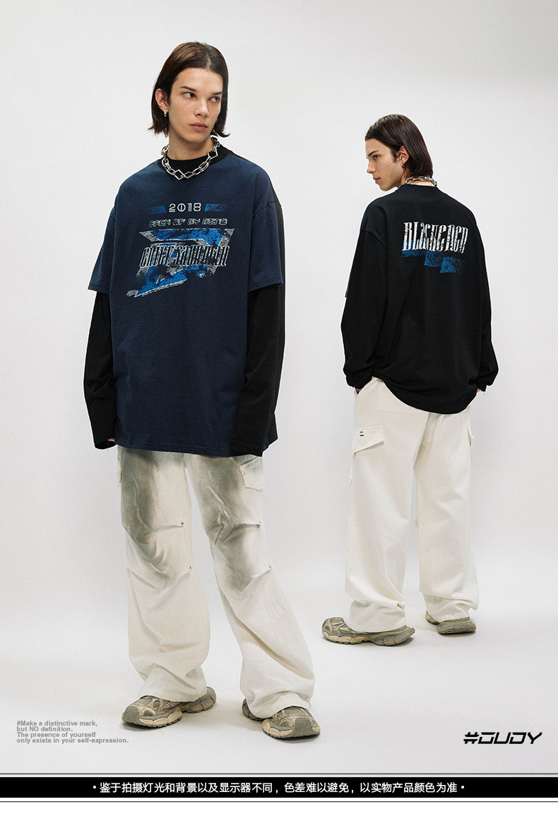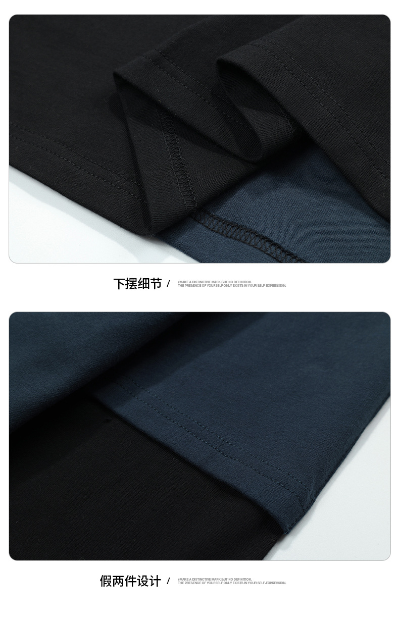 # OVDY 봄 여름 신상품 페이크 투피스 셔츠 순면 루즈핏 작은 칼라 트렌디 브랜드 긴팔 티셔츠 남성용