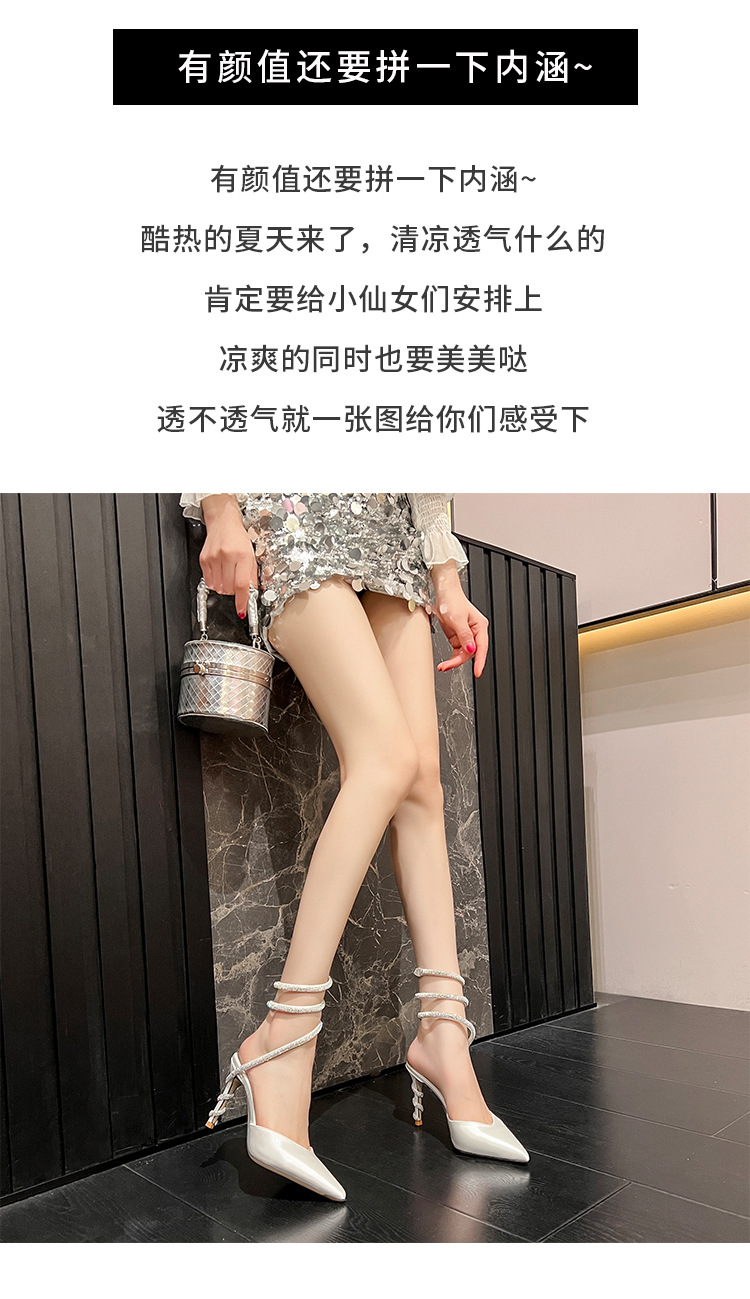 Baotou 샌들 여성 여름 유럽과 미국의 섹시한 뱀 랩 라인스톤 스웨이드 뾰족한 하이힐 화이트 새틴 웨딩 슈즈스토어 가기