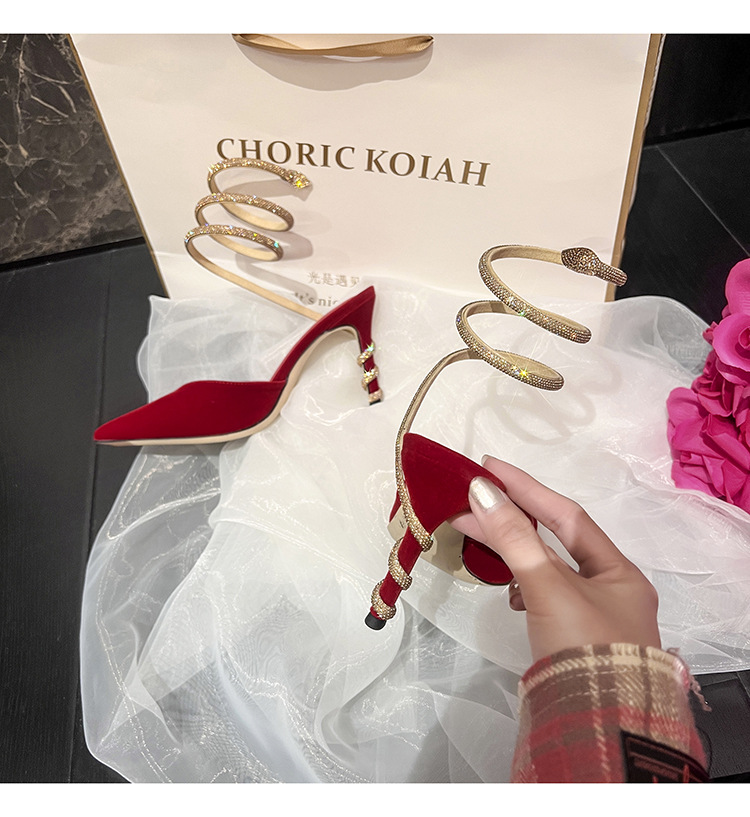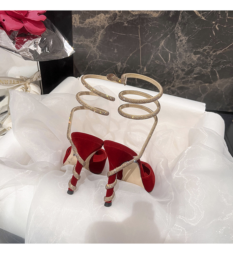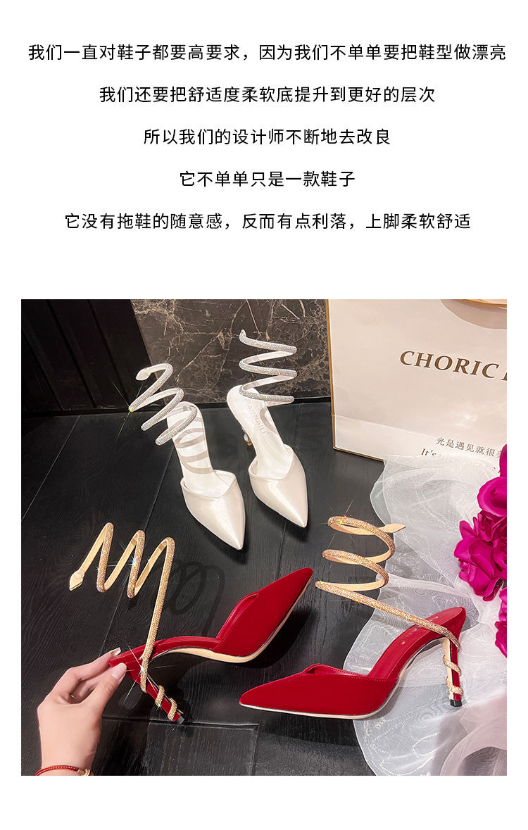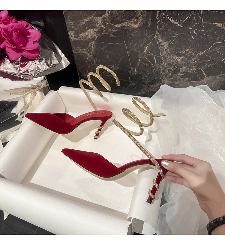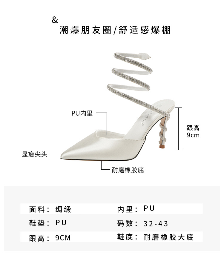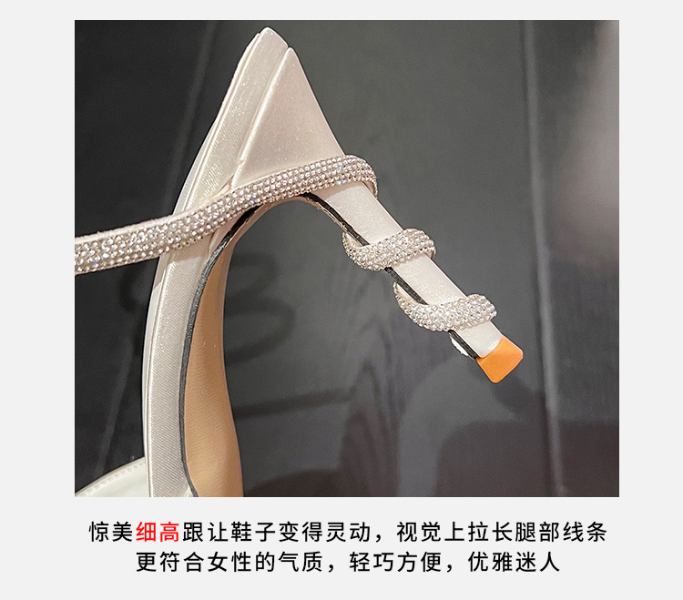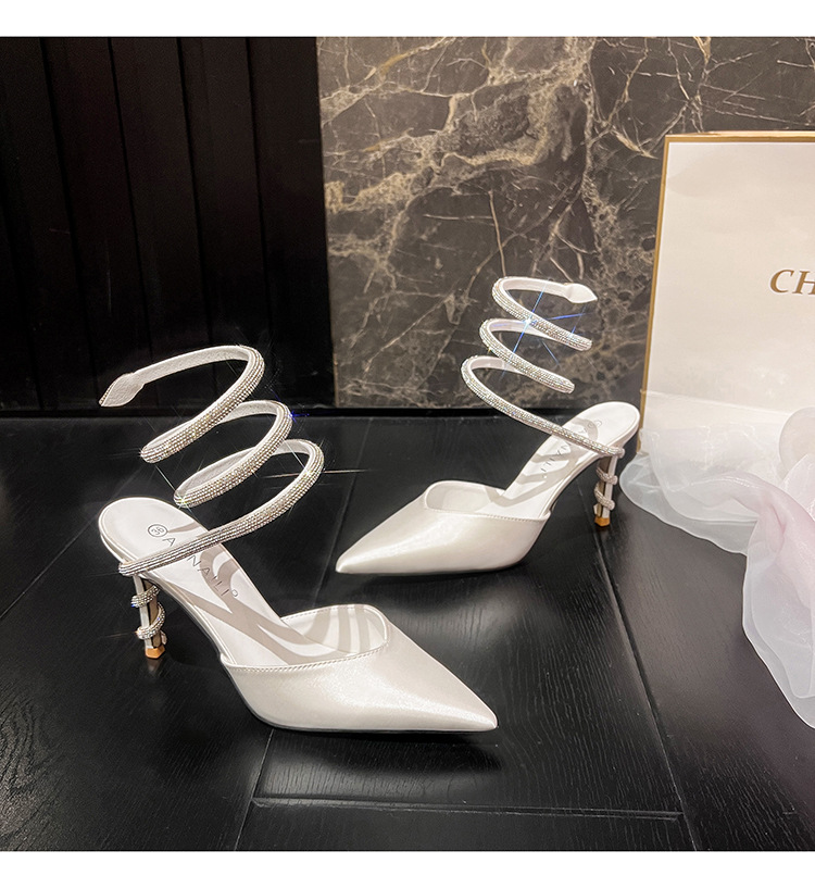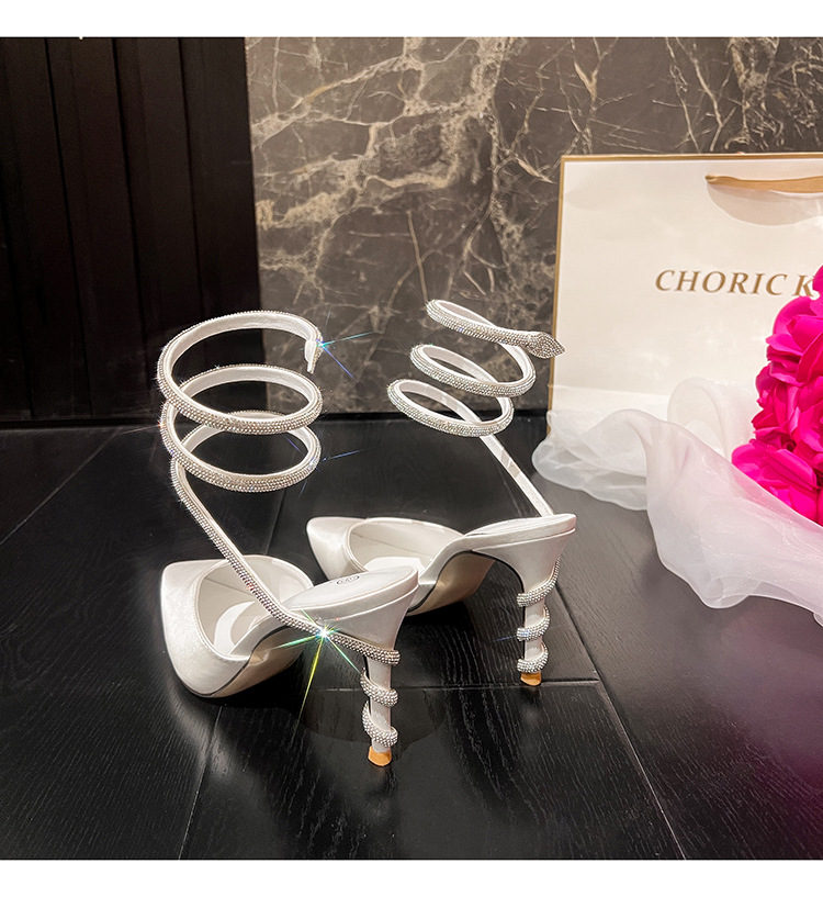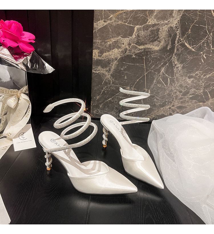 Baotou 샌들 여성 여름 유럽과 미국의 섹시한 뱀 랩 라인스톤 스웨이드 뾰족한 하이힐 화이트 새틴 웨딩 슈즈
