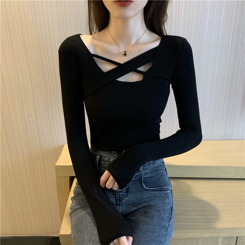 여성을위한 새로운 가을 탑 디자인 내부 바닥 셔츠 블랙 슬림 슬리밍 긴 소매 티셔츠스토어 가기