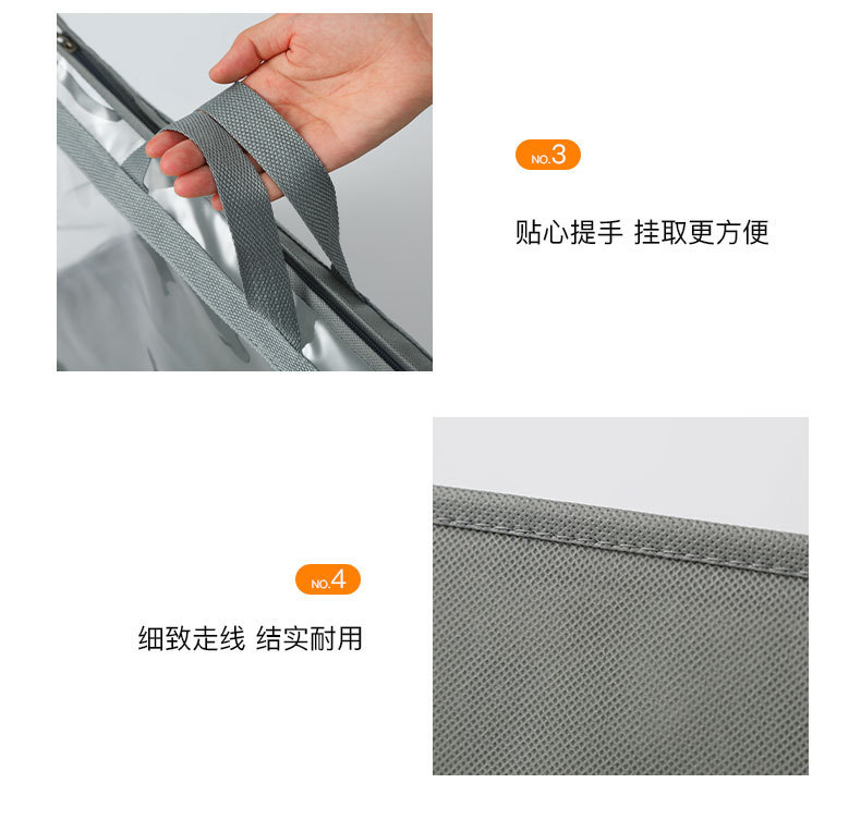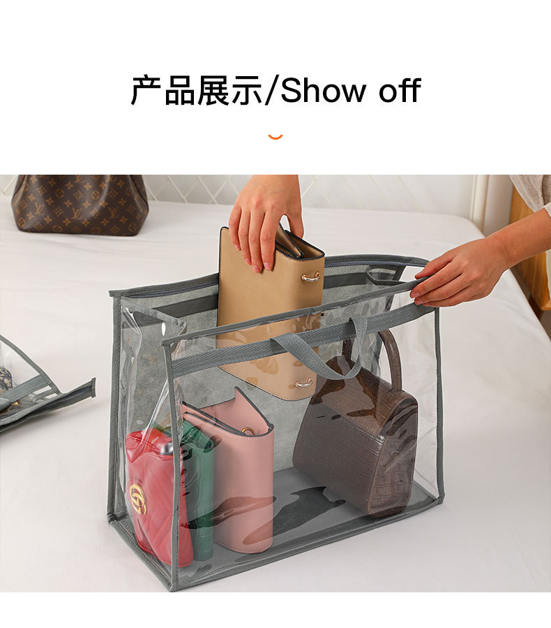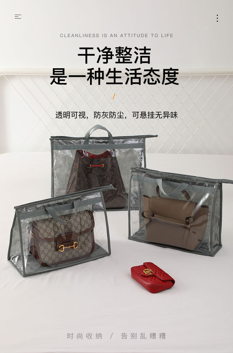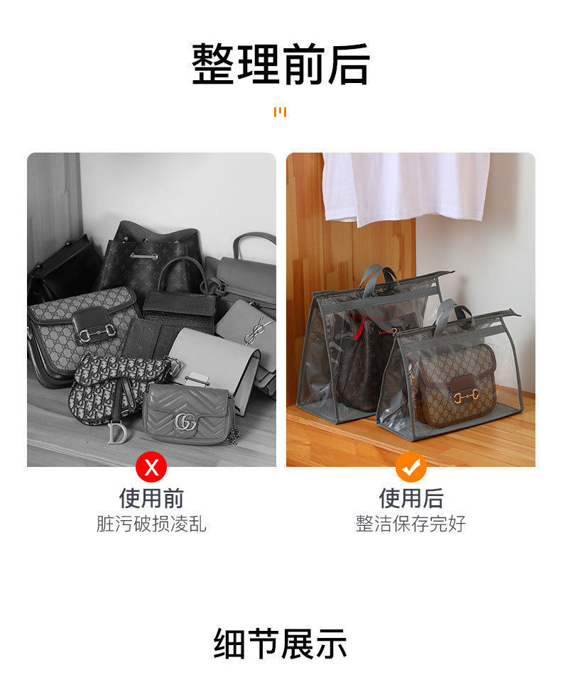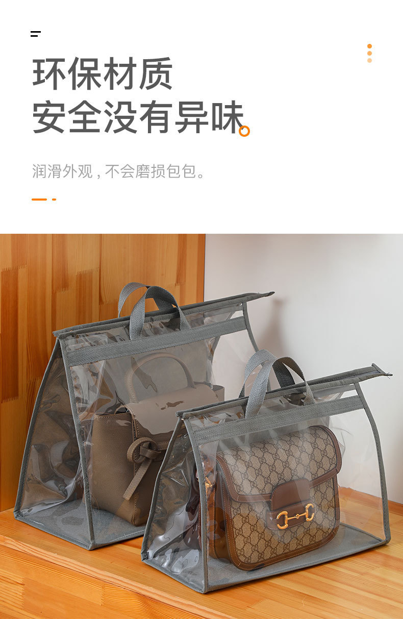 产品特点:采用优质无纺布材料+pvc,防潮仿尘有效保护包包。