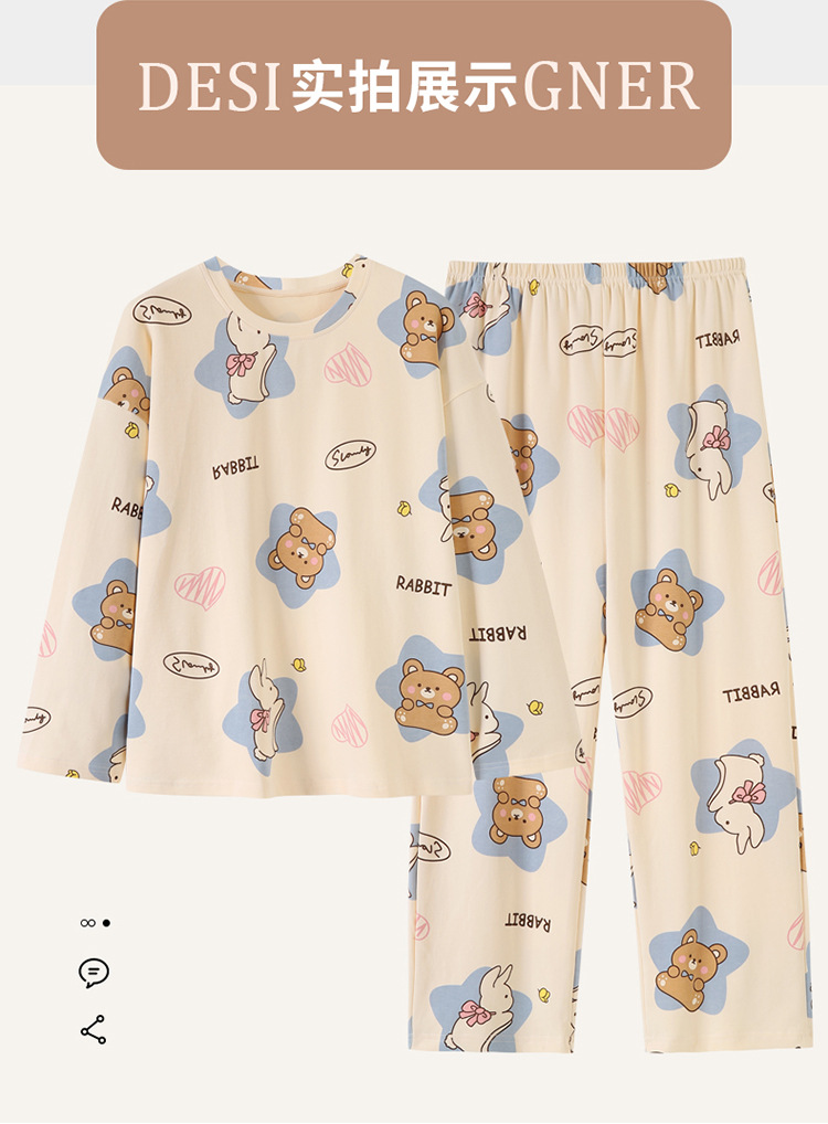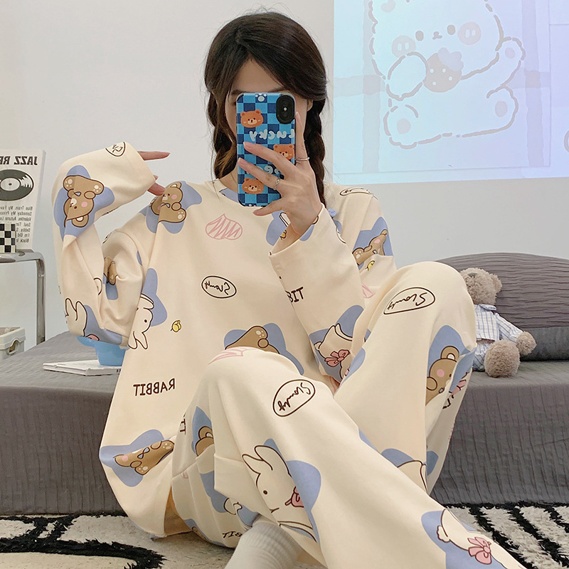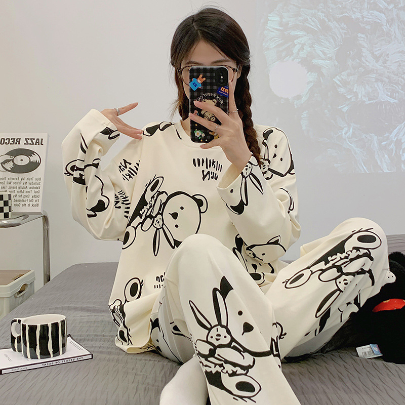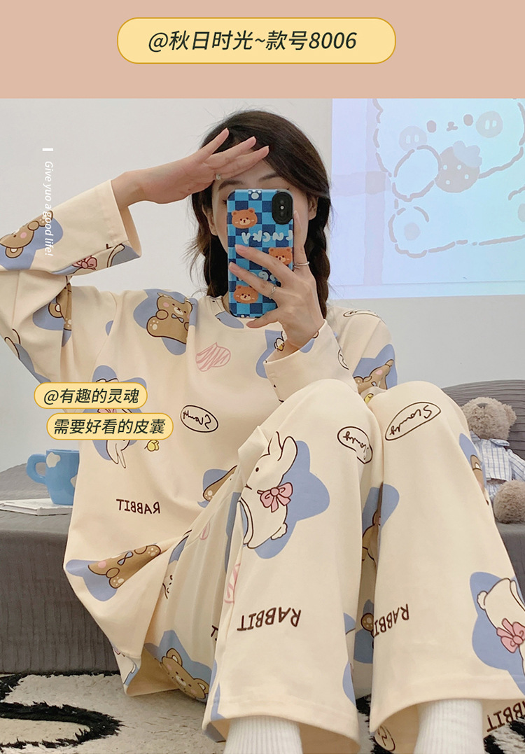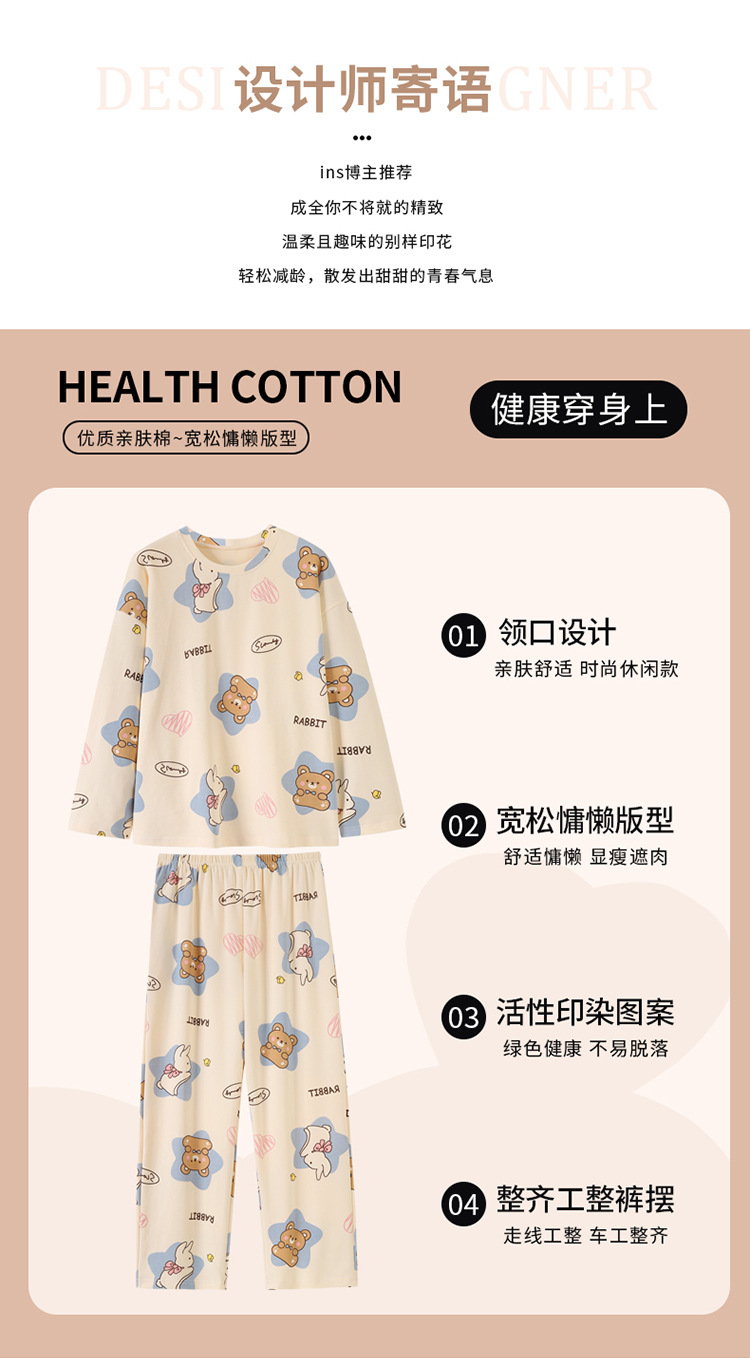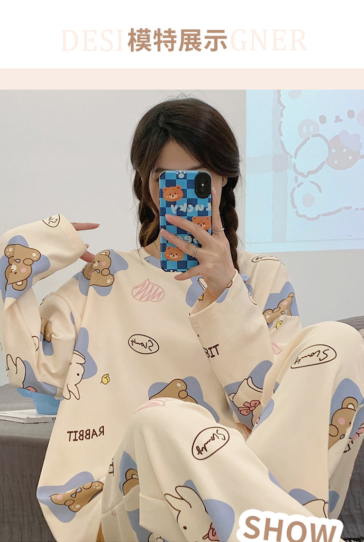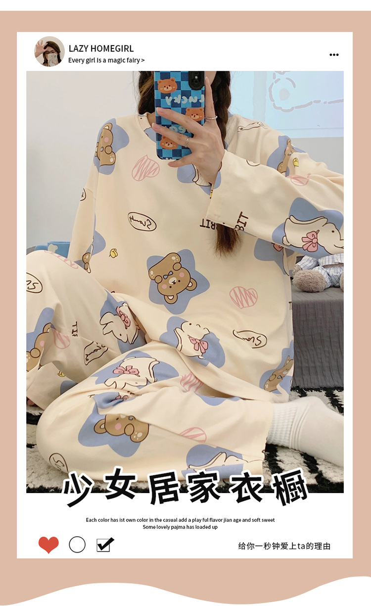 순면 잠옷 여성의 봄과 가을 긴 소매 바지 귀여운 만화 소녀 둥근 목 풀오버 겉옷 홈 의류 세트스토어 가기