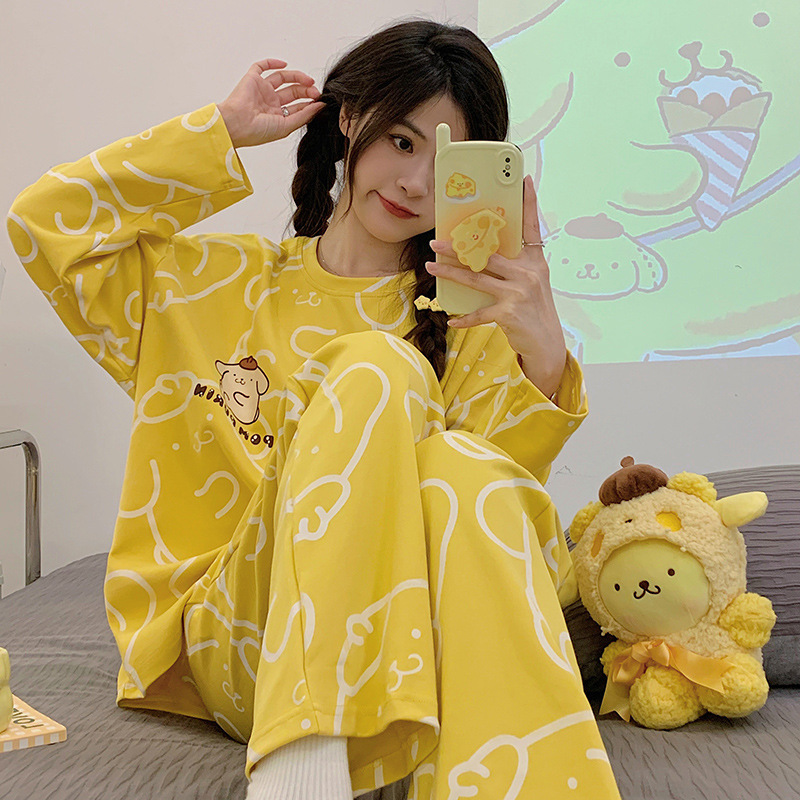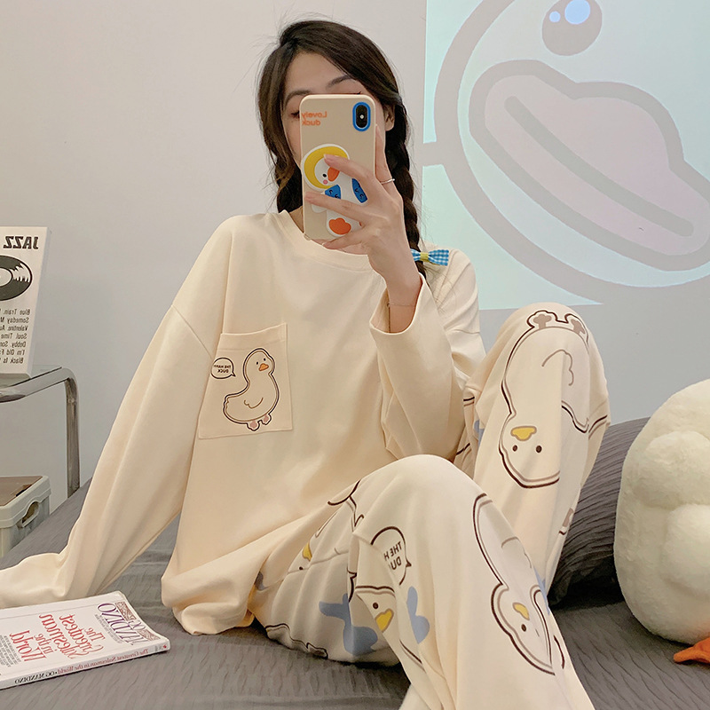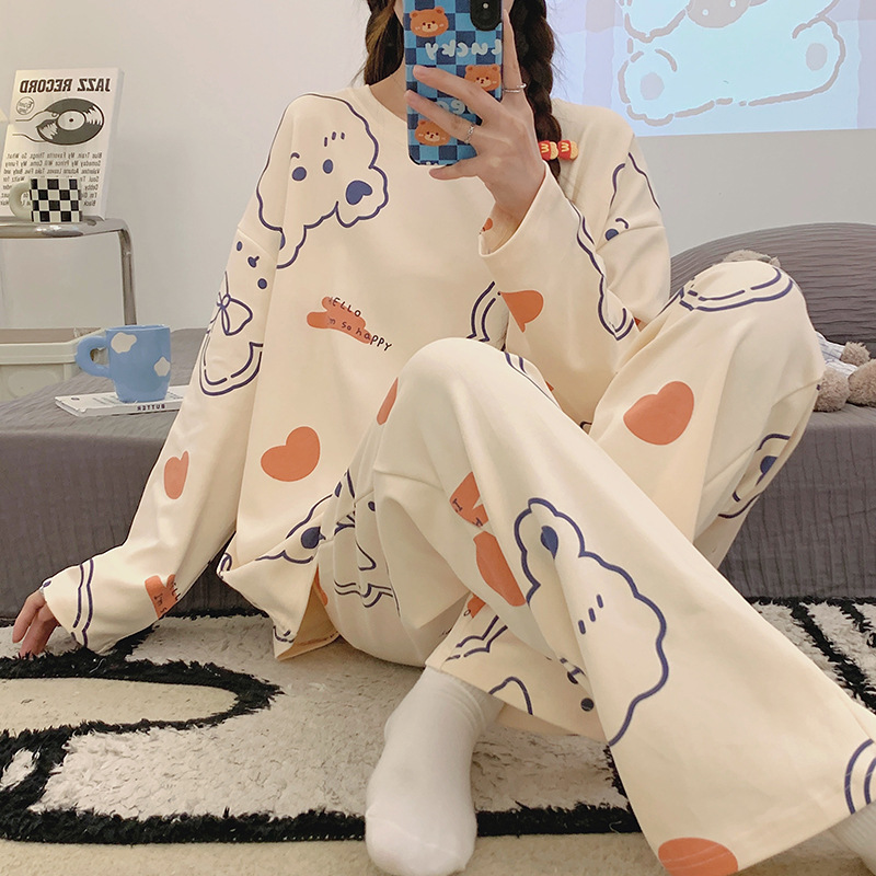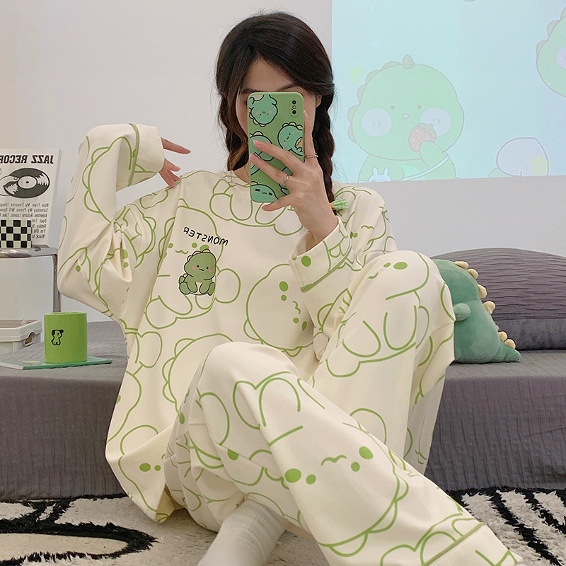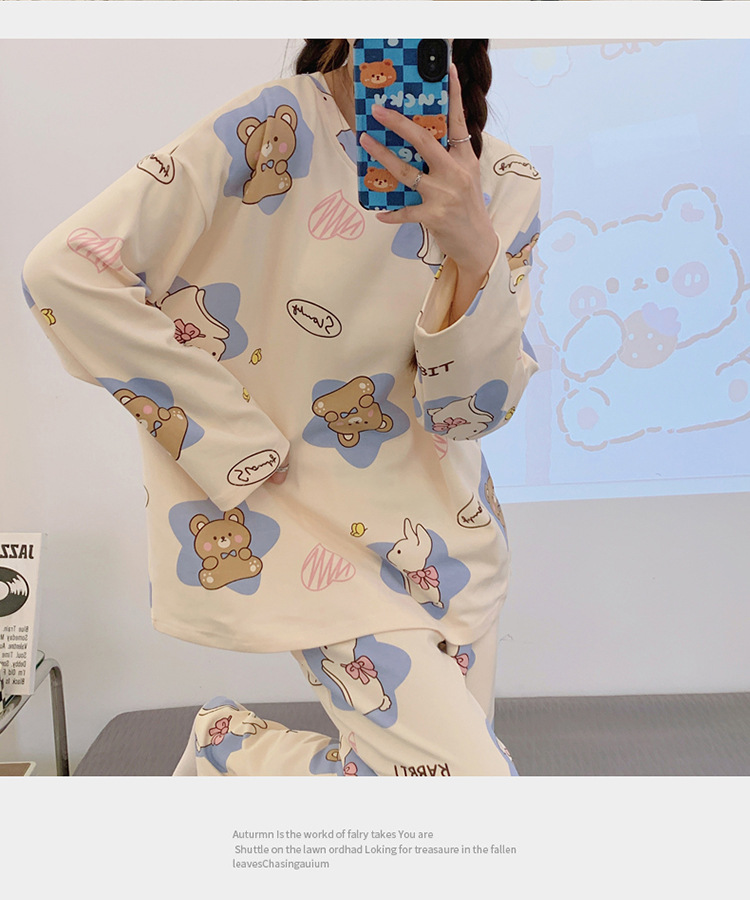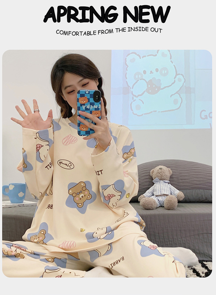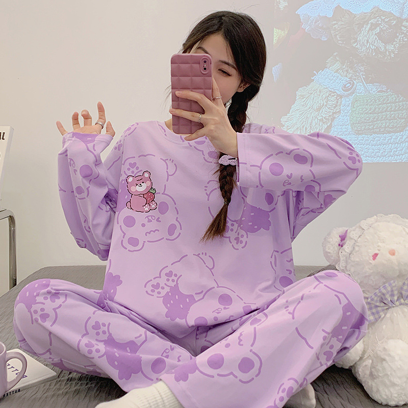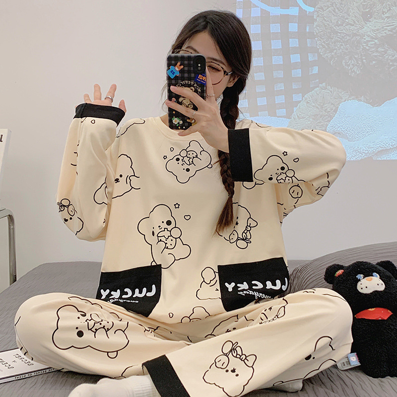 순면 잠옷 여성의 봄과 가을 긴 소매 바지 귀여운 만화 소녀 둥근 목 풀오버 겉옷 홈 의류 세트스토어 가기