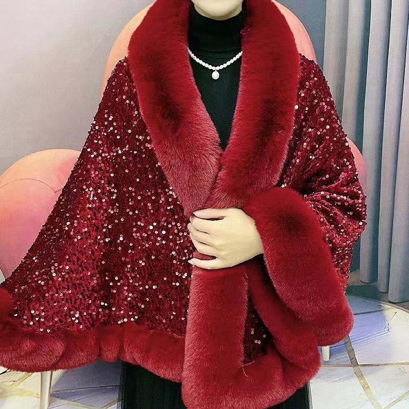 가을과 겨울 두꺼운 따뜻한 고급 기모 스팽글 모피 칼라 술 목도리 코트 레이디 기질 올 매치 느슨한 케이프스토어 가기