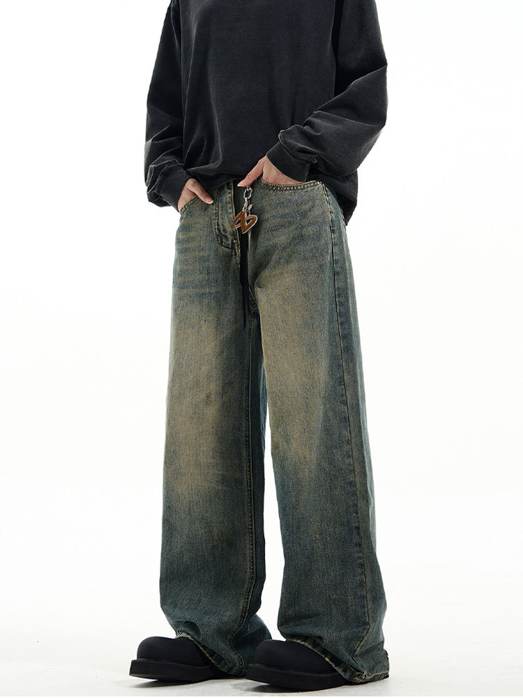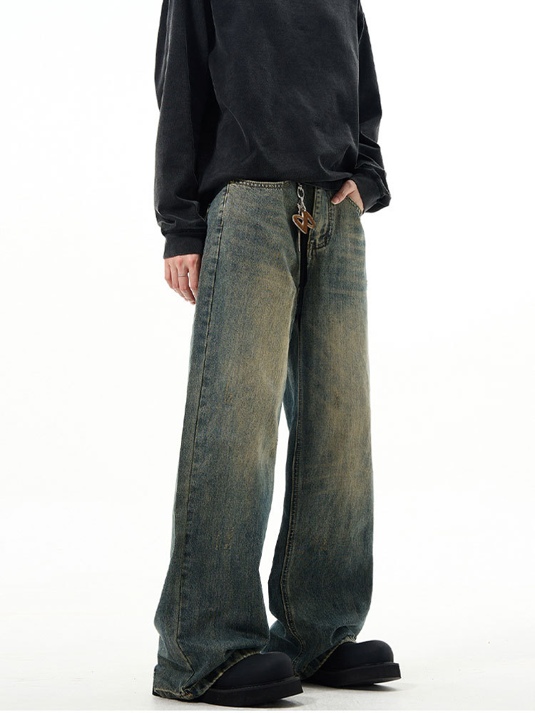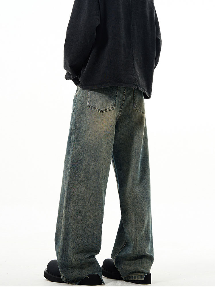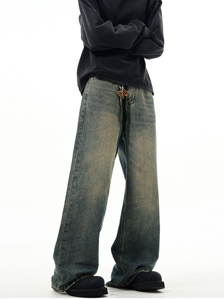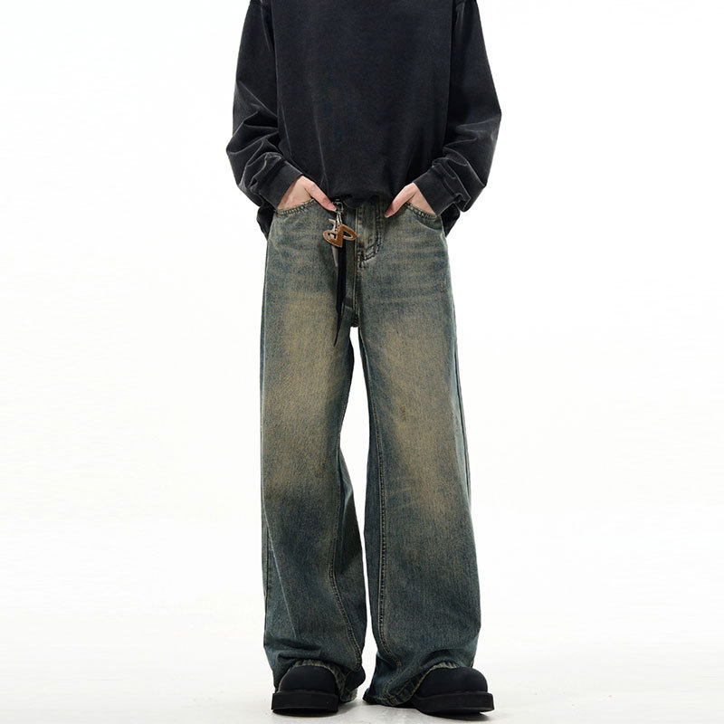 봄 새로운 빈티지 세탁 청바지 남성용 아메리칸 스타일 클린 핏 스트레이트 와이드 다리 빈티지 느슨한 바지스토어 가기