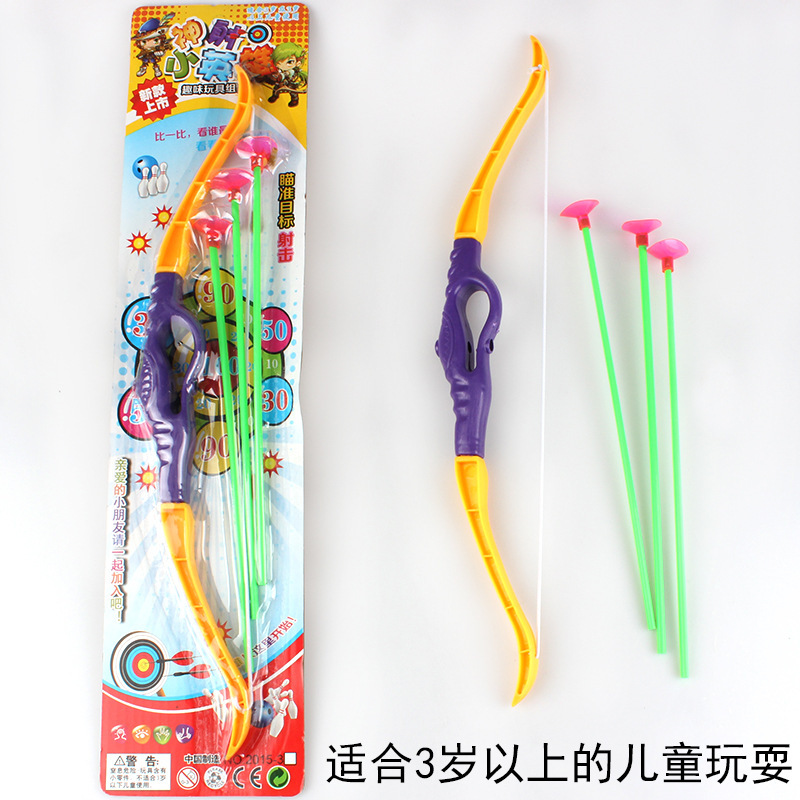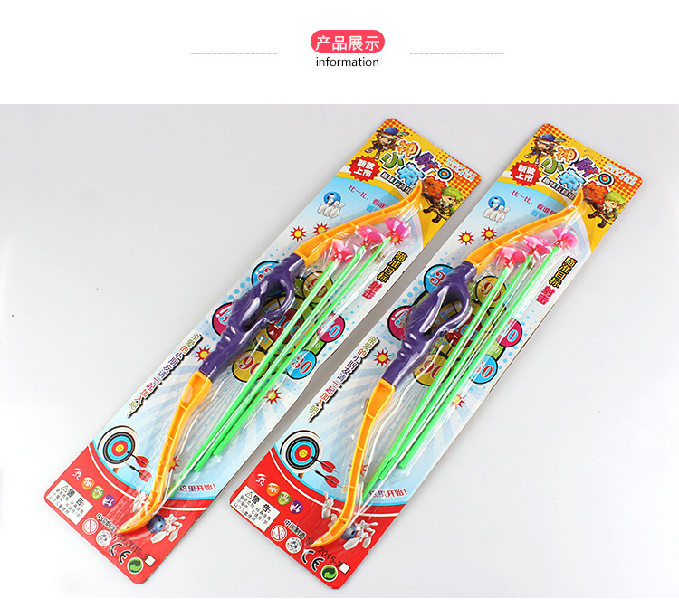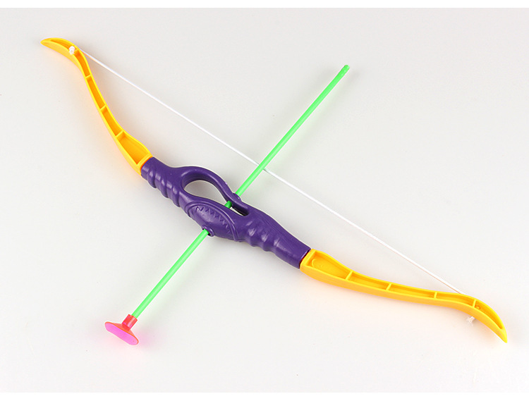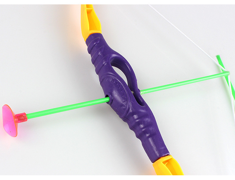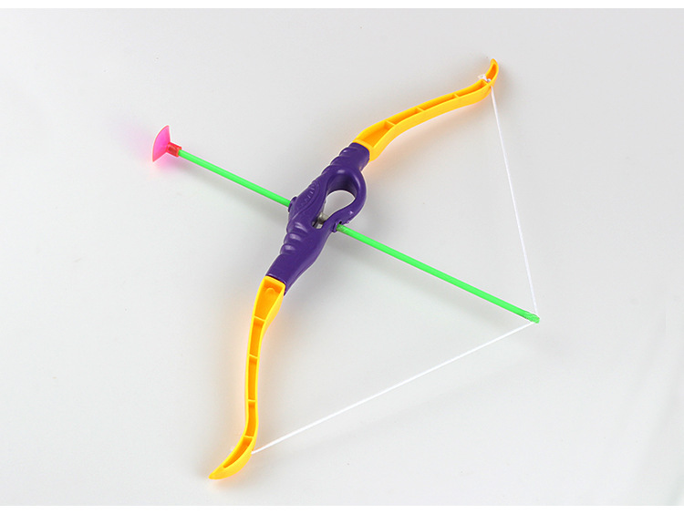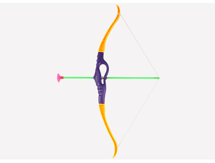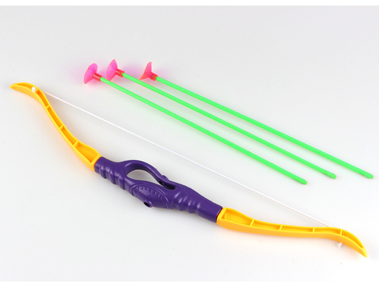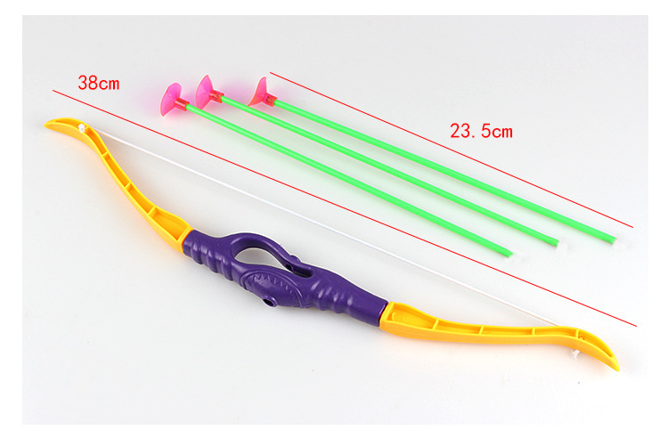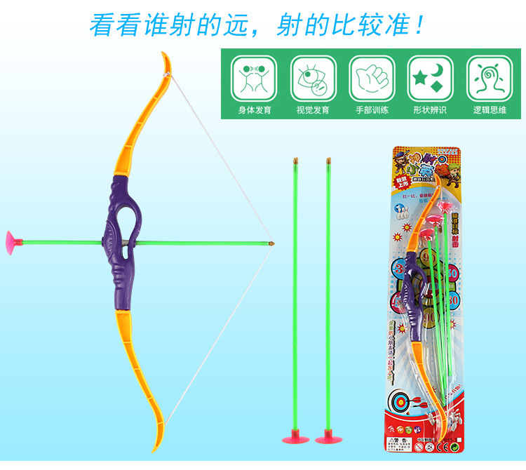 产品特性:一套:含一把弓,三个软吸盘箭。环保料,颜色鲜艳,弓箭弹力大,软吸盘弹箭不伤人,但能很有力的吸贴在玻璃或者墙壁上。