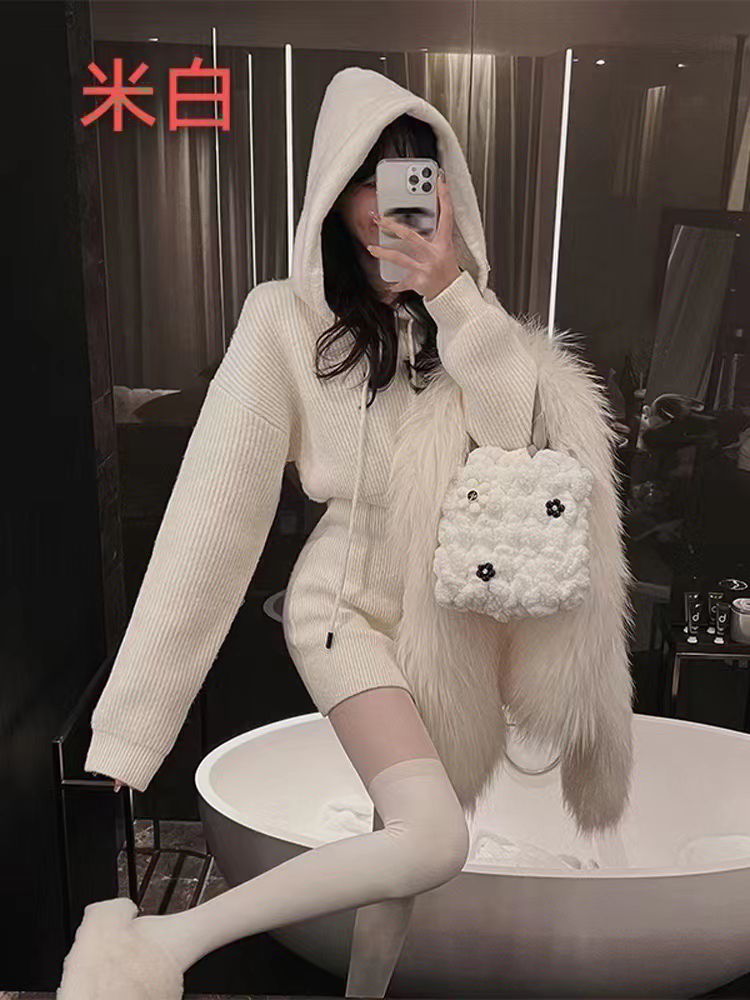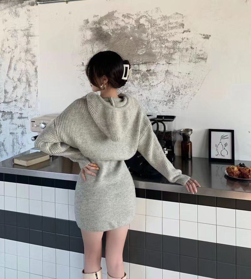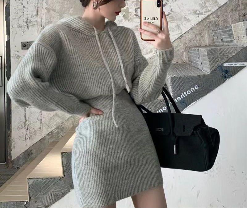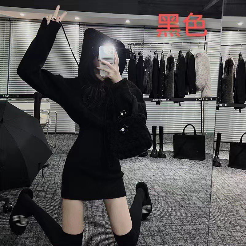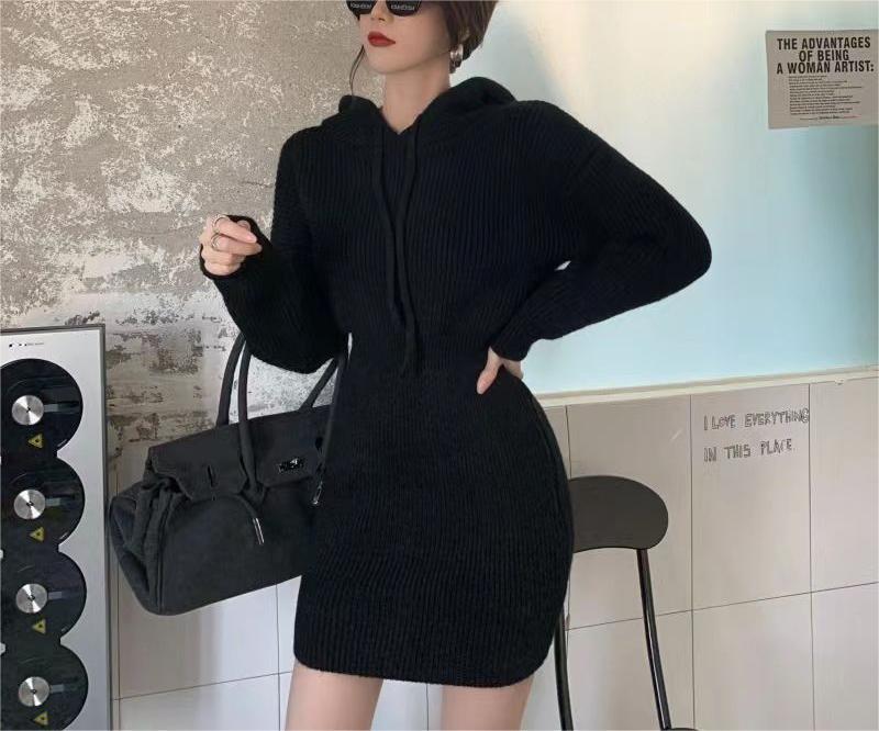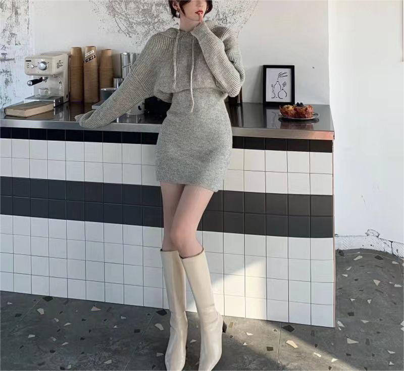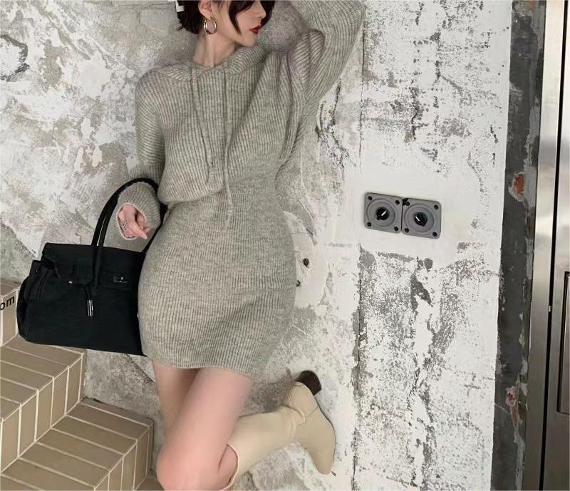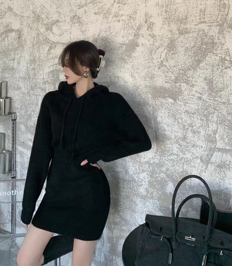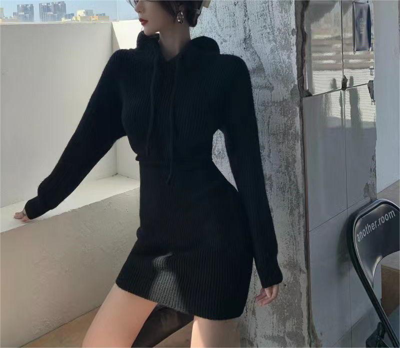 후드가 두꺼운 니트 점프 수트 힙합 스커트 여성의 가을과 겨울 새로운 유행 연령 감소 허리 슬리밍 베이스 스웨터스토어 가기