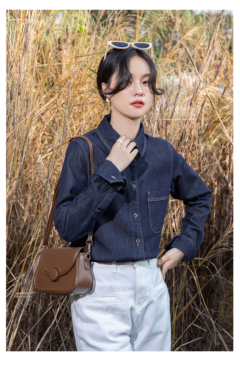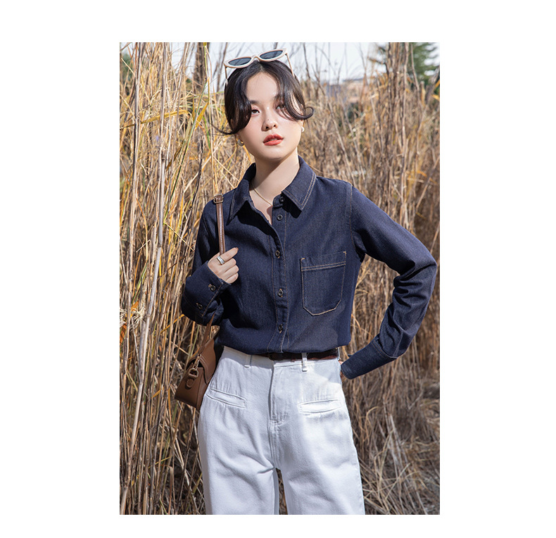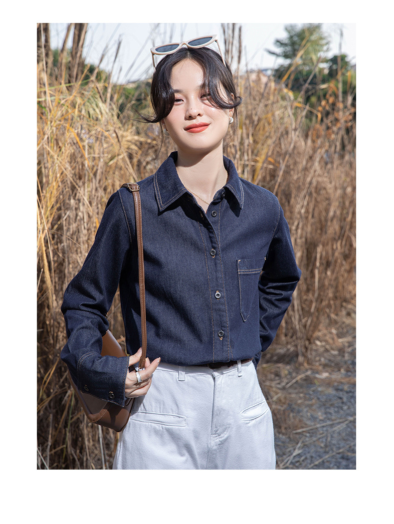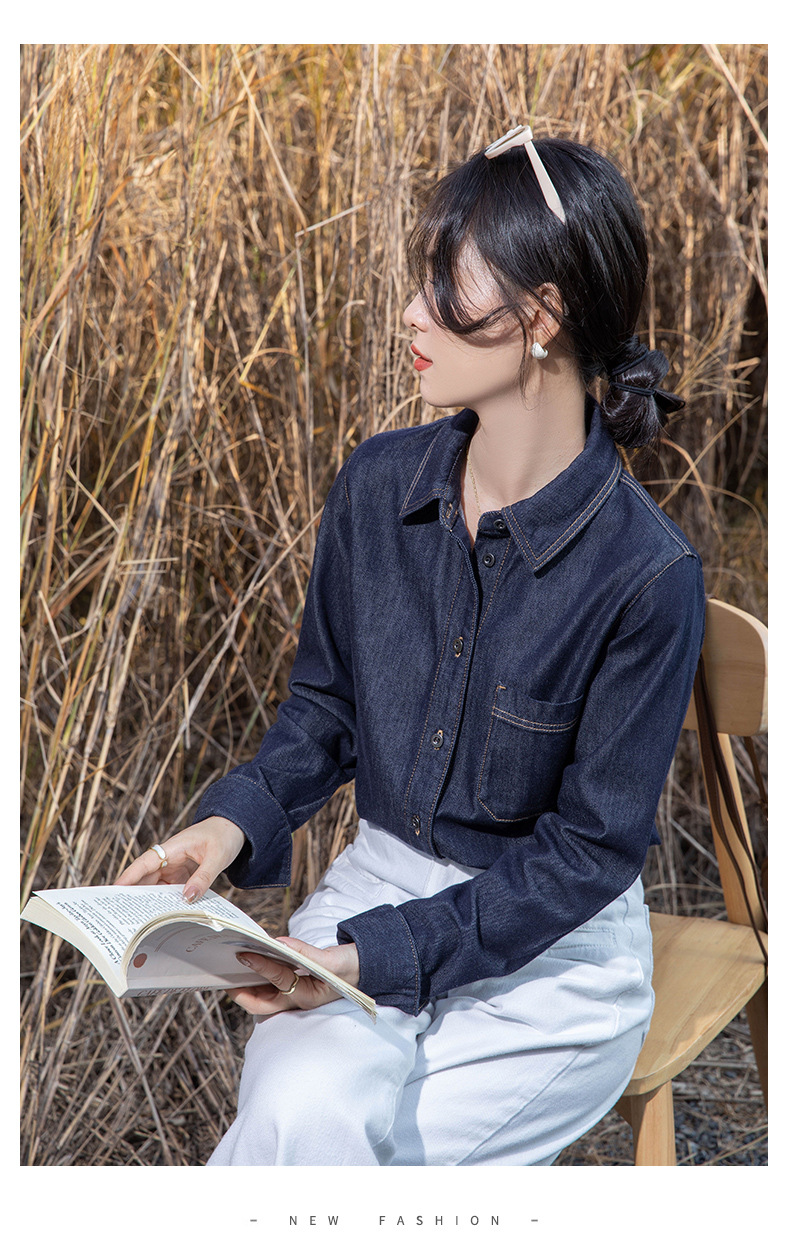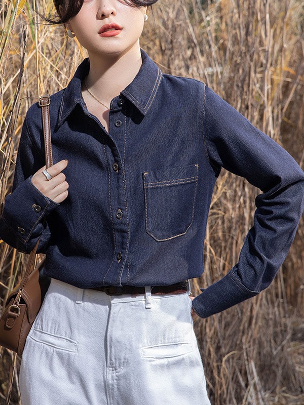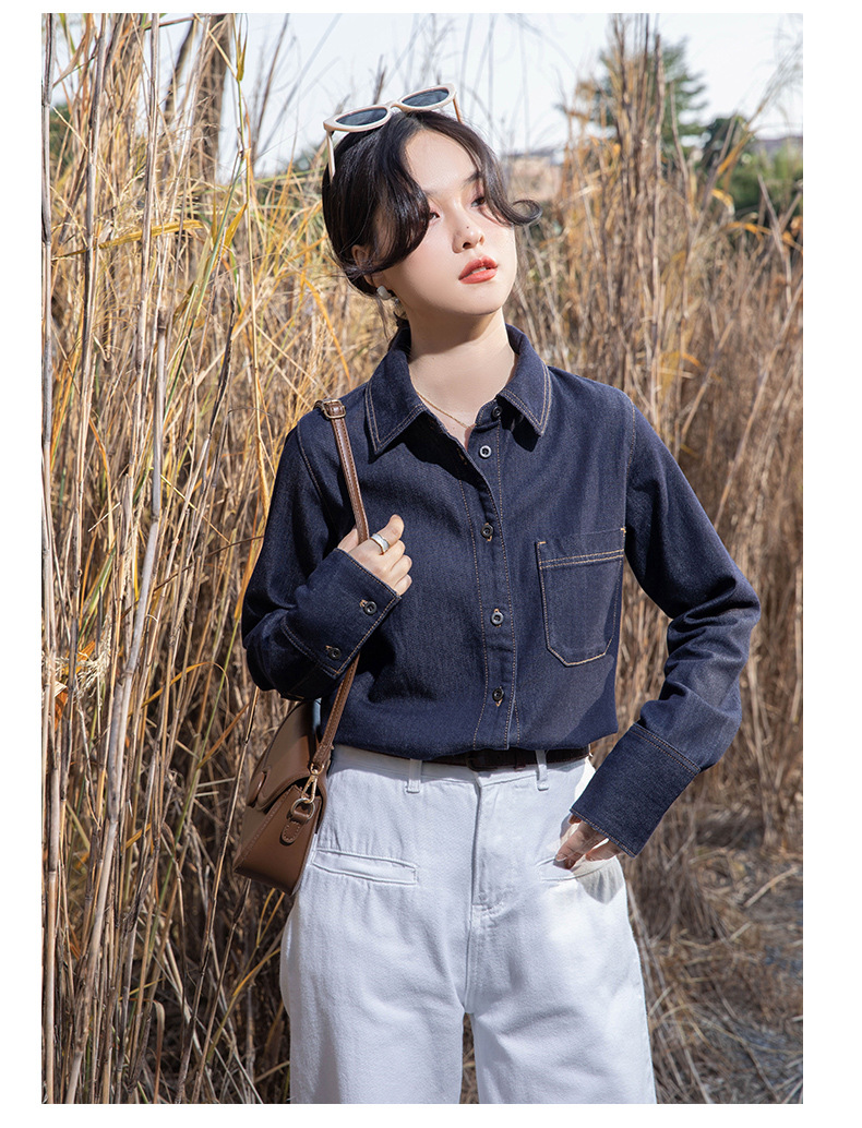 여성을위한 다크 블루 데님 셔츠 봄과 가을 스택 디자인 감각 다양한 복고풍 홍콩 스타일 느슨한 긴 소매 상단