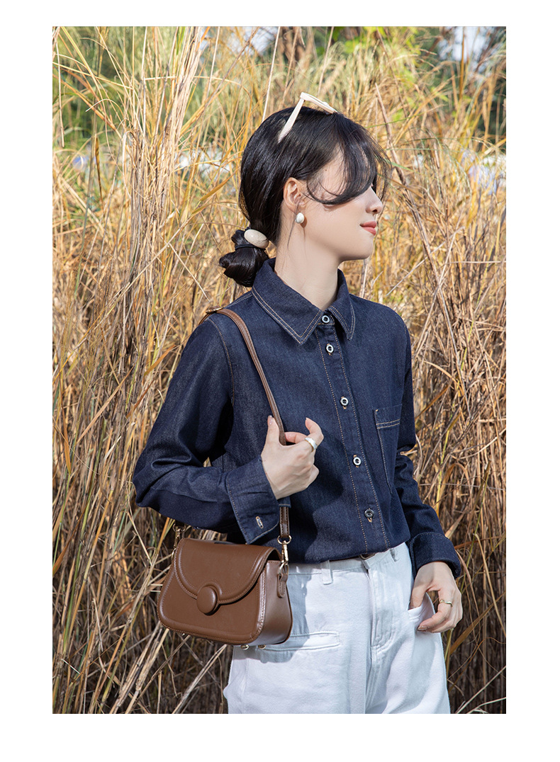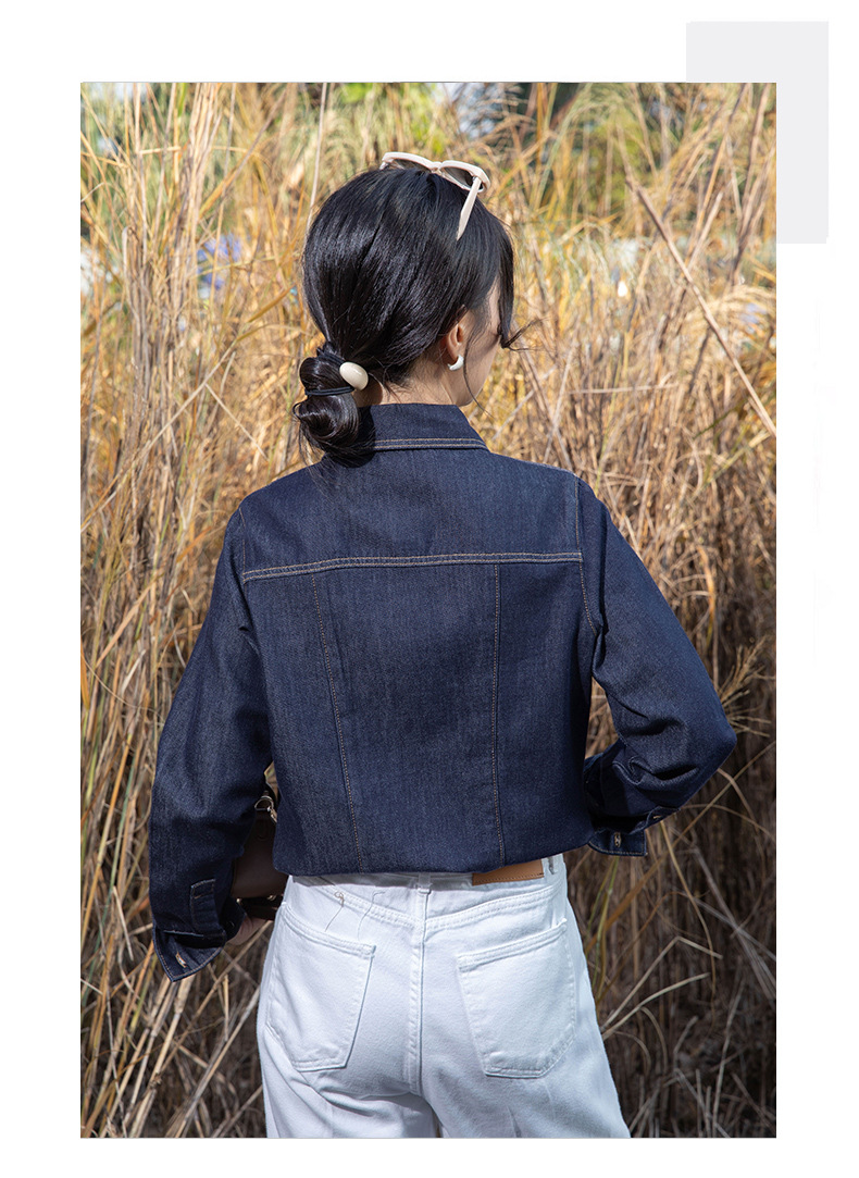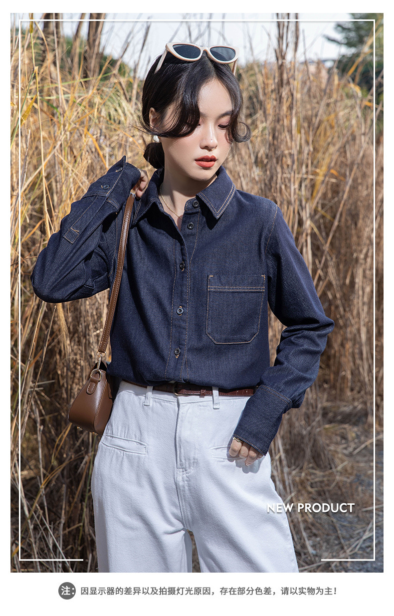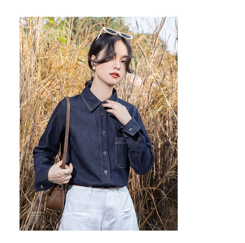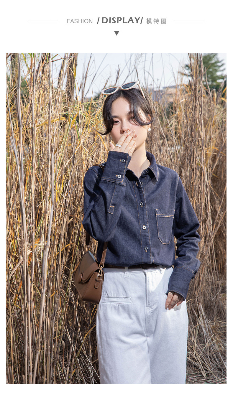 여성을위한 다크 블루 데님 셔츠 봄과 가을 스택 디자인 감각 다양한 복고풍 홍콩 스타일 느슨한 긴 소매 상단