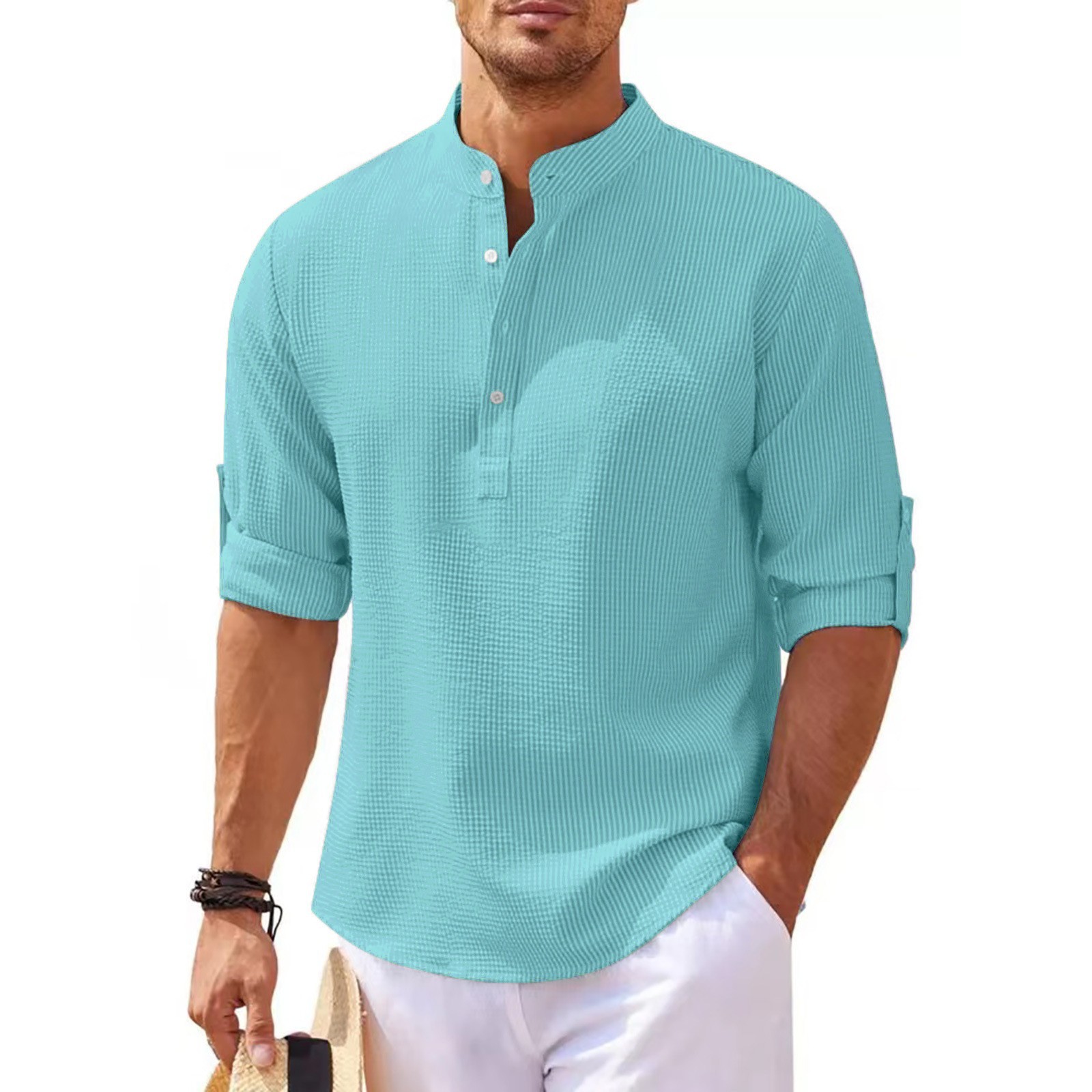 Spot 2025 유럽과 미국 남성 셔츠 긴팔 스탠드 칼라 오픈 버튼 파인애플 격자 무늬 셔츠 남성 캐주얼 셔츠 탑