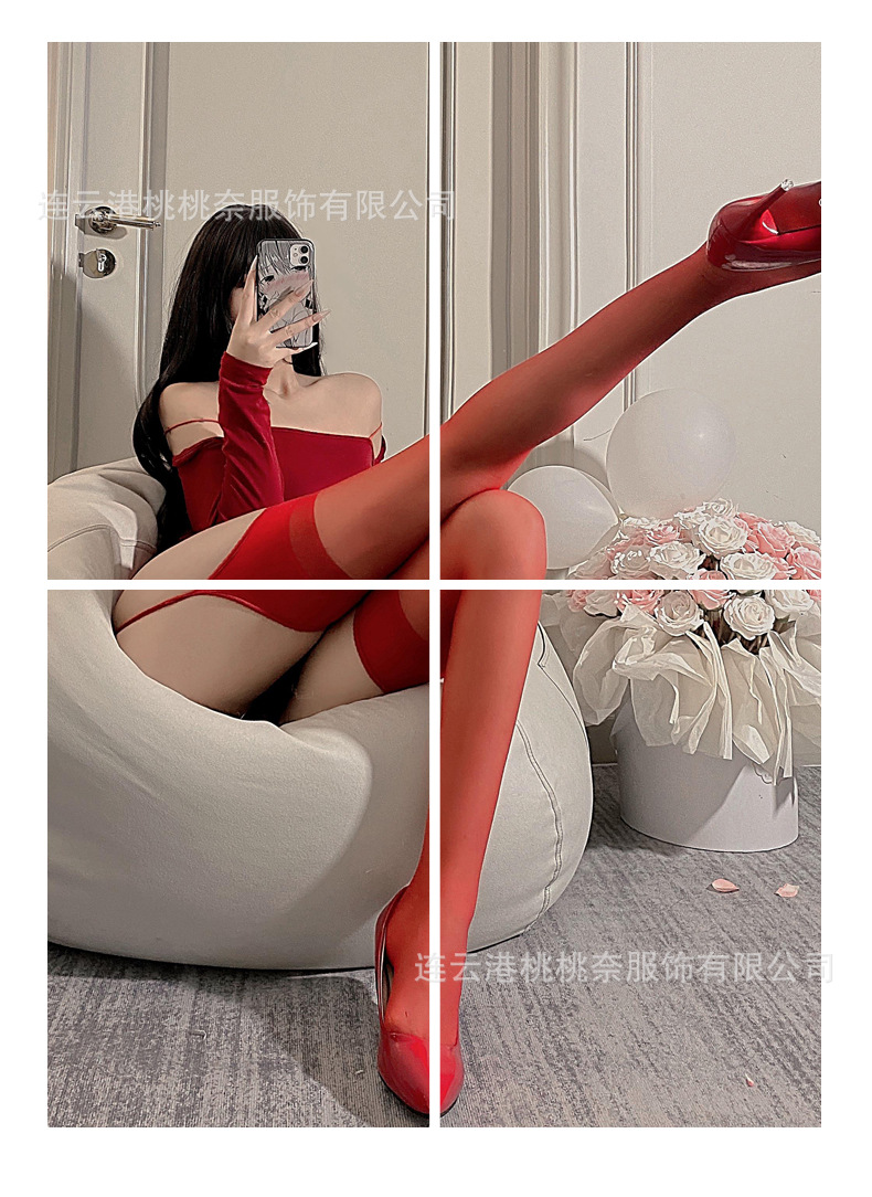 복숭아 복숭아 빨간색 가장자리 검은 실크 슬링 무릎 위 양말 여성 섹시한 대비 색상 순수한 욕망 바람 섹시한 스타킹 얇은