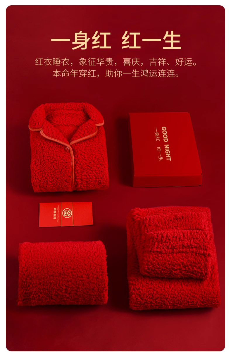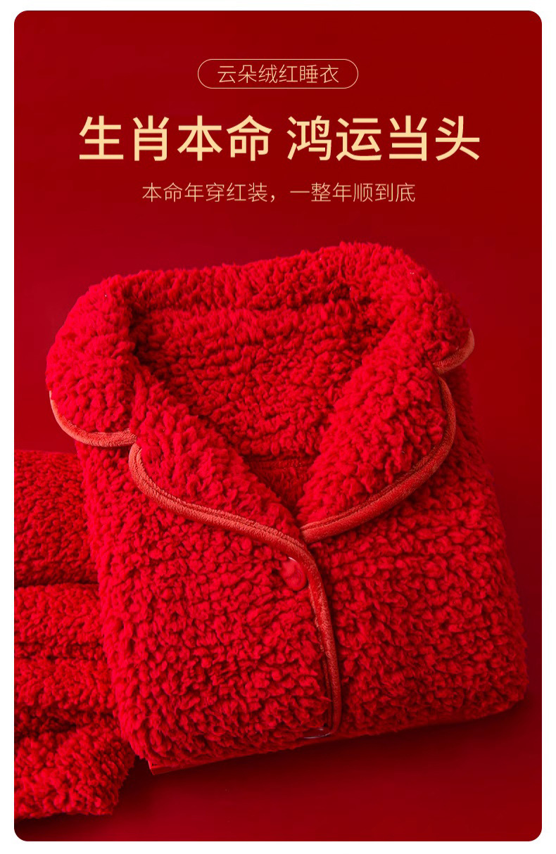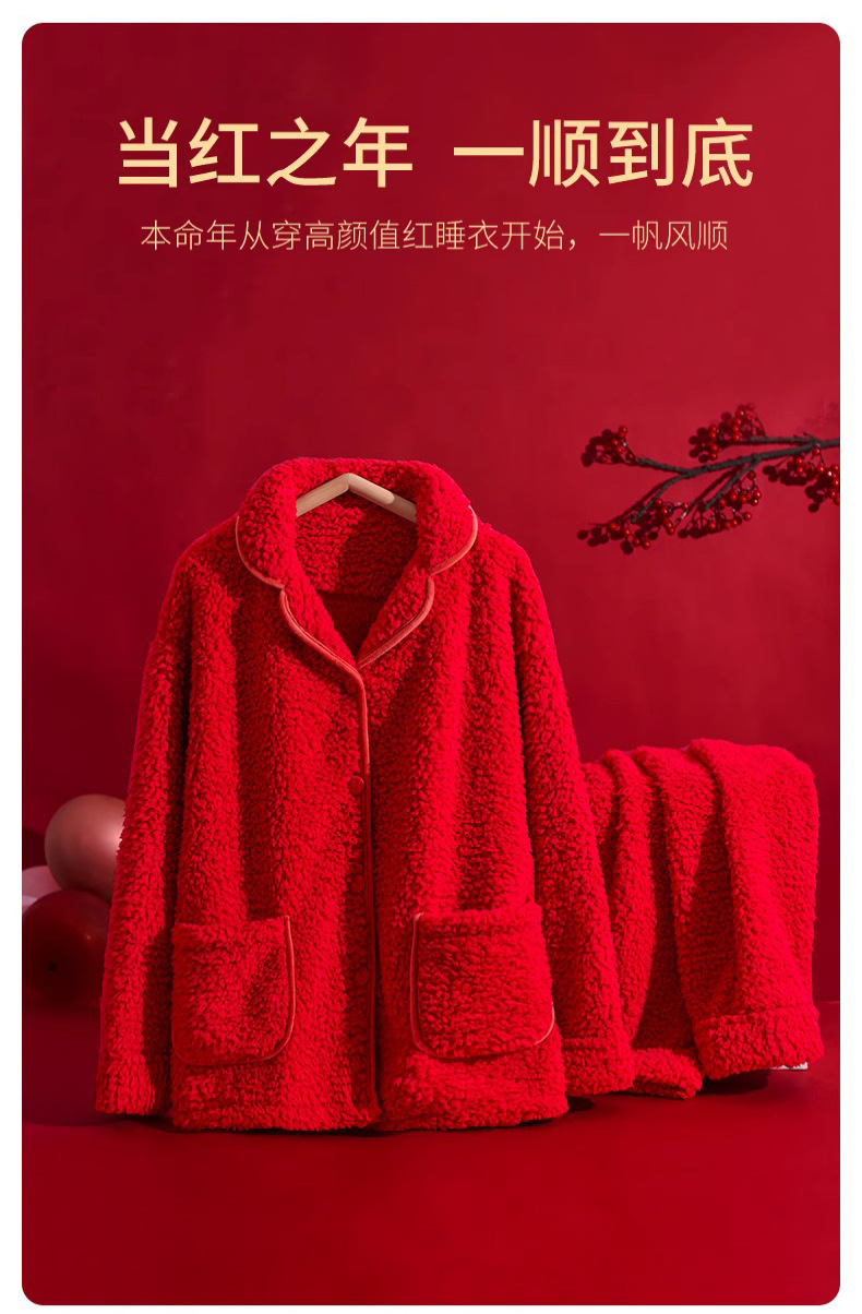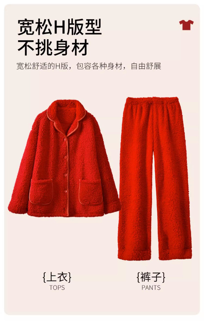 남녀공용 레드 컬러의 겨울용 양면 구름털 푹신하고 두꺼운 신상 따뜻한 홈웨어 세트