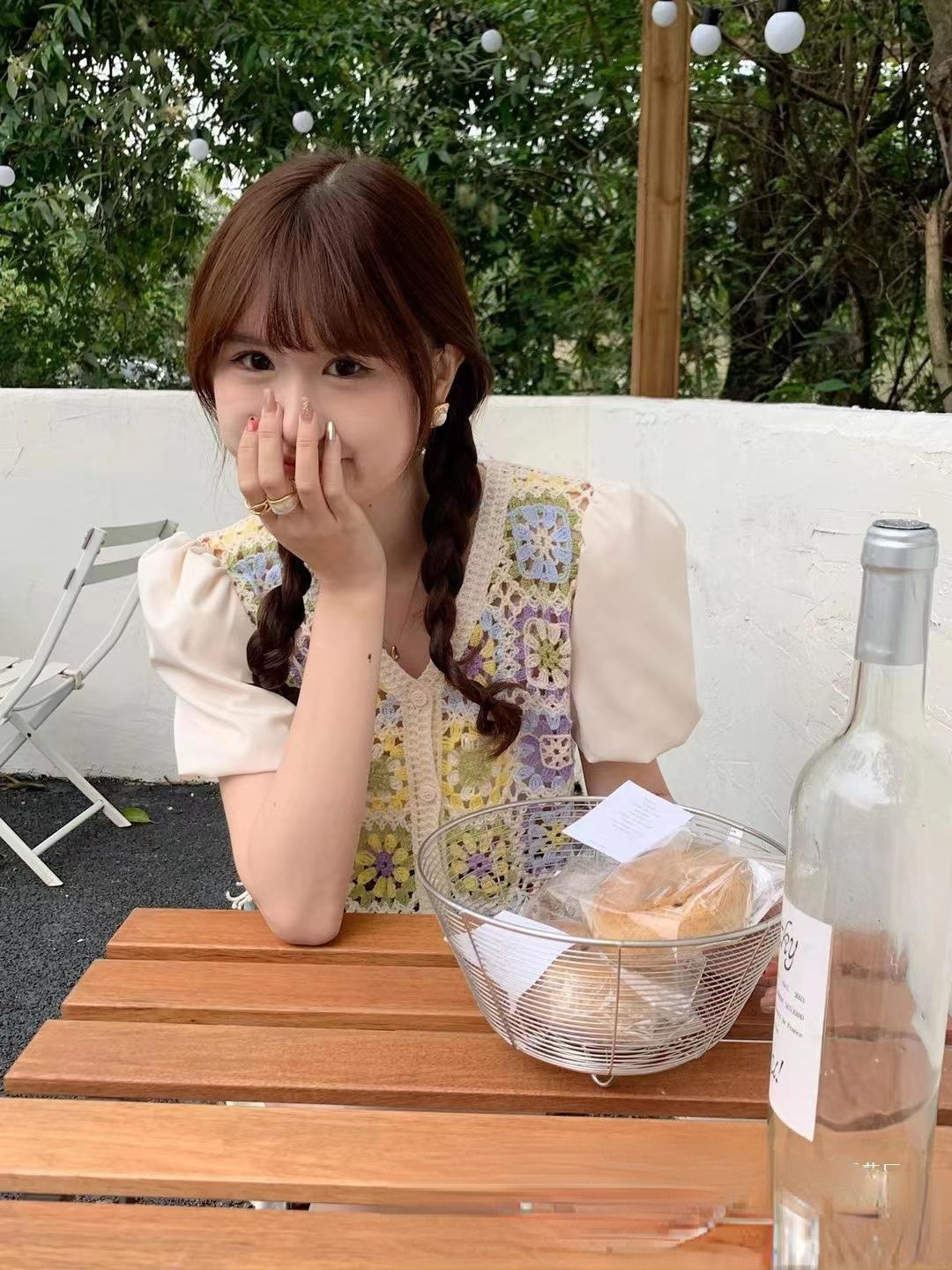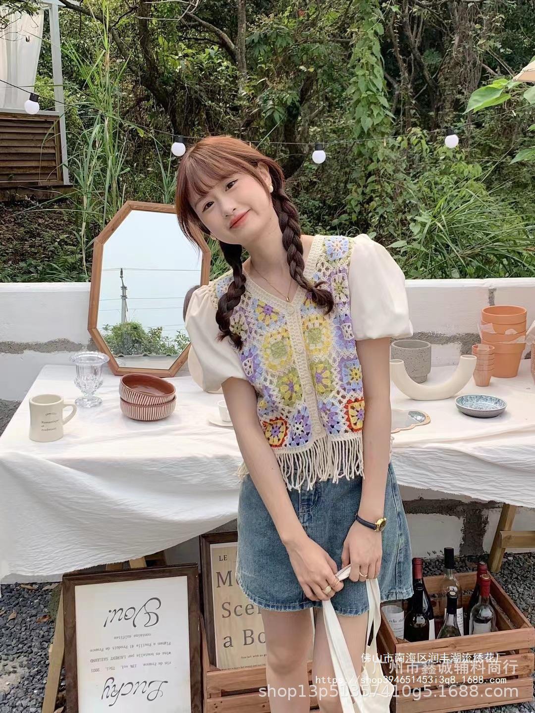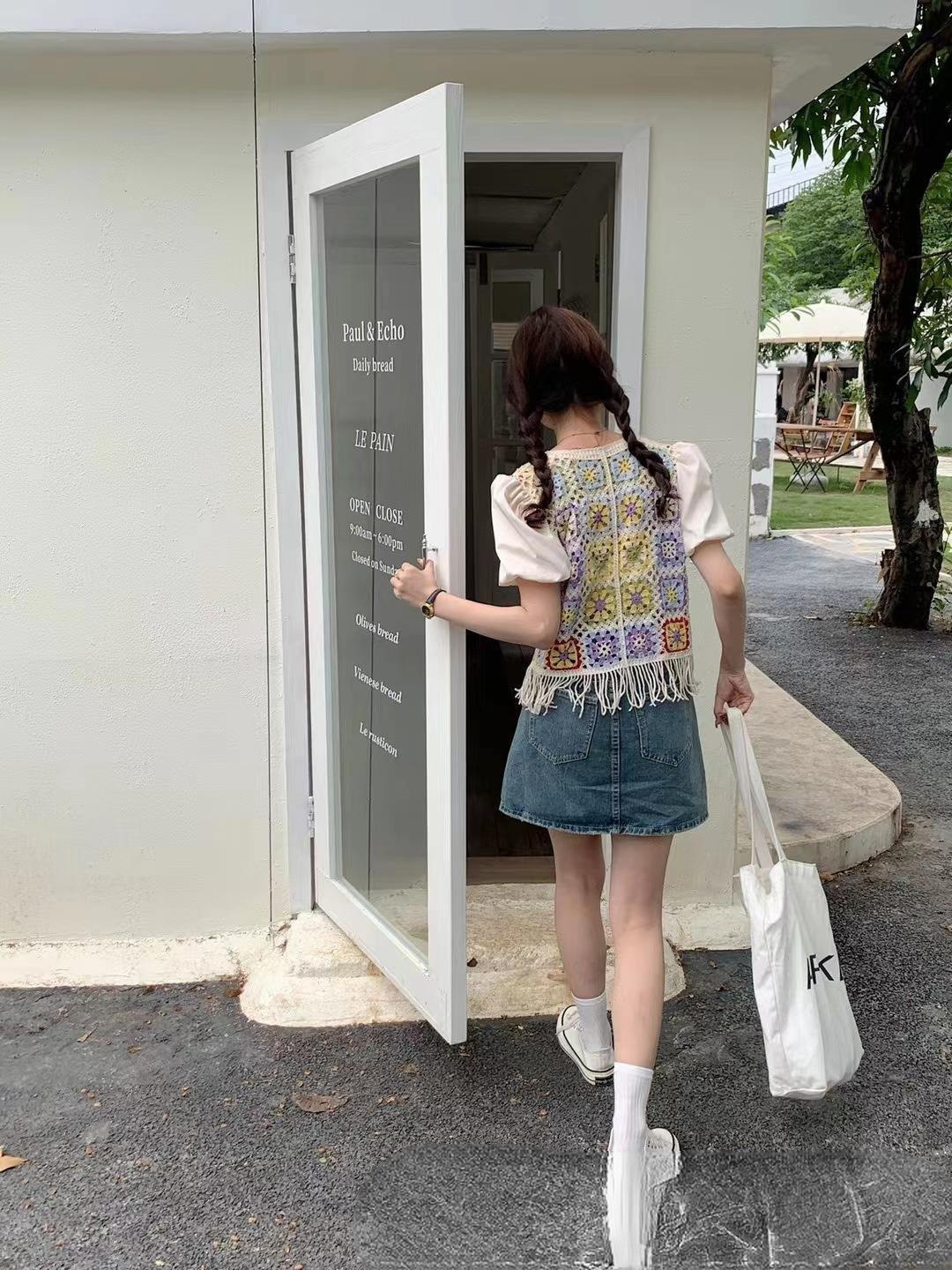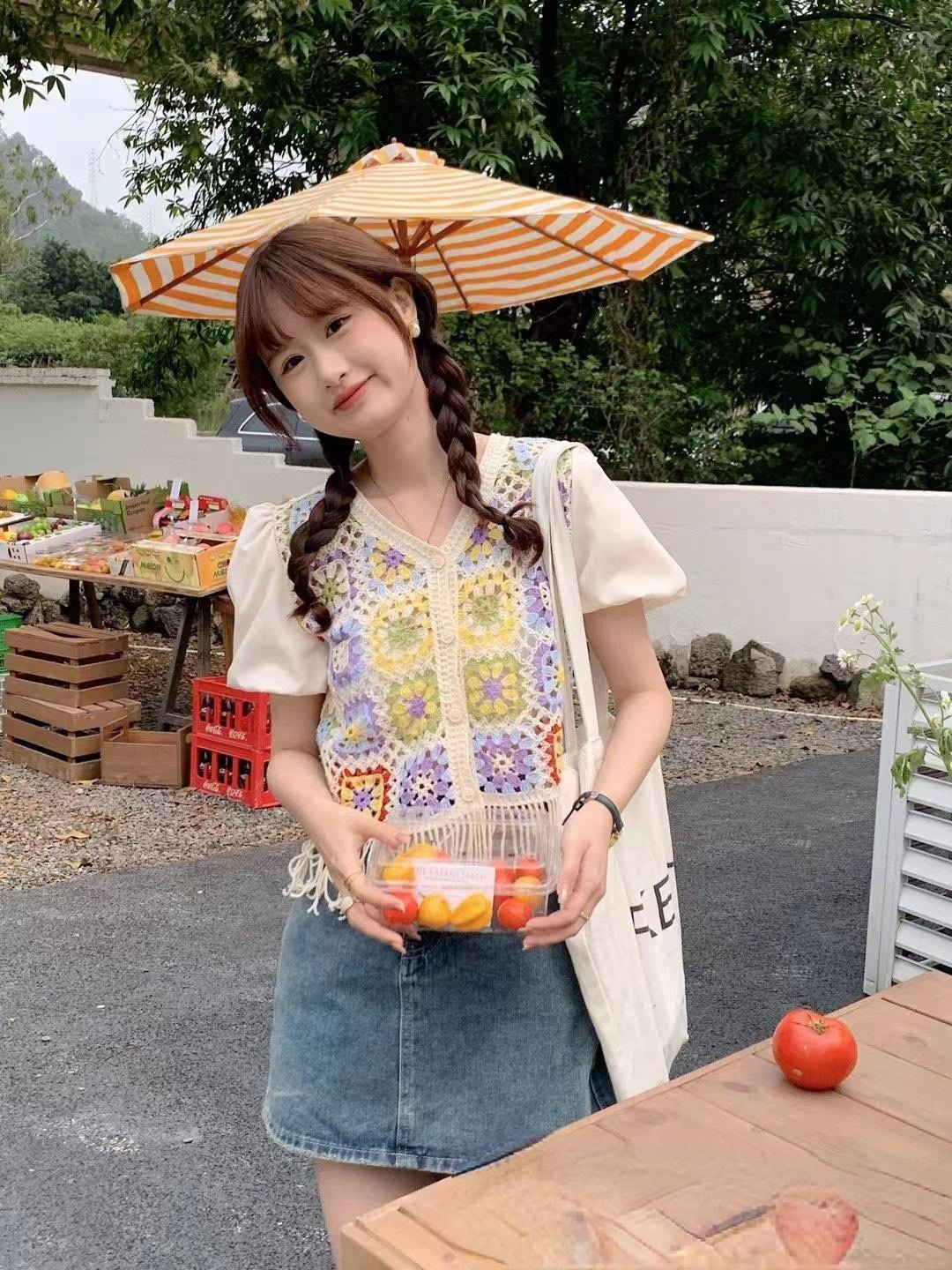 여성을위한 신선한 니트 스티칭 반팔 쉬폰 셔츠 여름 새로운 프랑스 디자인 감각 틈새 쇼트 탑 패션스토어 가기