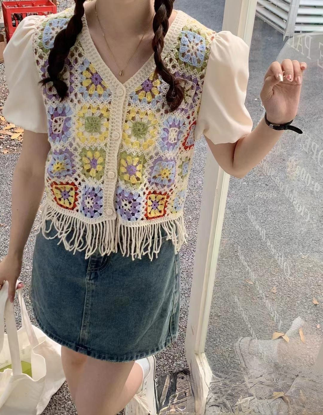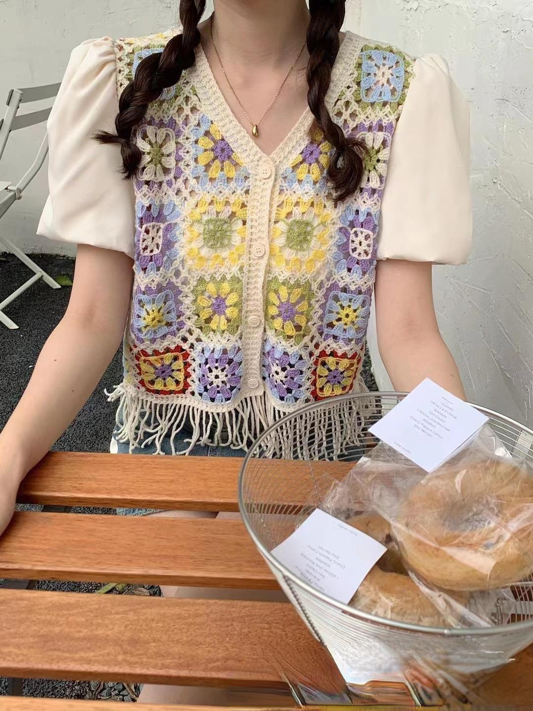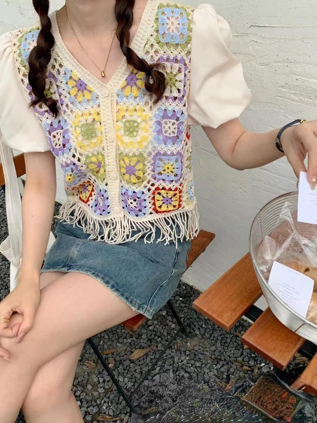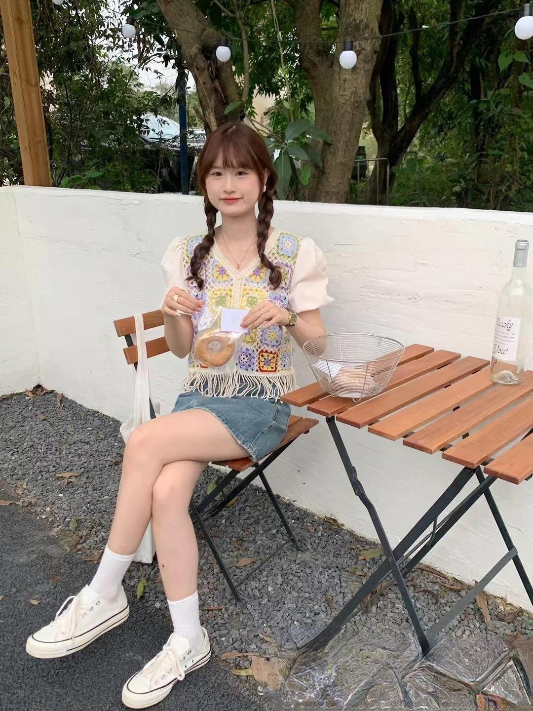 여성을위한 신선한 니트 스티칭 반팔 쉬폰 셔츠 여름 새로운 프랑스 디자인 감각 틈새 쇼트 탑 패션스토어 가기