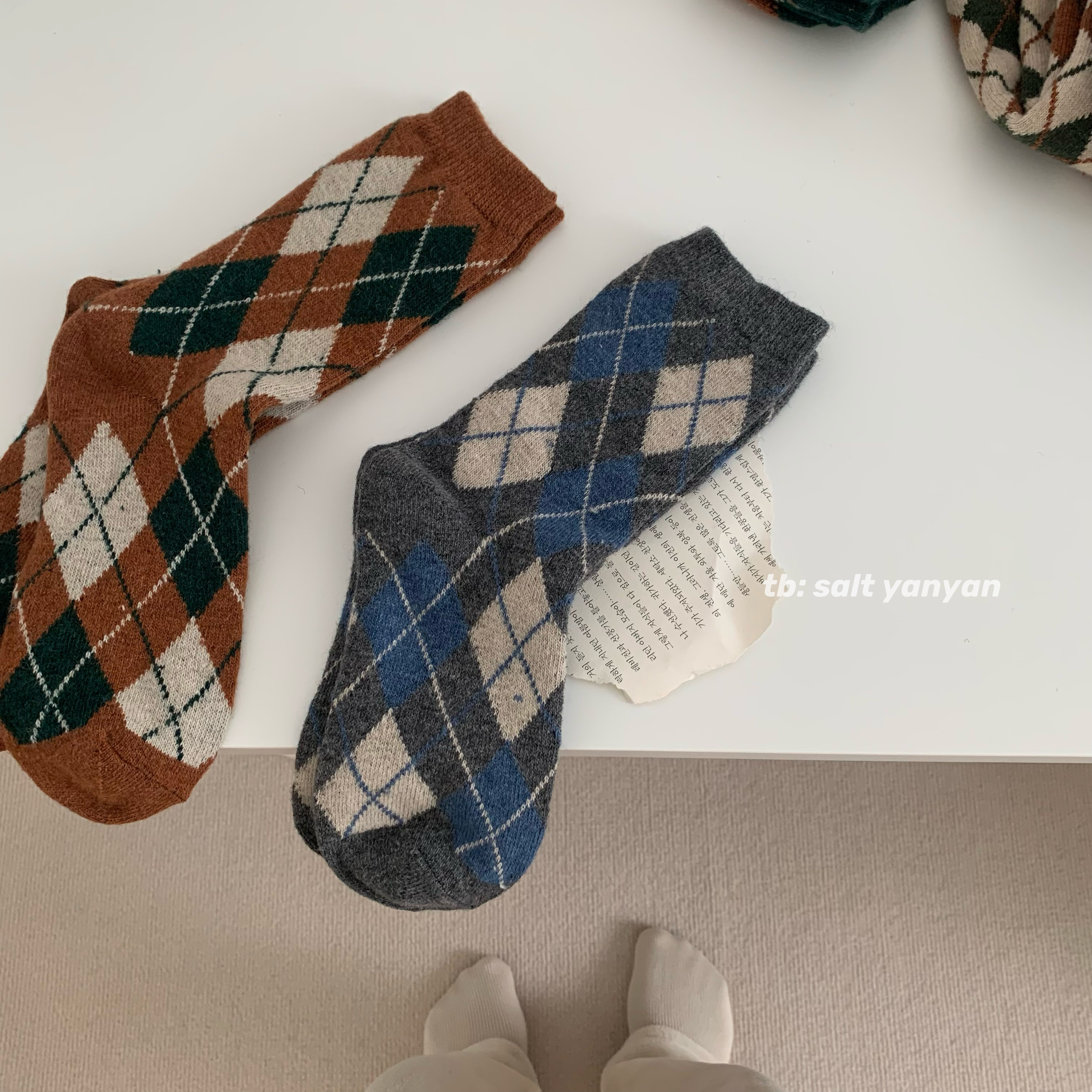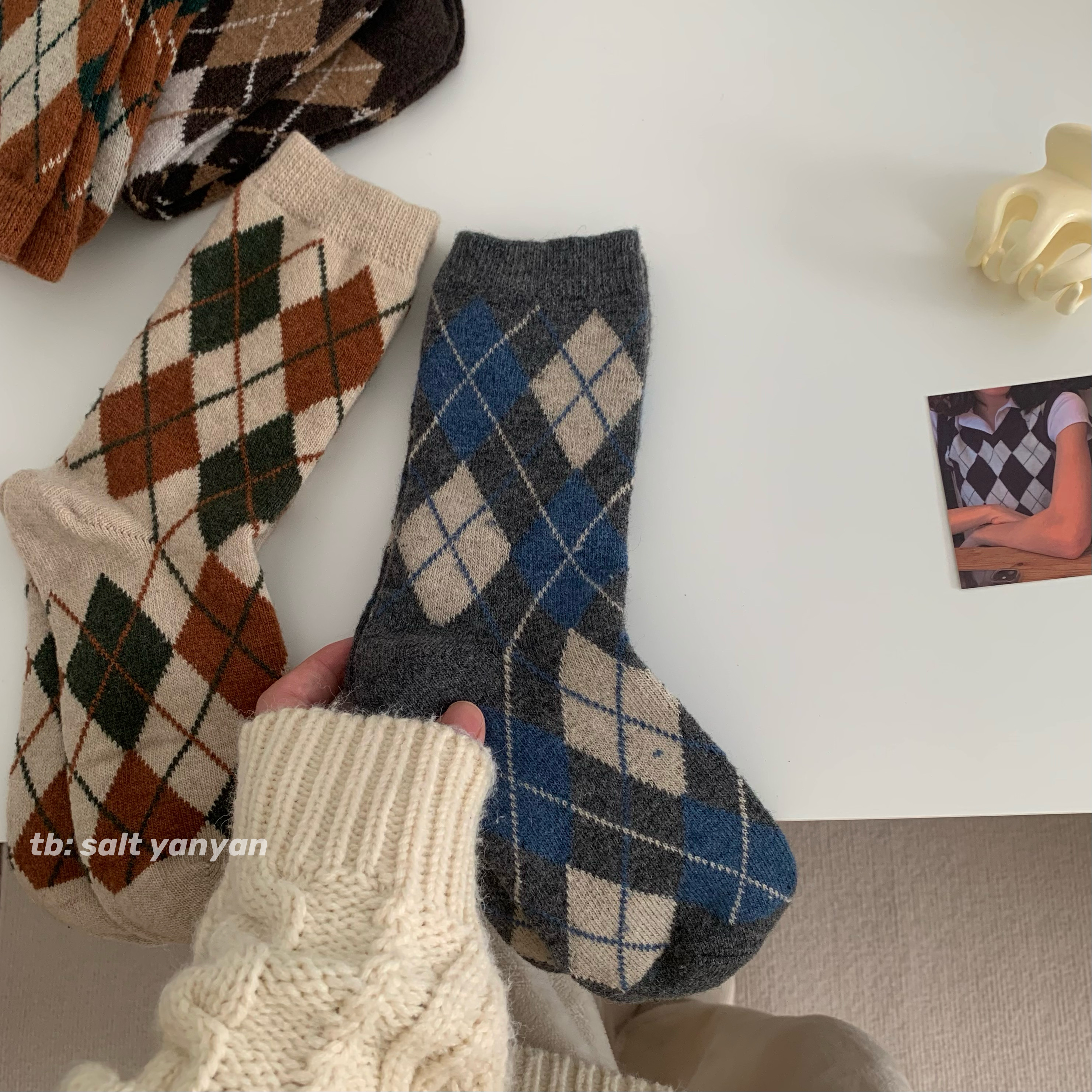 겨울용 레트로 울 마름모 무늬 중목 양말 여성용 두꺼운 보온 영국풍 플러시 여성 양말 마름모 패턴