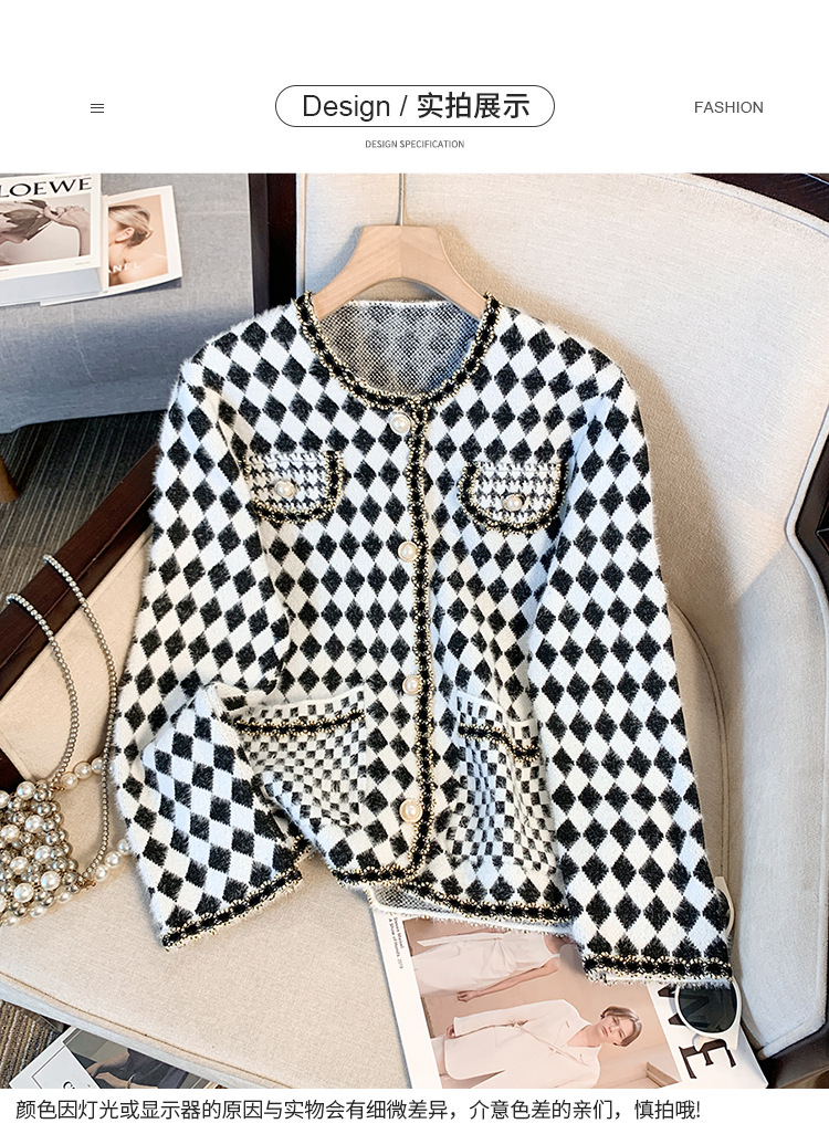 가을과 겨울 새로운 프랑스 스타일 마름모 니트 카디건 여성 디자인 샤넬 스타일 스웨터 코트스토어 가기