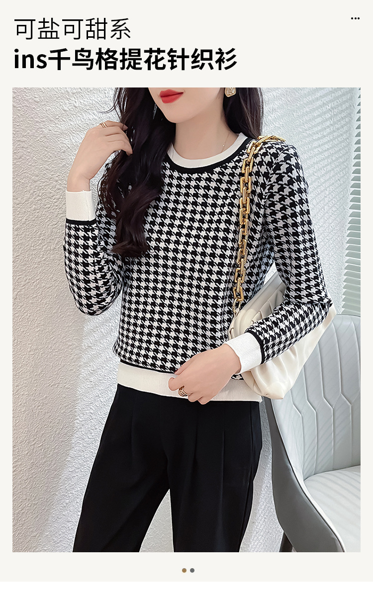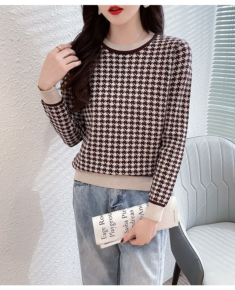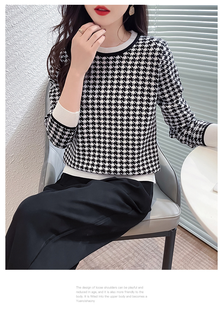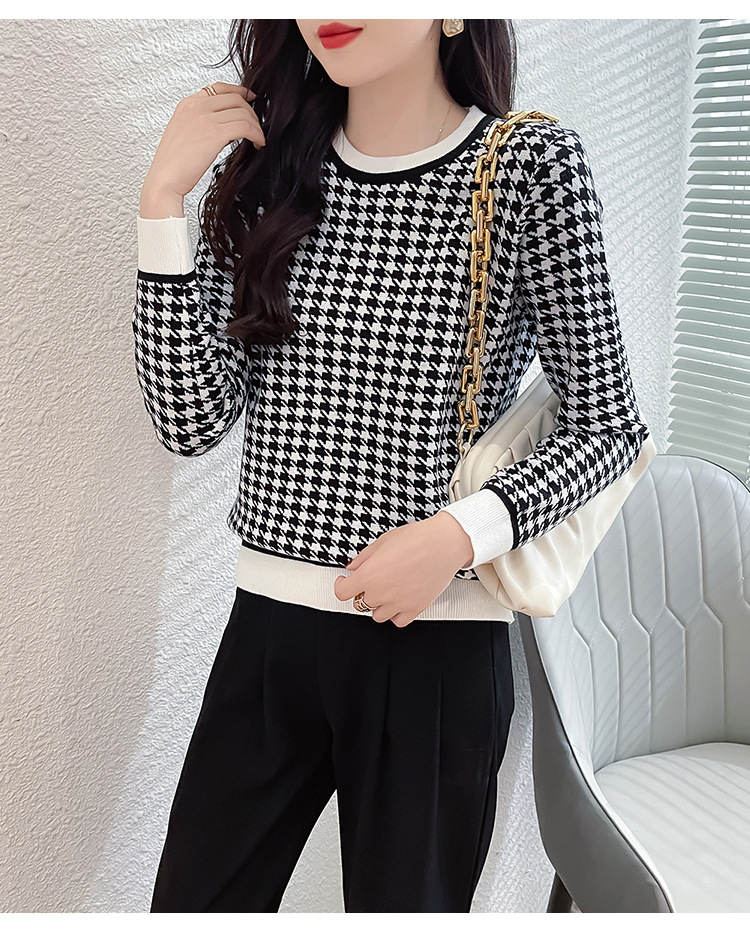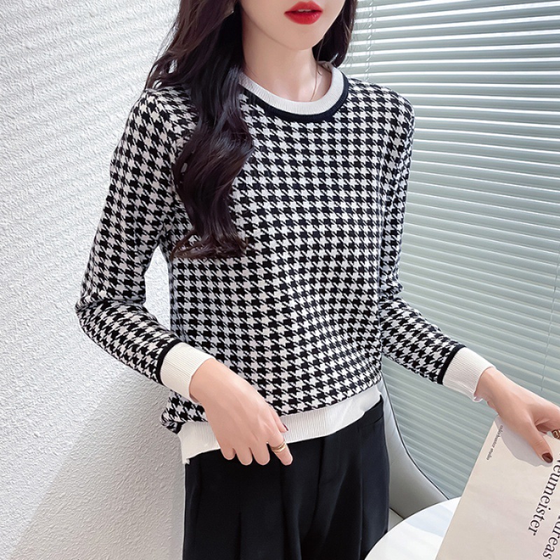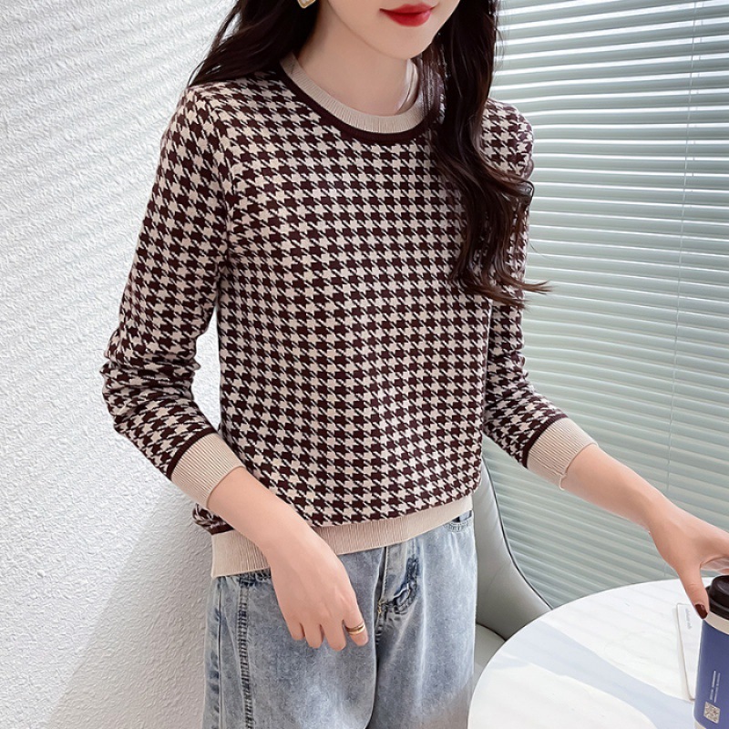가을과 겨울의 새로운 houndstooth 스웨터 여성용 한국식 느슨한 둥근 목 스웨터 고기 커버 탑스토어 가기