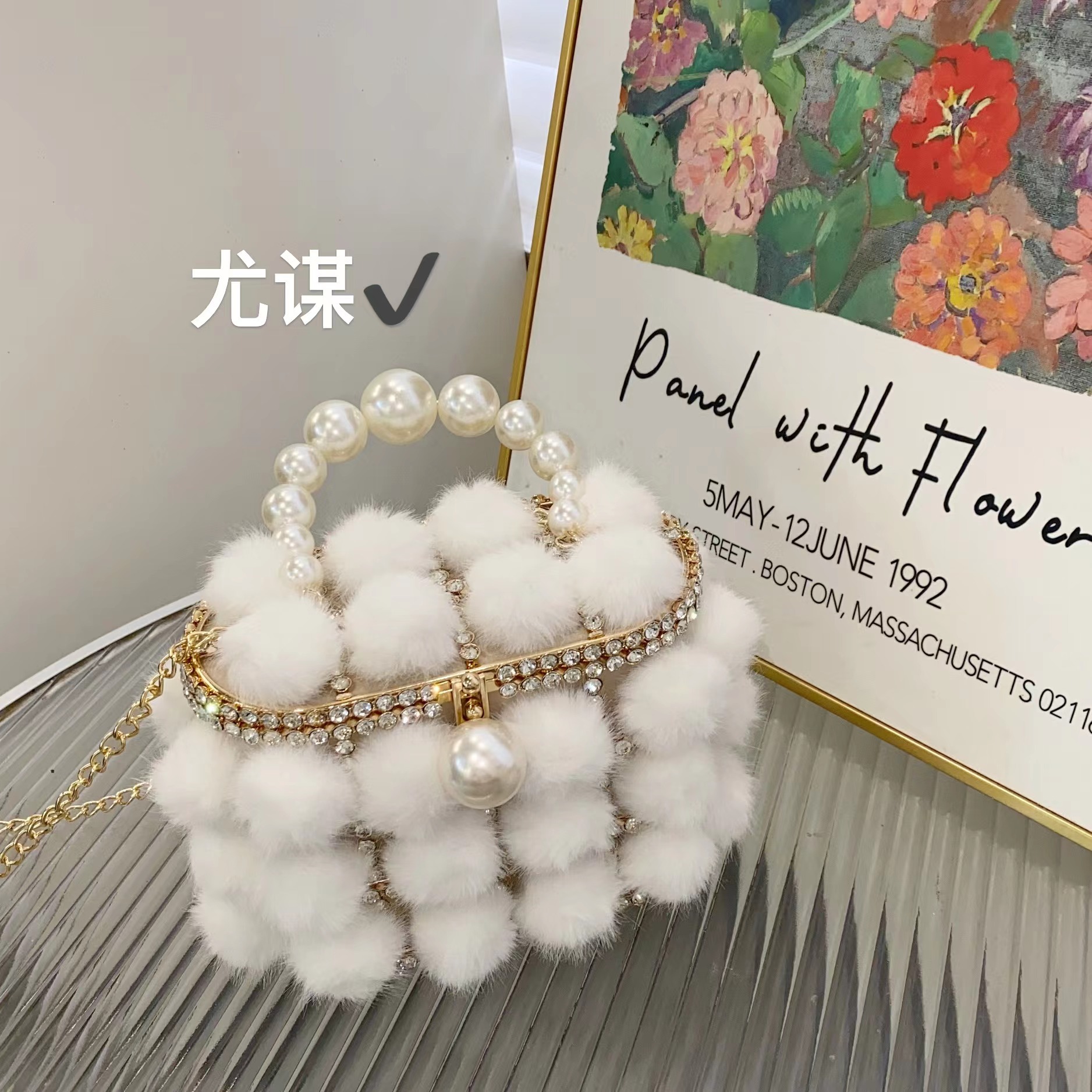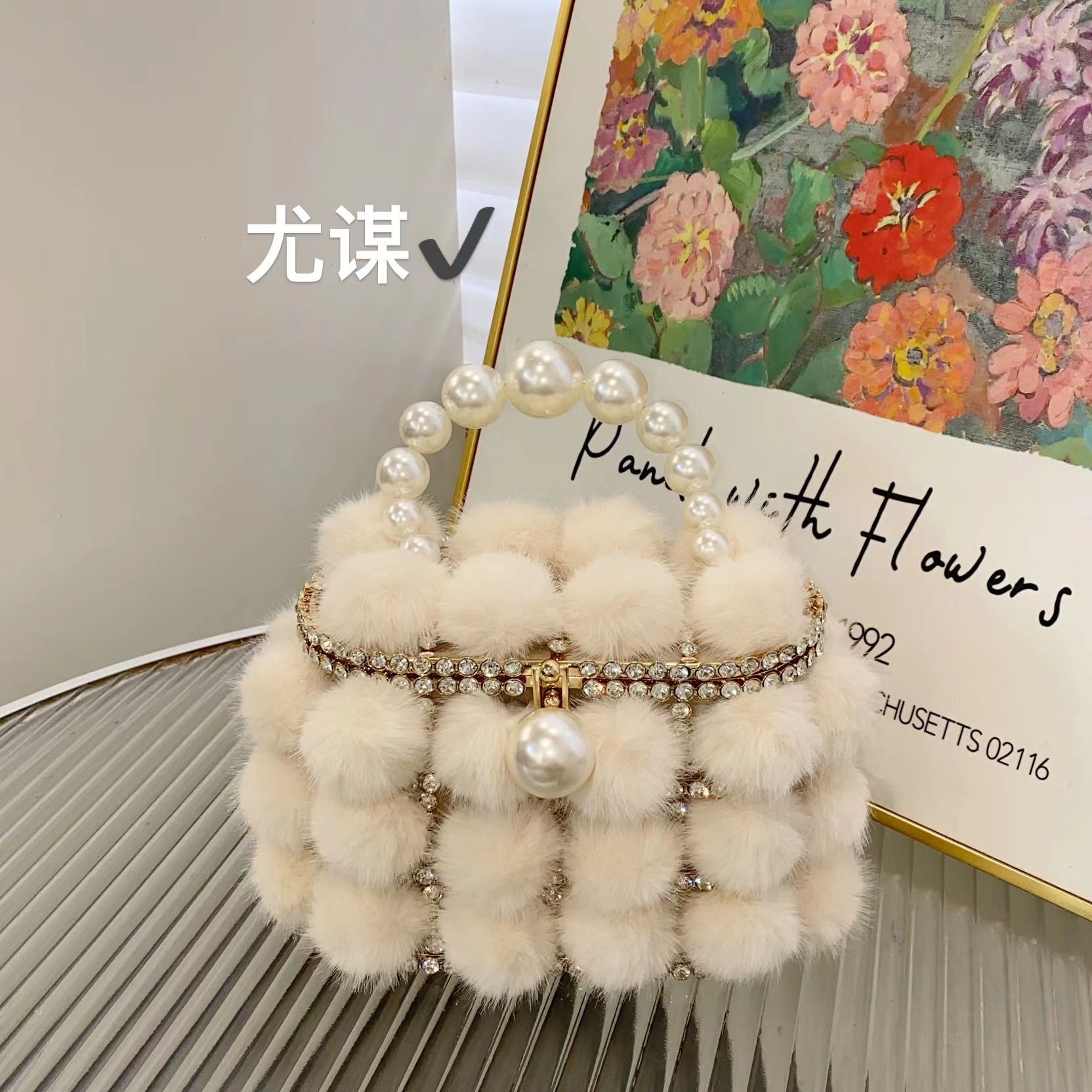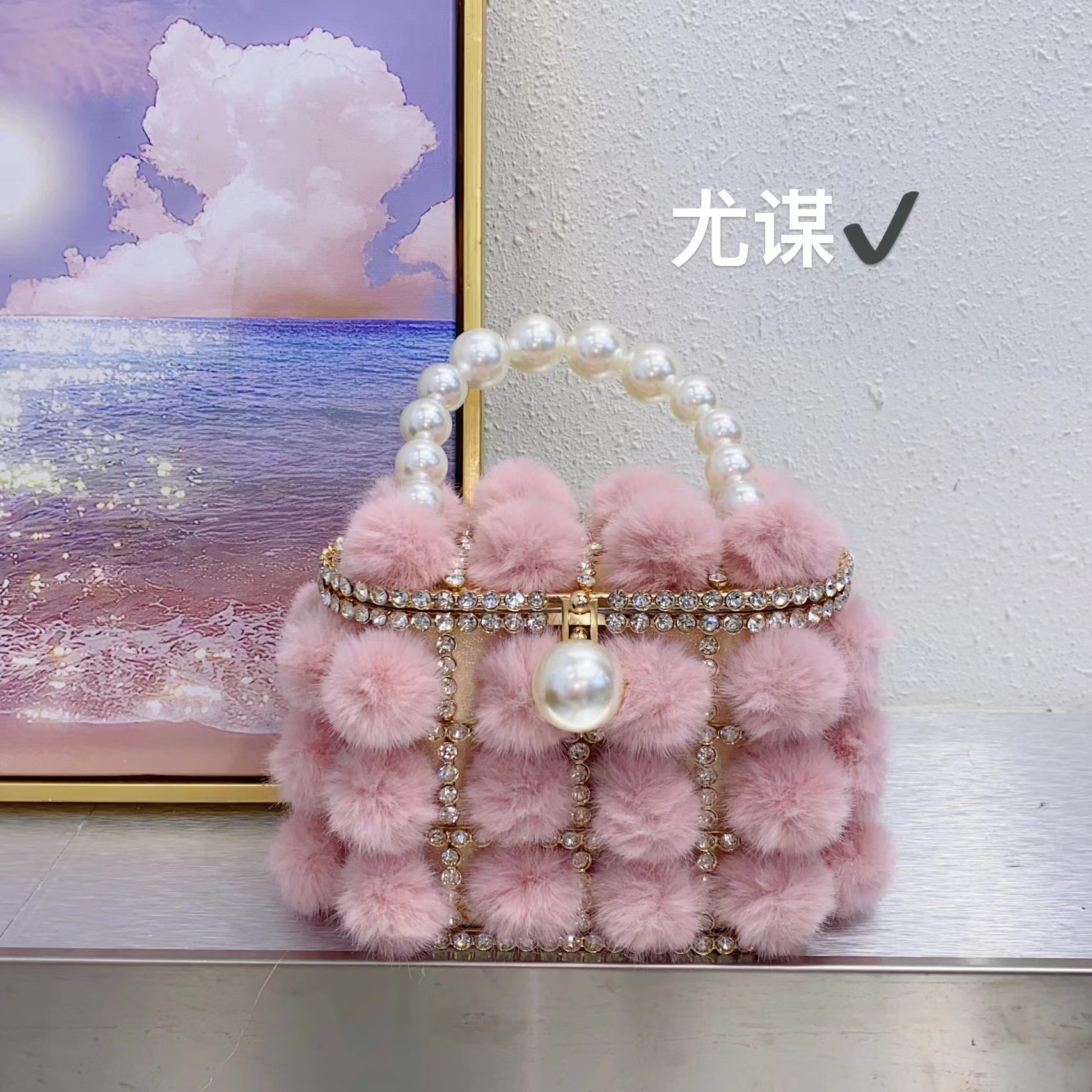 금속 진주 밍크 모피 야채 바구니 버킷 가방 연회 빛나는 라인스톤 봉제 새장 손 크로스 백