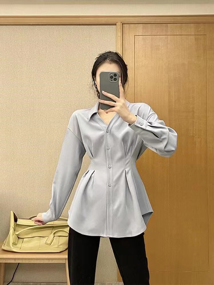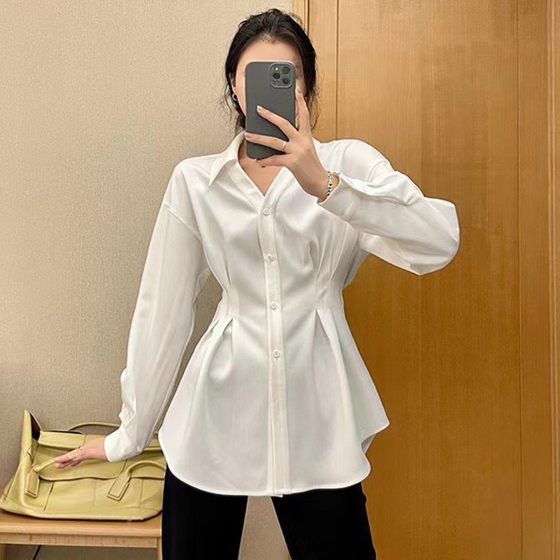 가벼운 럭셔리 셔츠 여성의 프랑스 스타일 가을과 겨울 중간 길이 디자인 감각 플러스 사이즈 슬리밍 허리 타이트 셔츠 긴 소매 우아한 탑 여성스토어 가기