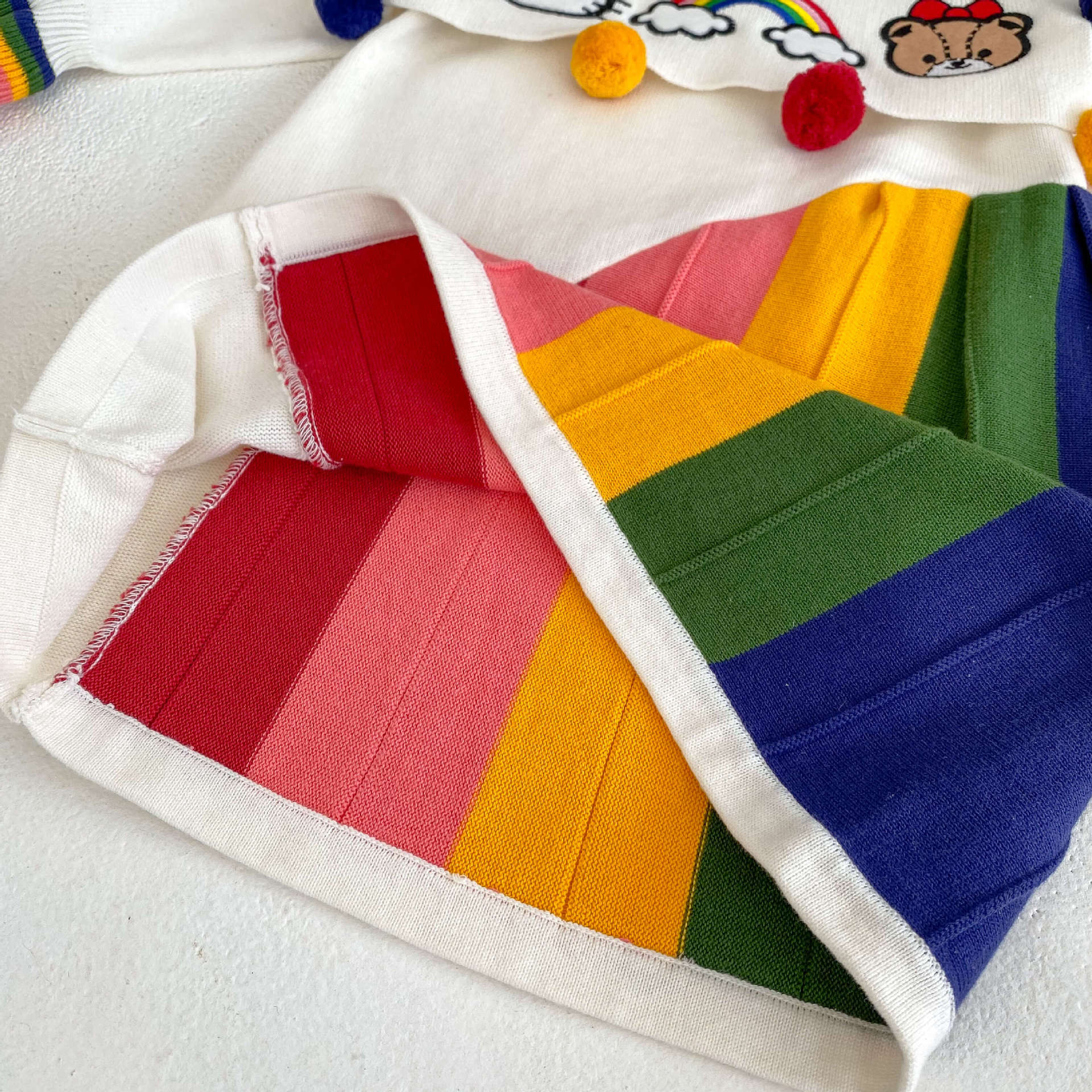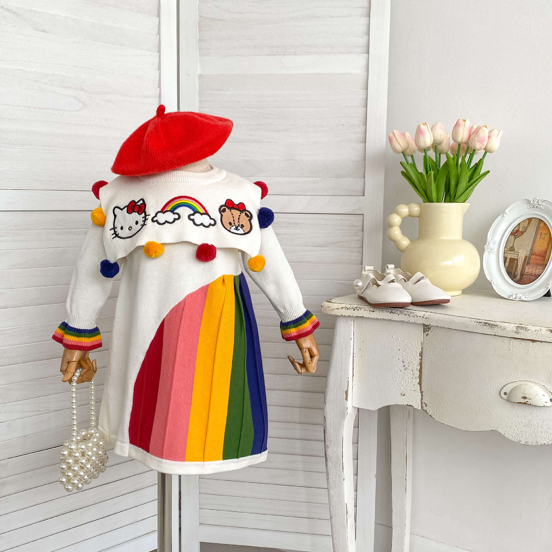 2024 소녀 가을 겨울 원피스 도파민 컬러 KT 고양이 스웨터 원피스 옷깃 모피 공 긴 소매 니트 스커트